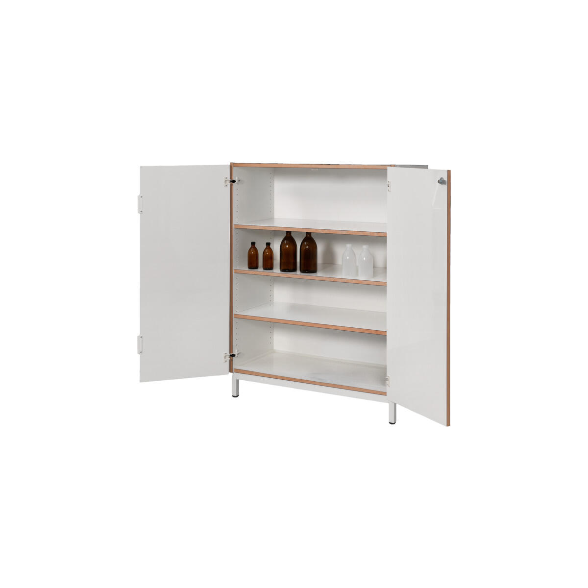 3 flyttbare hyller med oppbrettede kanter og lukkede hjørner for å hindre avrenning ved søl. Hyllekapasitet: 75 kg jevnt fordelt belastning. Skapet er utstyrt med ventilasjonskanal med avtrekkspunkter som sørger for ventilasjon mellom alle hylleplan. Avtrekksstuss på skapets tak (Ø 100 mm).