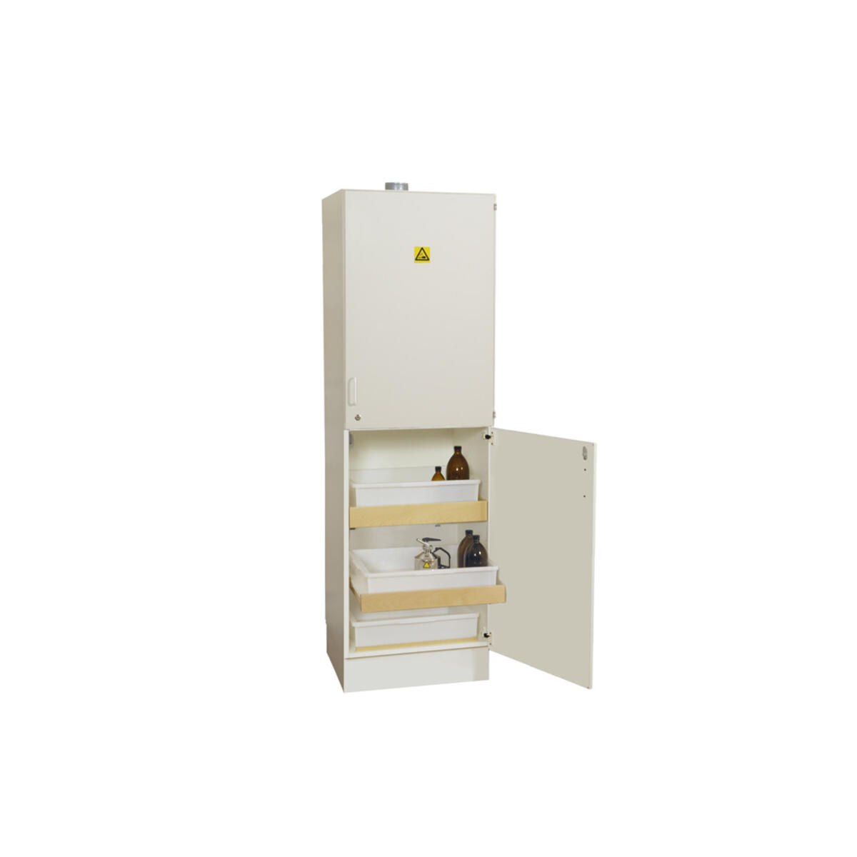 Ventilert skap for syrer og baser, delt inn i to seksjoner for separat oppbevaring av syrer og baser. Skapet er produsert i høytrykkslaminat. Understell i pulverlakkert metall (H 15 cm). 6 flyttbare hyller, 4 er uttrekkbare samt 6 skuffer i polypropylen (18 liter). Skuffene kan løftes ut av skapet. Hyllekapasitet: 50 kg jevnt fordelt belastning. Avtrekksstusser i toppen på begge sider (Ø 100 mm). Skapet leveres med ASSA‑sylinderlås med to nøkler (montert ved levering). OBS! Etsende stoffer skal plasseres under øyehøyde. Skapet er testet i henhold til EN 16121:2013.