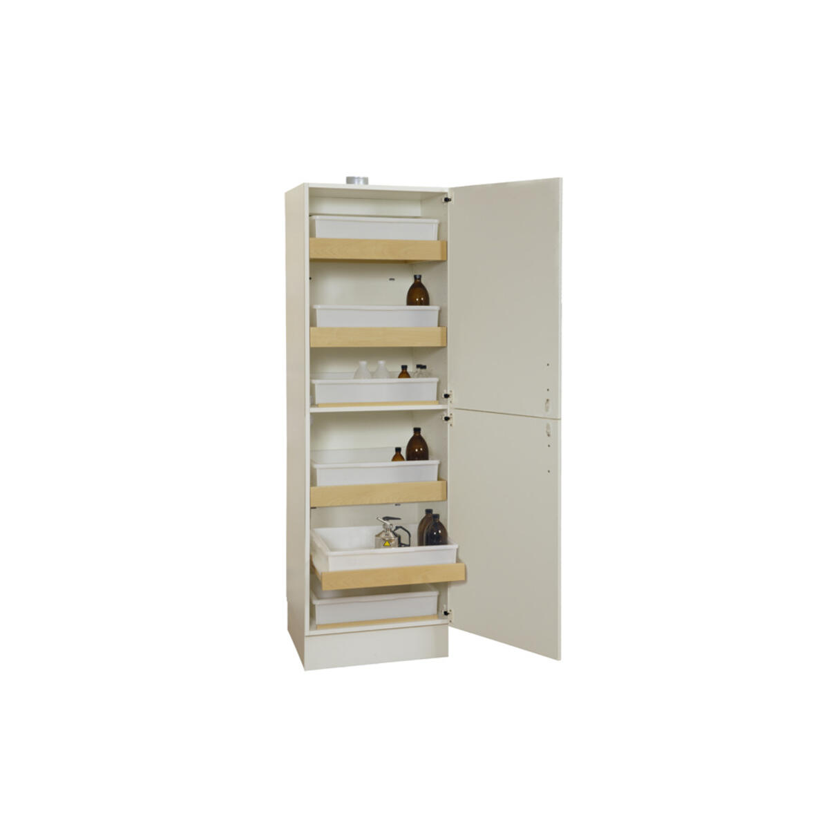 Ventilert skap for syrer og baser med glassdører, delt inn i to seksjoner for separat oppbevaring av syrer og baser. Skapet er produsert i høytrykkslaminat. 6 hylleplan, hvorav 4 er uttrekkbare, samt 6 skuffer i polypropylen (18 liter). Skuffene kan løftes ut av skapet. Hyllekapasitet: 50 kg jevnt fordelt belastning. Ventilasjonskanal i bakvegg og tilkoblingsstuss i toppen (Ø 100 mm). Skapet leveres med ASSA‑sylinderlås med to nøkler (montert ved levering).