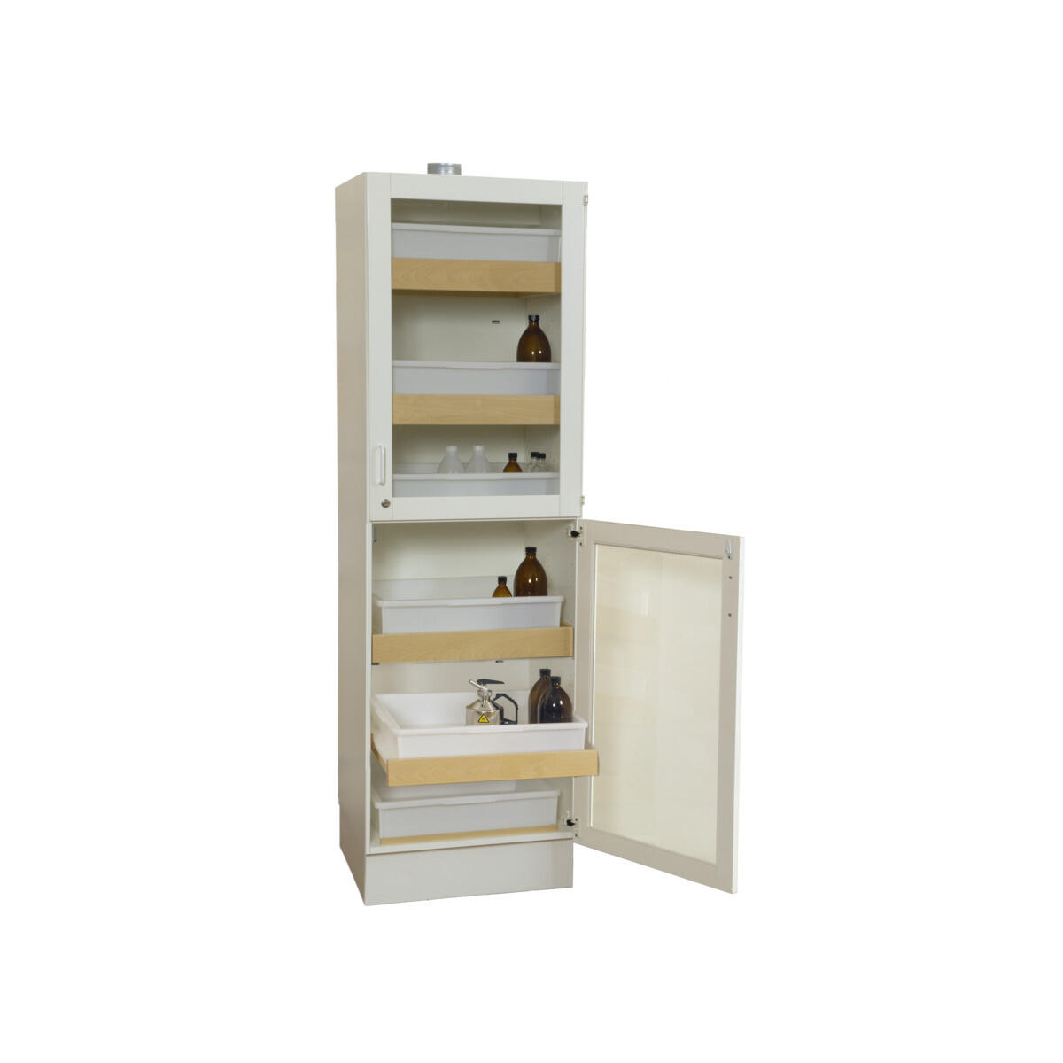 Ventilert skap for syrer og baser med glassdører, delt inn i to seksjoner for separat oppbevaring av syrer og baser. Skapet er produsert i høytrykkslaminat. 6 hylleplan, hvorav 4 er uttrekkbare, samt 6 skuffer i polypropylen (18 liter). Skuffene kan løftes ut av skapet. Hyllekapasitet: 50 kg jevnt fordelt belastning. Ventilasjonskanal i bakvegg og tilkoblingsstuss i toppen (Ø 100 mm). Skapet leveres med ASSA‑sylinderlås med to nøkler (montert ved levering).