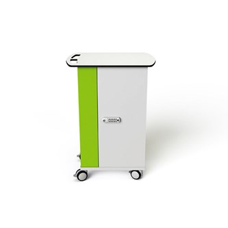 Ladestasjon for opptil 24 nettbrett eller annet utstyr. Har 2 hyller med skillevegger i stål. Hvert rom måler B35xD380xH270mm. Materiale: Kaldvalset stål av høy kvalitet, tykkelse 0,8 mm. Utstyrt med 2 vifter med sensor og oppheng for ledning på siden. Skapet kan låses og leveres med 2 nøkler. Ladeskapet har to låsbare hjul. Mål: B53xD53,5xH84.