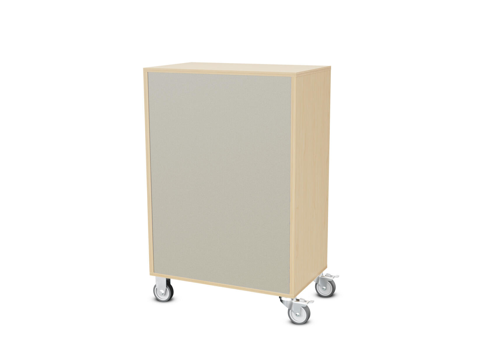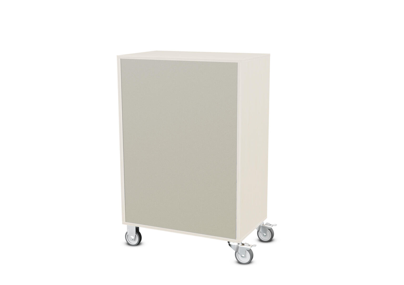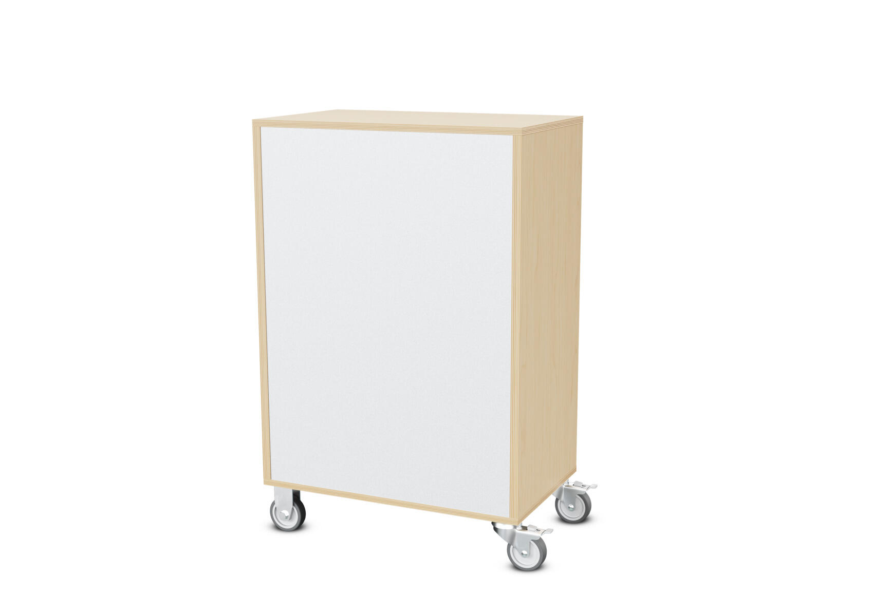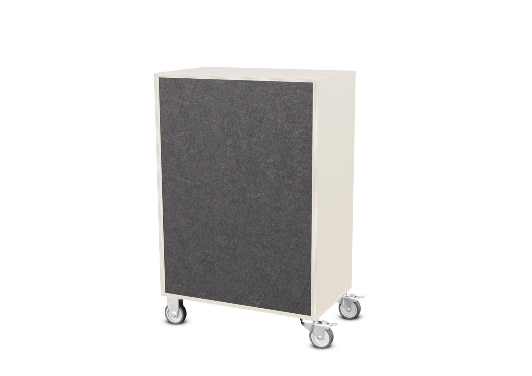 Denne oppbevaringen er et utmerket valg for å skape romdelere i åpne miljøer. Takket være muligheten til å velge ulike ryggalternativerr – whiteboard, speil, oppslagstavle, flanellograf eller lydabsorbent – kan den tilpasses etter behov og funksjon. Hjulene gjør oppbevaringen fleksibel og lett å flytte. Faste skillevegger. Fire hjul, hvorav 2 faste og 2 bevegelige med brems.