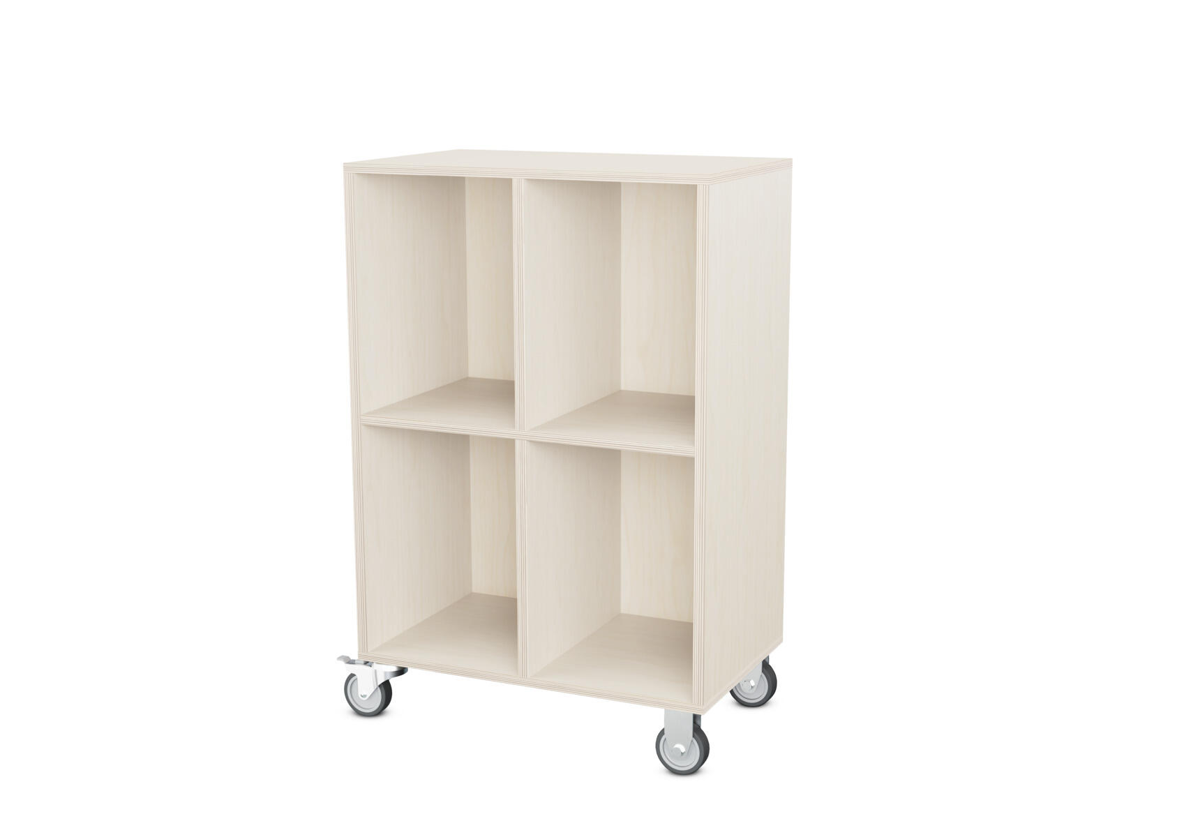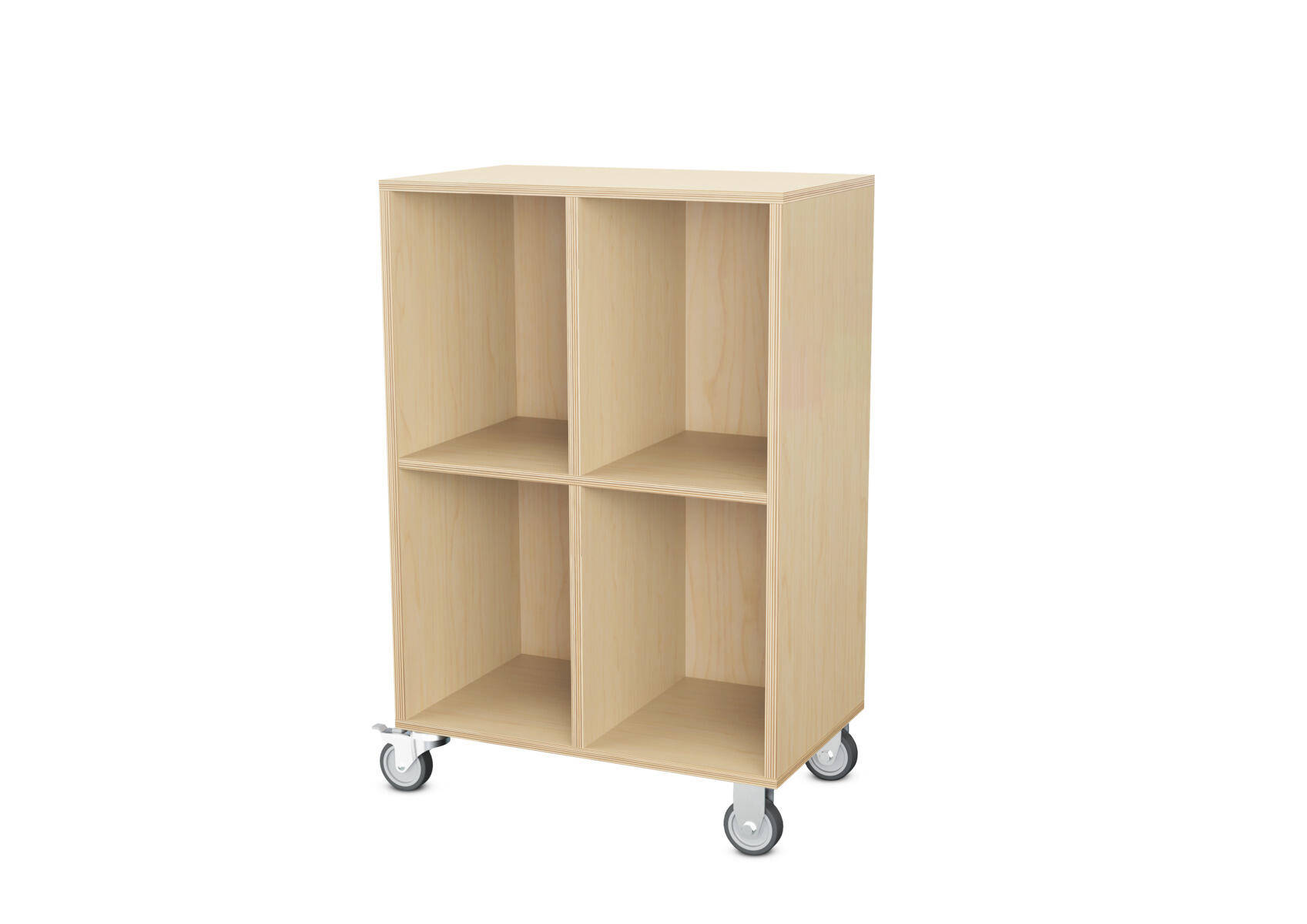Ferdigbygd oppbevaring med fire rom. Skillevegg og hylle er faste. Fire hjul, hvorav 2 bevegelige med brems. De to andre er faste, noe som gjør oppbevaringen stabil ved flytting. Enkel montering av hjul. Svanemerket, lisensnummer 5031 0099.