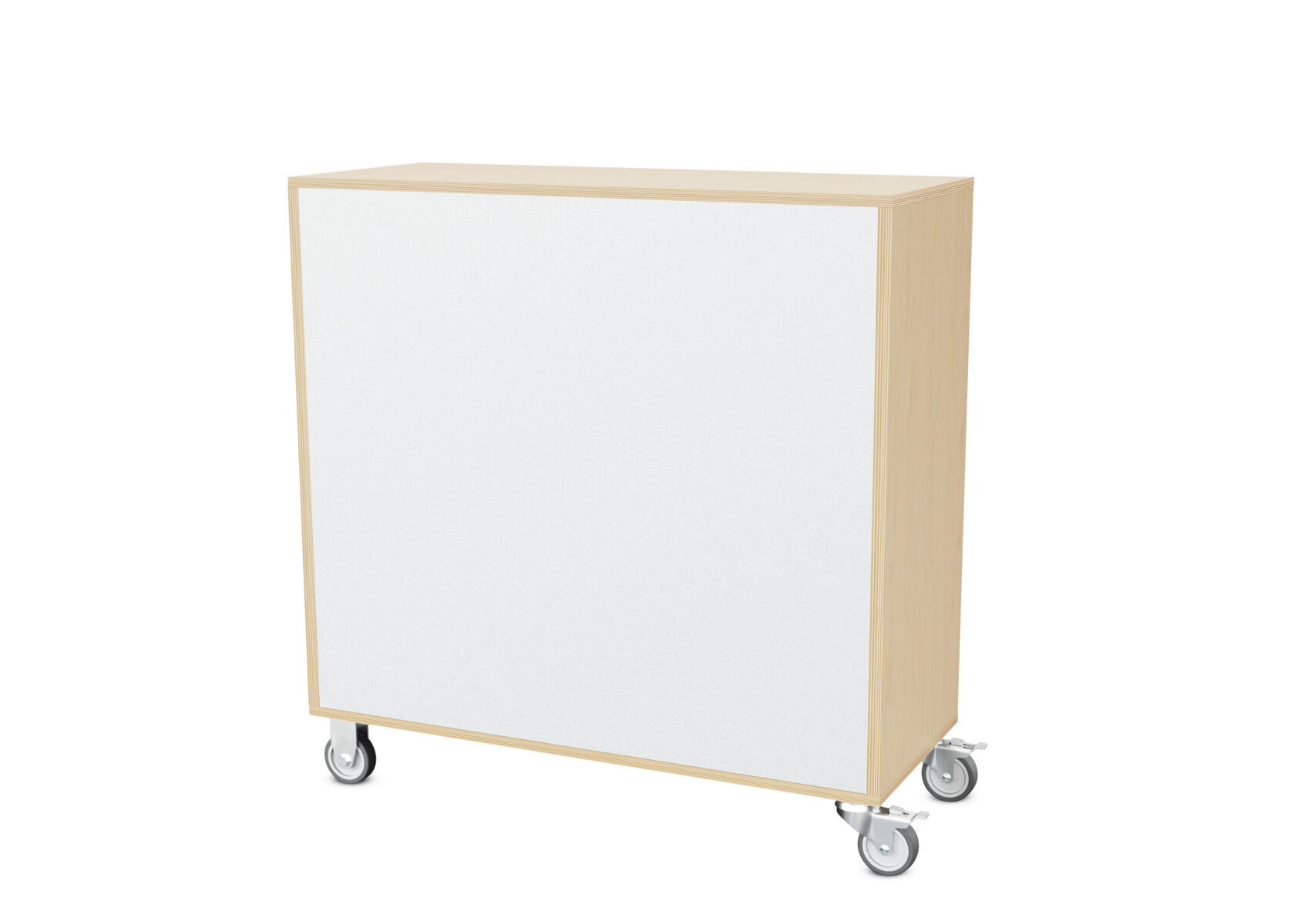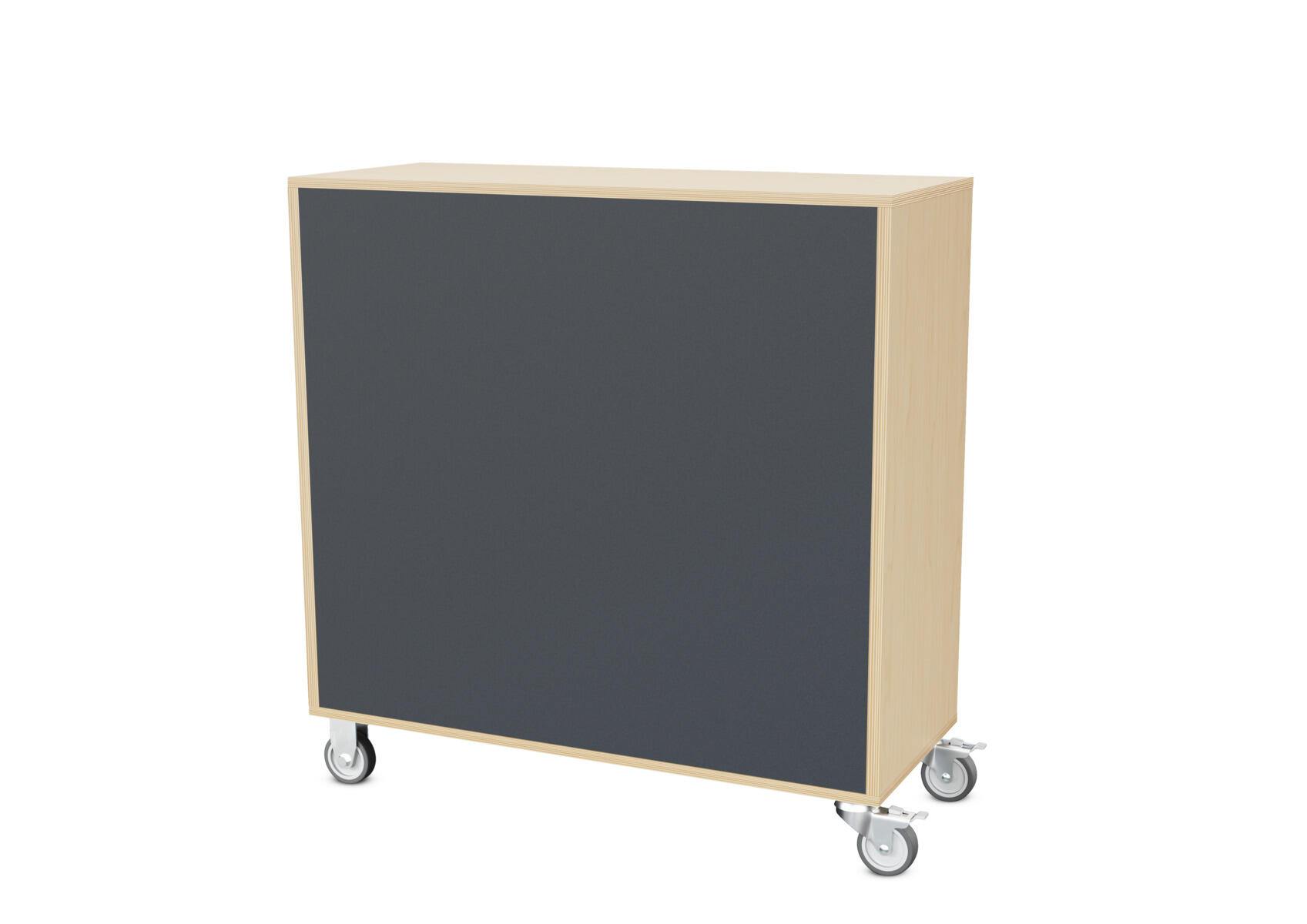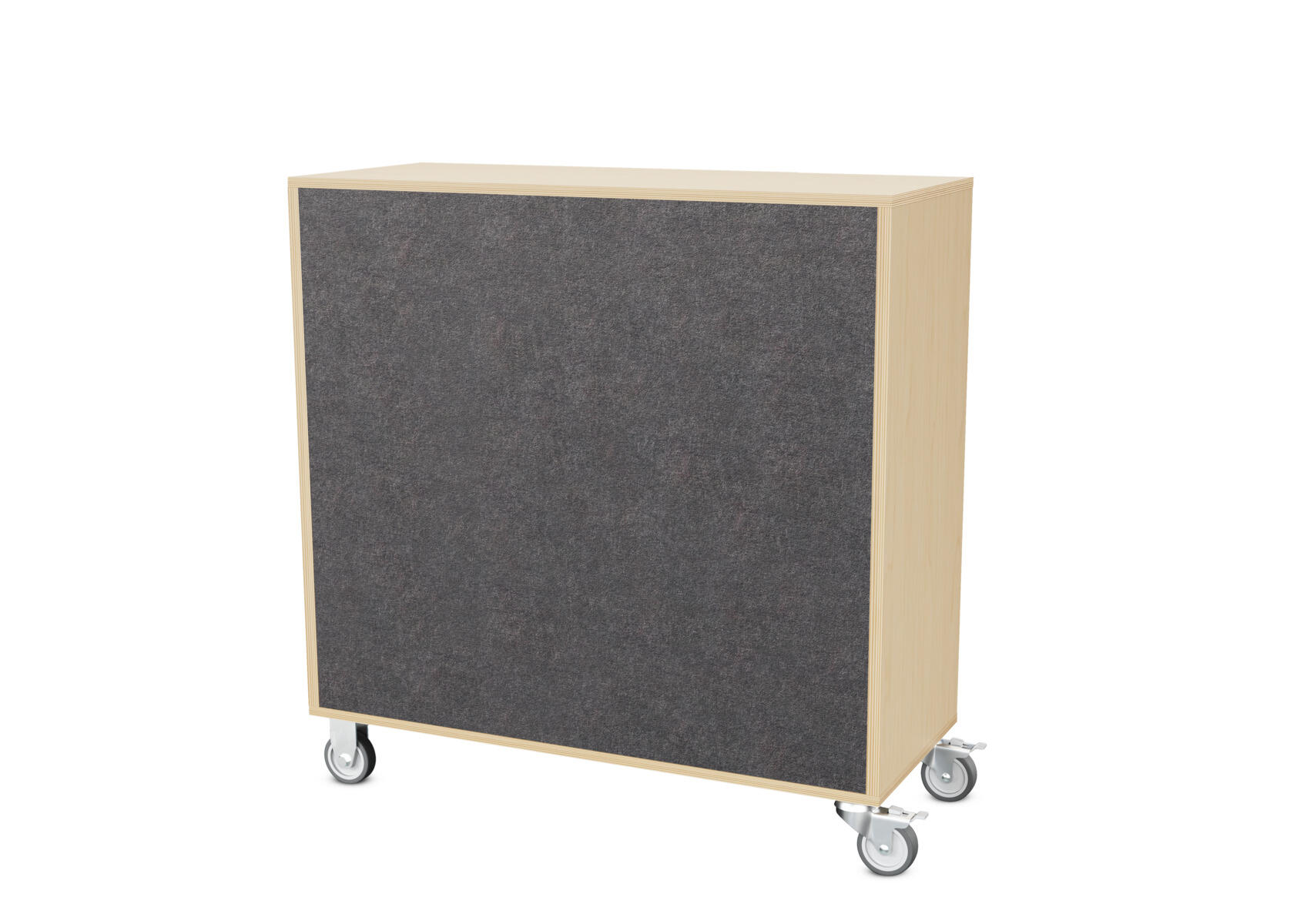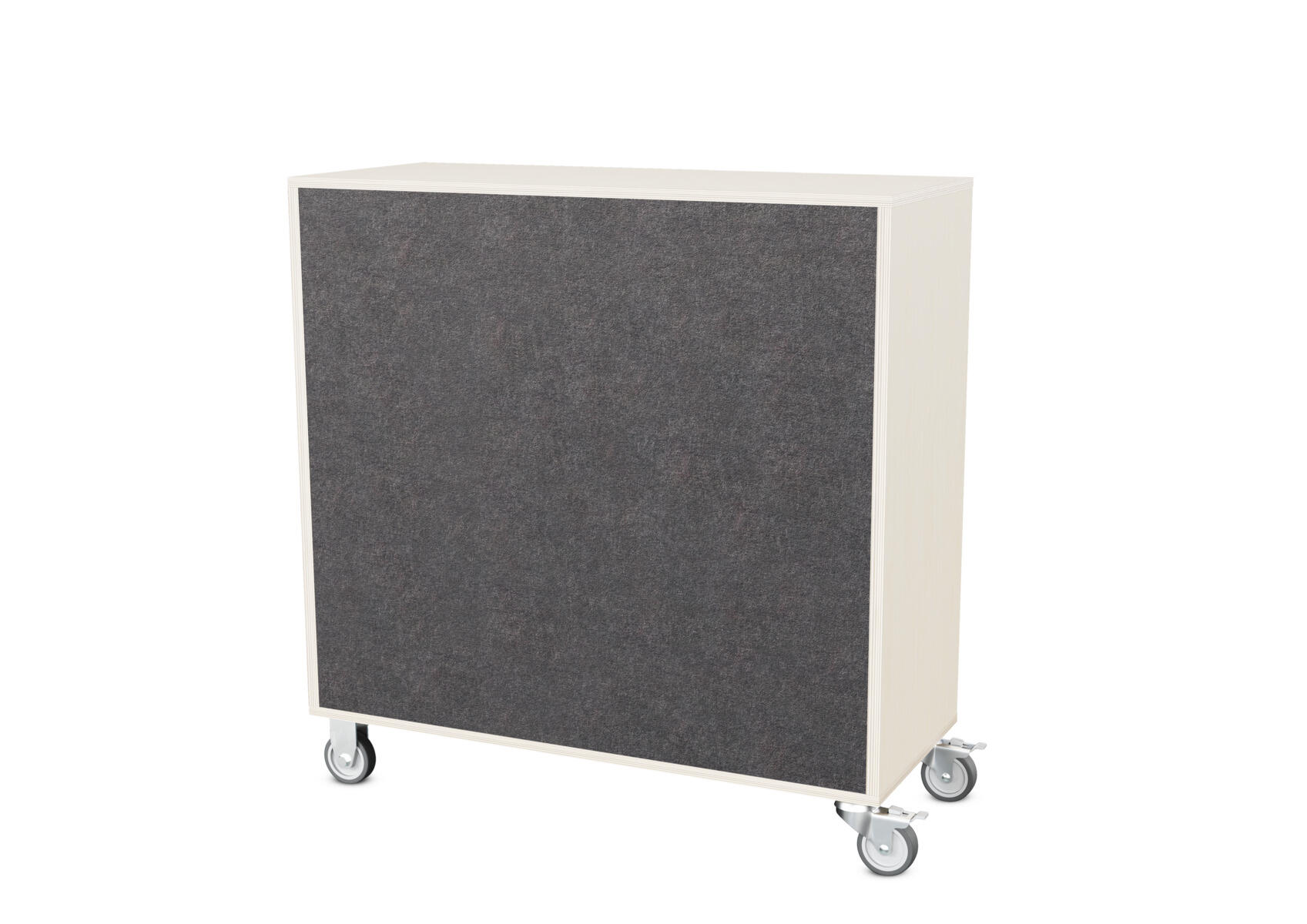 Denne oppbevaringen er et utmerket valg for å skape romdelere i åpne miljøer. Takket være muligheten til å velge ulike ryggalternativerr – whiteboard, speil, oppslagstavle, flanellograf eller lydabsorbent – kan den tilpasses etter behov og funksjon. Hjulene gjør oppbevaringen fleksibel og lett å flytte. Faste skillevegger. Fire hjul, hvorav 2 faste og 2 bevegelige med brems.