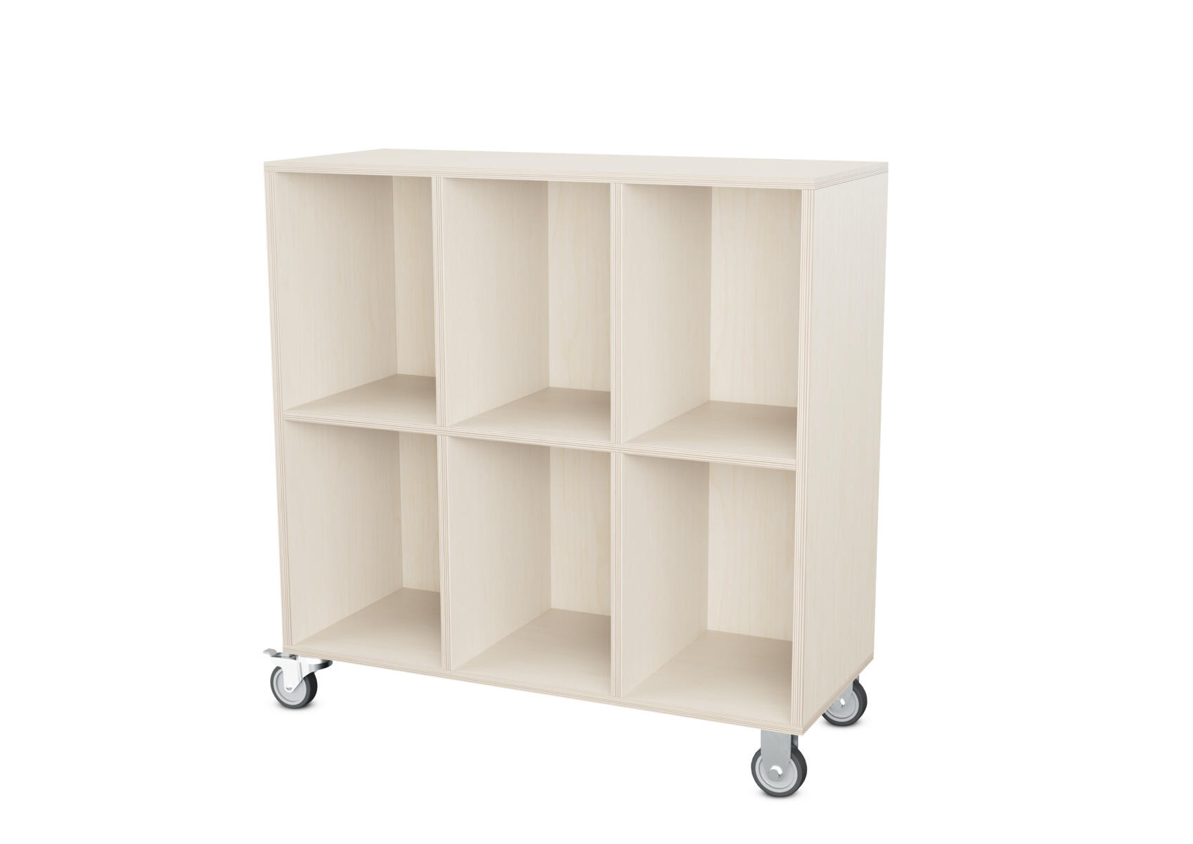 Lav ferdigbygd oppbevaring med tre brede rom. Skilleveggene er faste. Fire bevegelige hjul med bremser. Enkel montering av hjul. Svanemerket, lisensnummer 5031 0099.