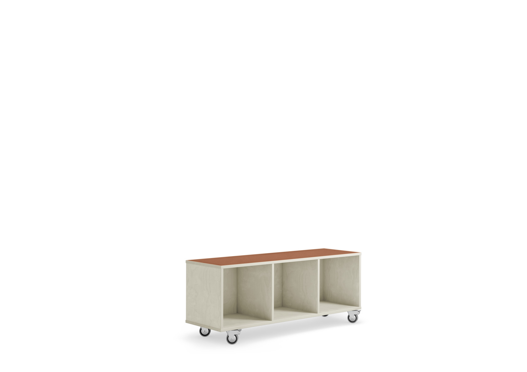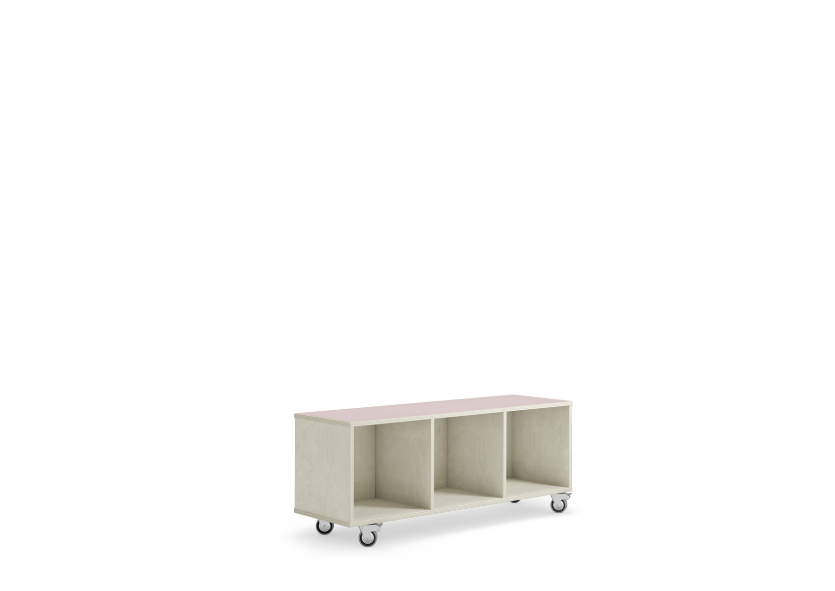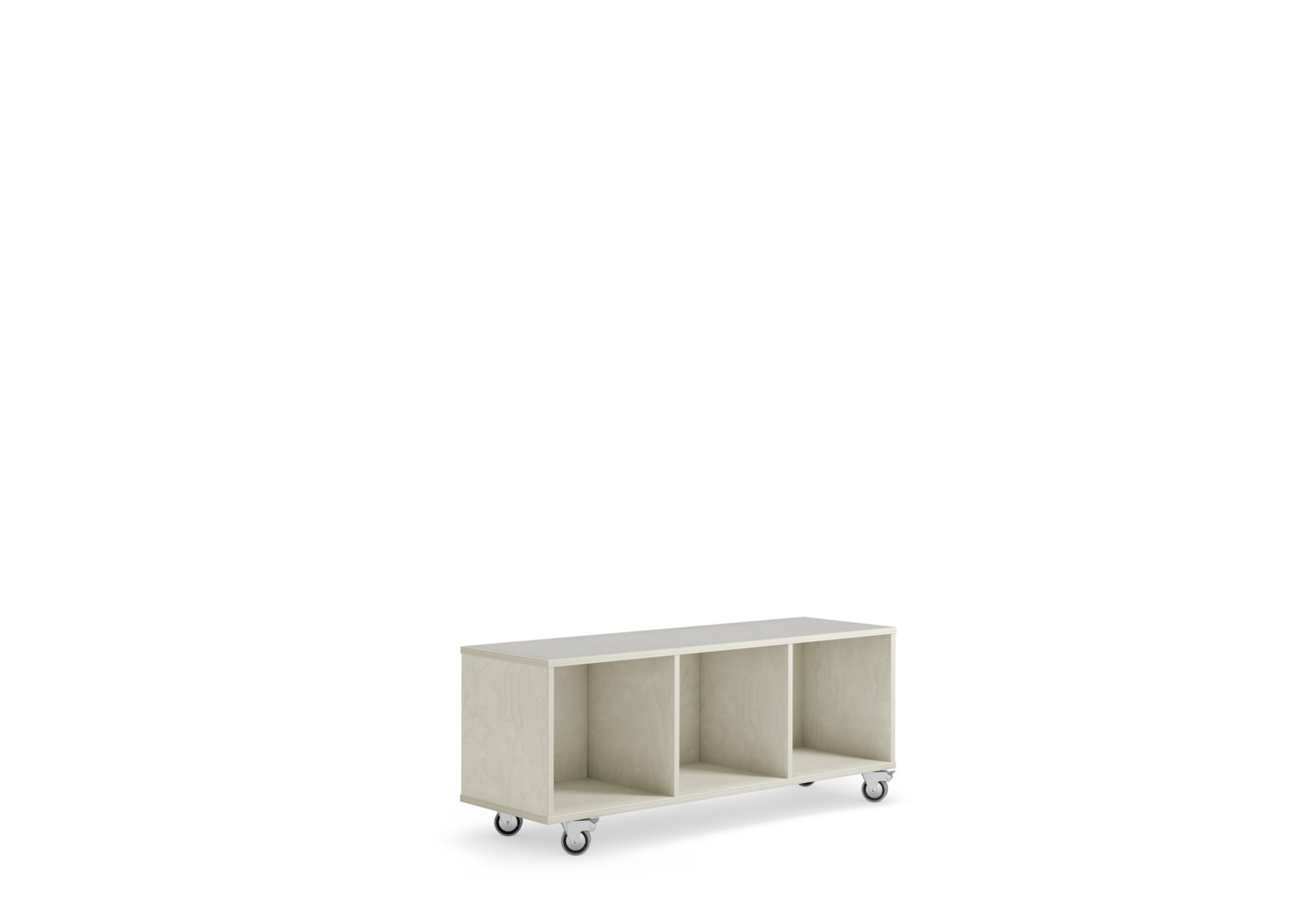 Laget av bjørkekryssfiner av høyeste kvalitet. Velg farge for høytrykkslaminat på toppen. Leveres med 4 bevegelige hjul, 2 låsbare. Forborede hull for enkel montering av hjul. Tippefaren kan reduseres ved at hjulene rettes forover og bakover og låses i denne posisjonen. Hvis hyllen skal brukes som romdeler eller frittstående, anbefaler vi bruk av støtteben. Oppbevaringkasser er tilgjengelig som ekstrautstyr, både i bjørkefiner eller flettede kurver. Mål: 119x38x50 cm. Montert. Svanemerket, lisensnummer 5031 0099.