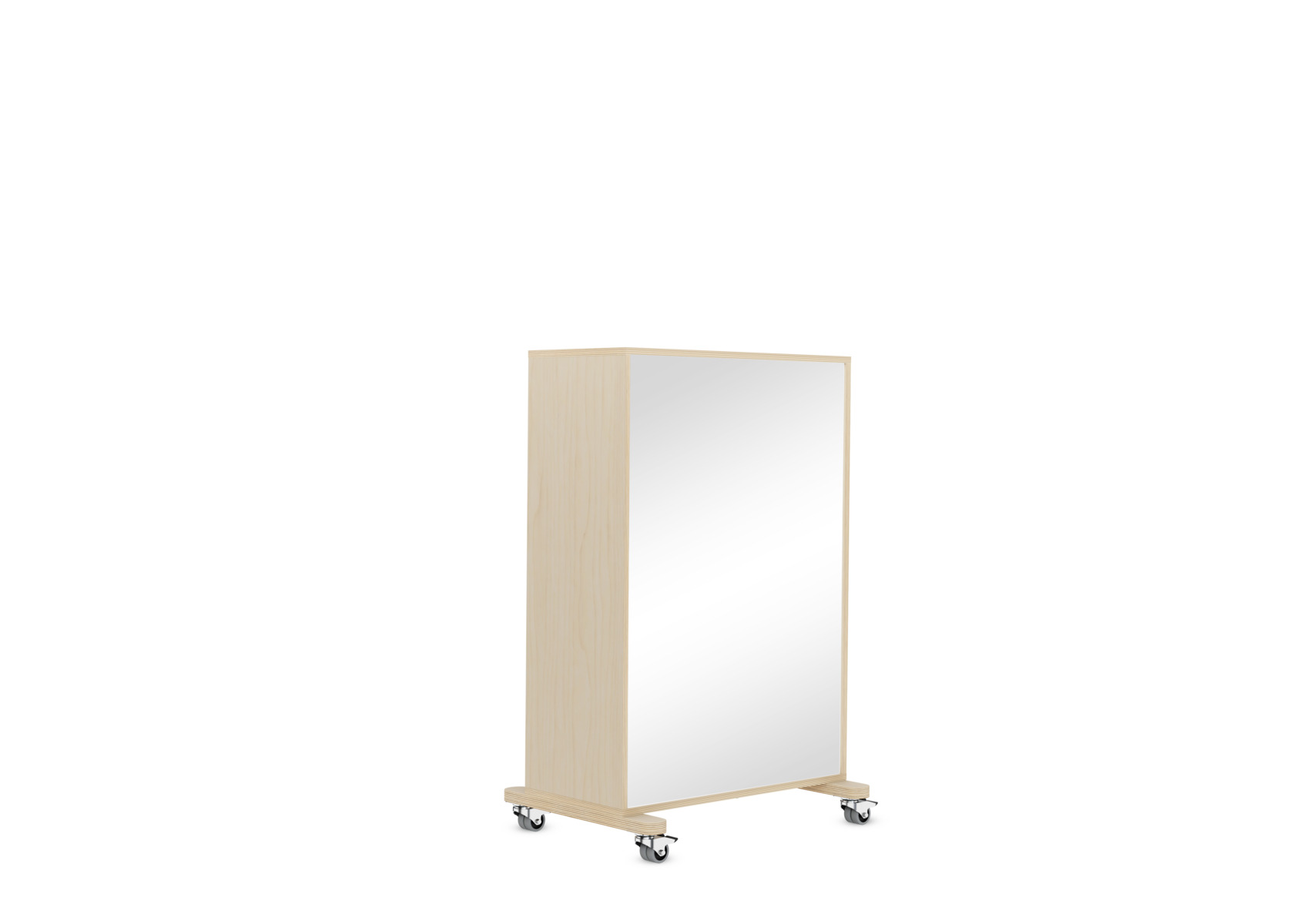 Oppbevaring med speilrygg. Laget av bjørkekryssfiner av høyeste kvalitet. 2 faste hjul på den ene kortsiden og 2 bevegelige, låsbare hjul på den andre. Forborede hull for enkel montering av hjul. Mobile enheter gir økt fleksibilitet og mulighet til enkelt å endre romoppsettet. Unngå å plassere tunge gjenstander høyt oppe på hyllen. Reduser risikoen for velting ved å styre hjulene forover eller bakover og låse hjulene. Den valgte fargen er høytrykkslaminat på toppen av oppbevaringsenheten. Ved valg av bjørk er oppbevaringen helt i kryssfiner. Speil i akrylplast.