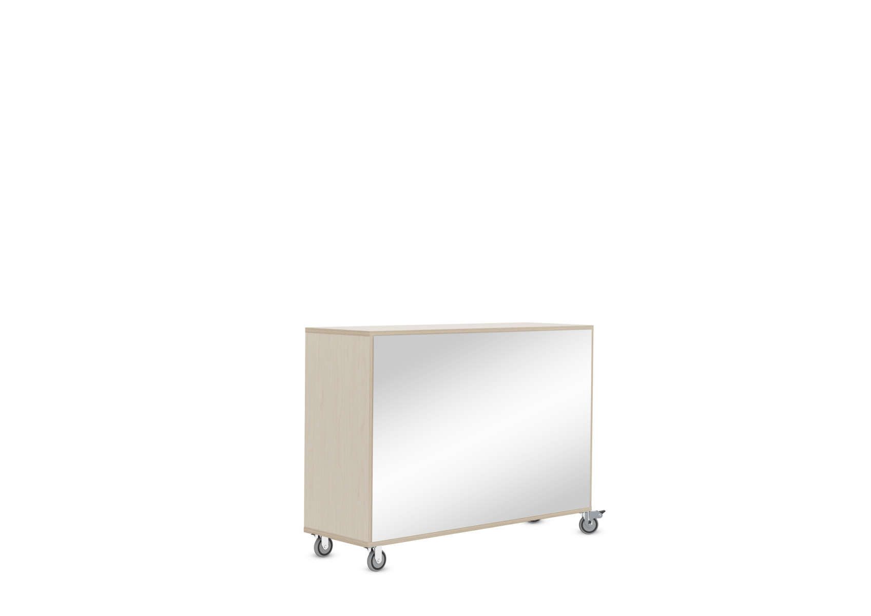 Oppbevaring med speilrygg. Laget av bjørkekryssfiner av høyeste kvalitet. 2 faste hjul på den ene kortsiden og 2 bevegelige, låsbare hjul på den andre. Forborede hull for enkel montering av hjul. Mobile enheter gir økt fleksibilitet og mulighet til enkelt å endre romoppsettet. Unngå å plassere tunge gjenstander høyt oppe på hyllen. Reduser risikoen for velting ved å styre hjulene forover eller bakover og låse hjulene. Den valgte fargen er høytrykkslaminat på toppen av oppbevaringsenheten. Ved valg av bjørk er oppbevaringen helt i kryssfiner. Speil i akrylplast.