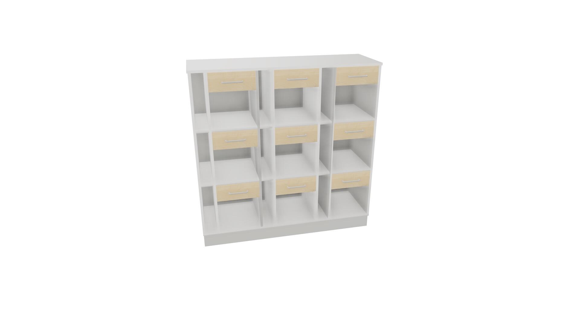Komplett elevreol på sokkel med stamme i direktelaminat. 9 skuffer, 9 rom og 9 smale rom. Skuffene er komplette med håndtak. Skuffefronter i direktelaminat eller høytrykkslaminat. Skuffenes innvendige mål: B244xD338xH72 mm. Hyllenes innvendige mål: B275xD376xH213 mm, permhylle B82xD376xH326 mm.