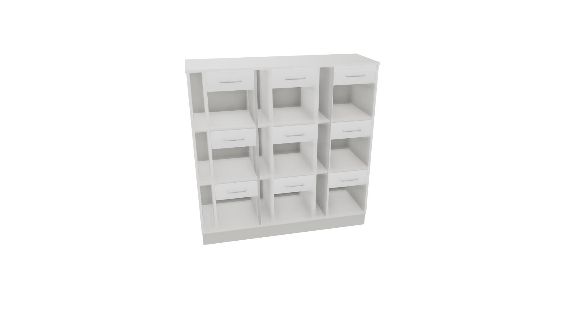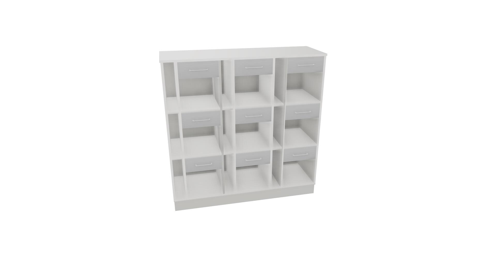 Elevreol i direktelaminat. Med 6 rom og 6 små skuffer. Skuffefronter i direktelaminat eller høytrykkslaminat. Kompletteres med sokkel eller hjulplate. Kan også kompletteres med tette dører (80685)