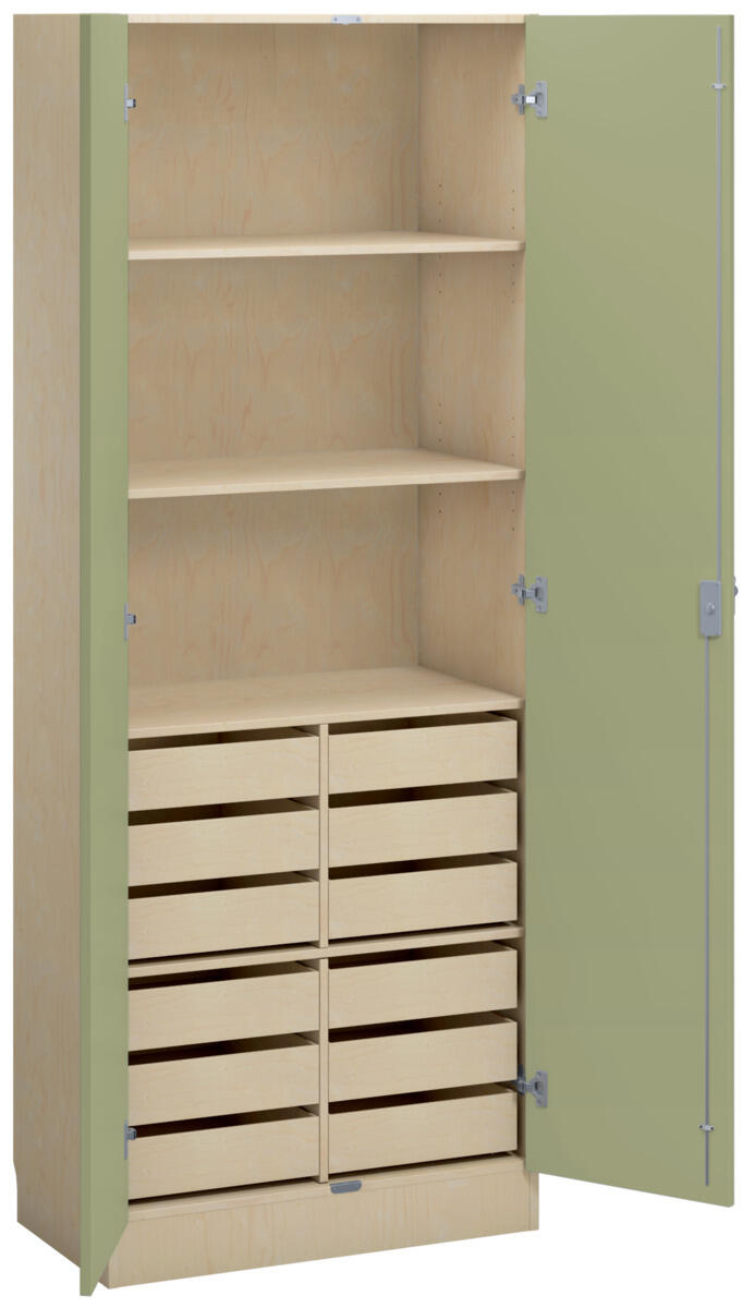 Materialskap med stamme i direktelaminat. Fronter i direktelaminat eller høytrykkslaminat. Inneholder 3 hyller og 12 skuffer. 2 tette dører med espanjolett (inkl. 2 nøkler). Dørene kan åpnes i 170° vinkel og må åpnes i mer enn 90° for å åpne skuffene.