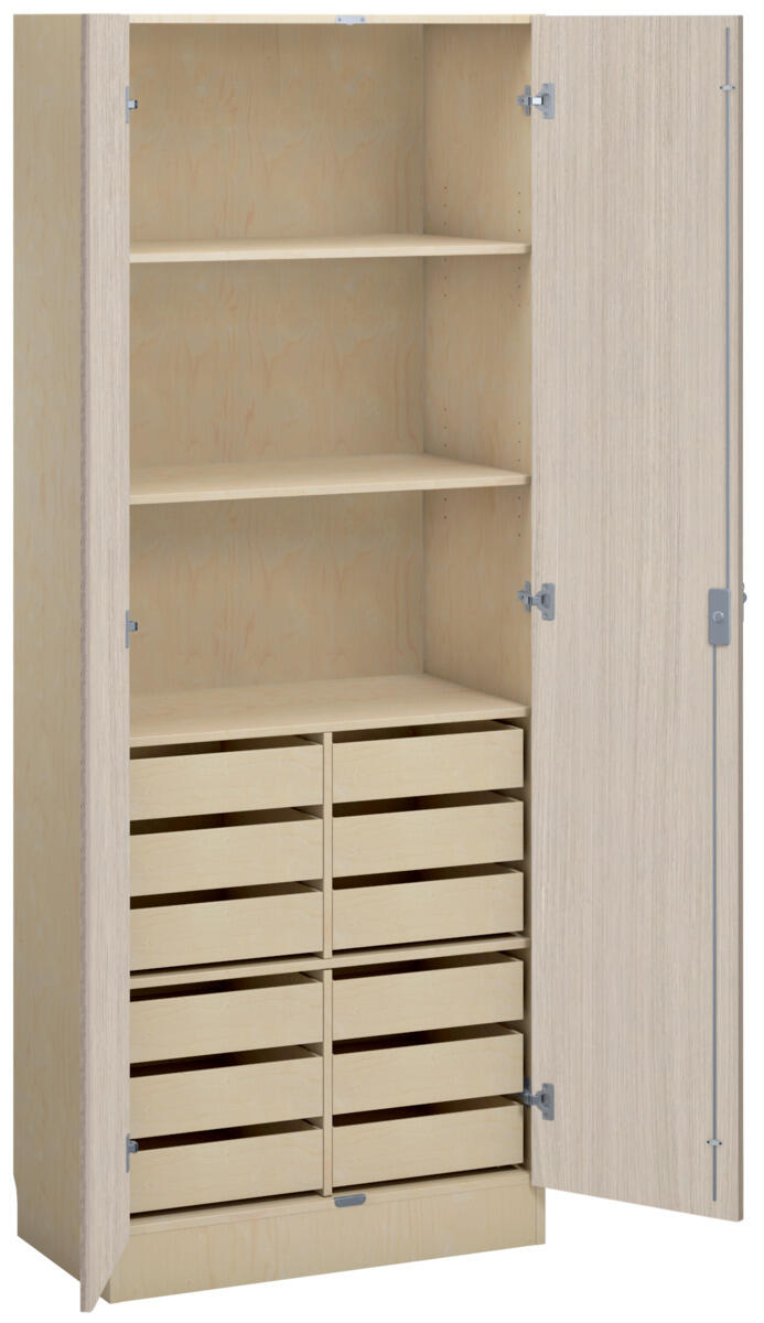 Materialskap med stamme i direktelaminat. Fronter i direktelaminat eller høytrykkslaminat. Inneholder 3 hyller og 12 skuffe. Tette dører med espanjolett (inkl. 2 nøkler). Dørene kan åpnes i 170° vinkel. Skuffenes innvendige mål: B34xD39xH4 cm.