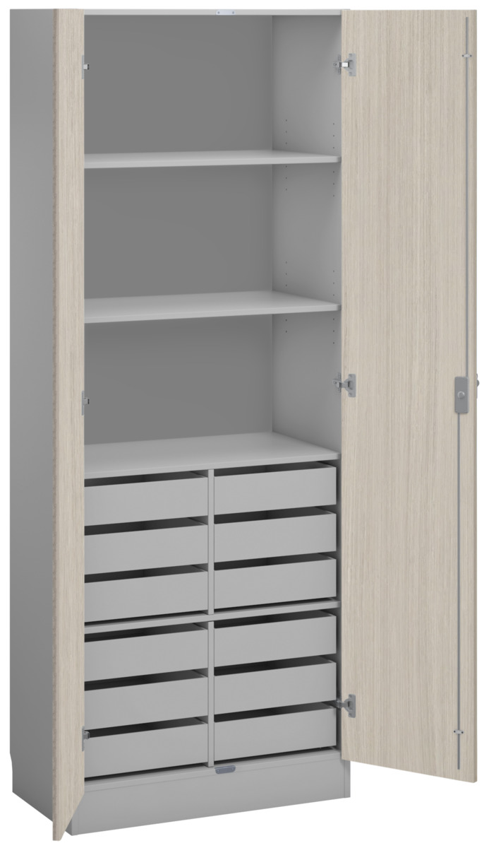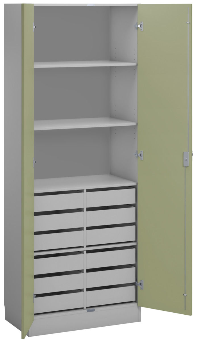 Materialskap med stamme i direktelaminat. Fronter i direktelaminat eller høytrykkslaminat. Inneholder 3 hyller og 12 skuffer. 2 tette dører med espanjolett (inkl. 2 nøkler). Dørene kan åpnes i 170° vinkel og må åpnes i mer enn 90° for å åpne skuffene.