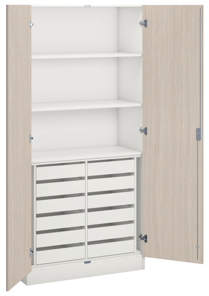 Materialskap med stamme i direktelaminat. Fronter i direktelaminat eller høytrykkslaminat. Inneholder 3 hyller og 12 skuffer. 2 tette dører med espanjolett (inkl. 2 nøkler). Dørene kan åpnes i 170° vinkel og må åpnes i mer enn 90° for å åpne skuffene.