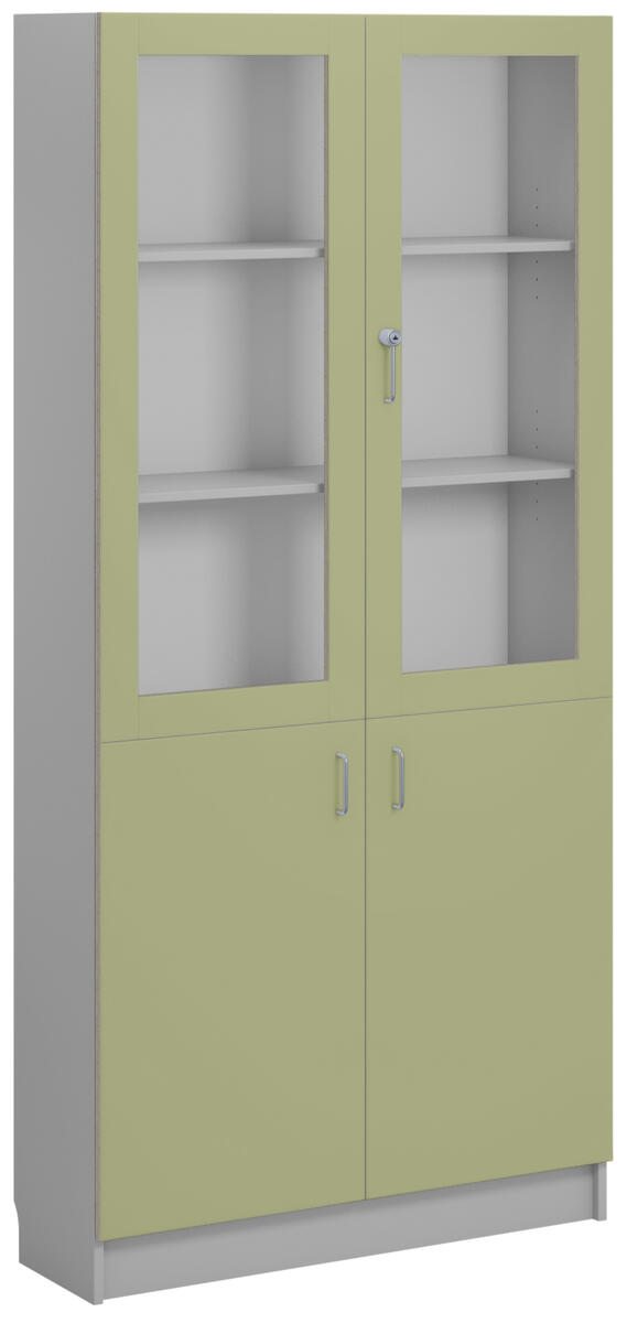 Materialskap med stamme i direktelaminat. Fronter i direktelaminat eller høytrykkslaminat. Inneholder 5 hyller, hvorav 3 flyttbare. 2 dører i herdet glass med sylinderlås og 2 tette dører med håndtak. Dørene kan åpnes i 170° vinkel.