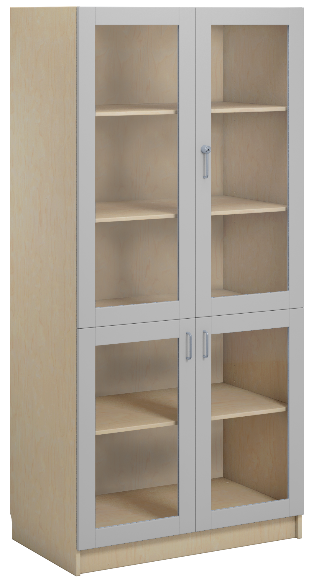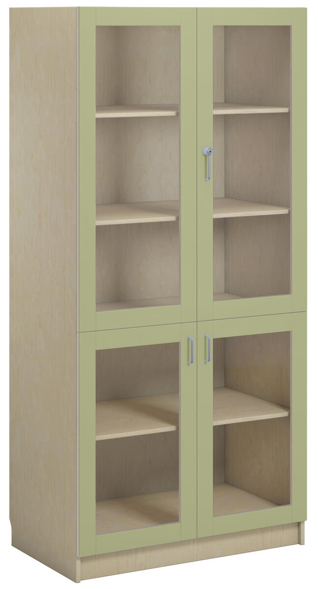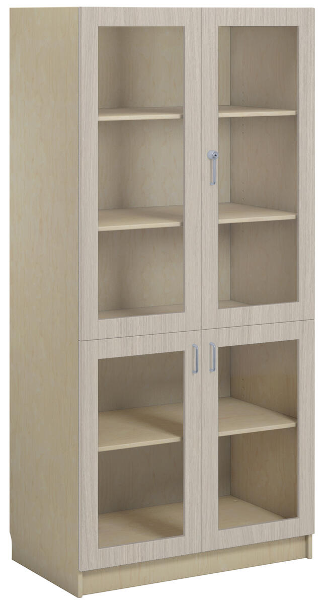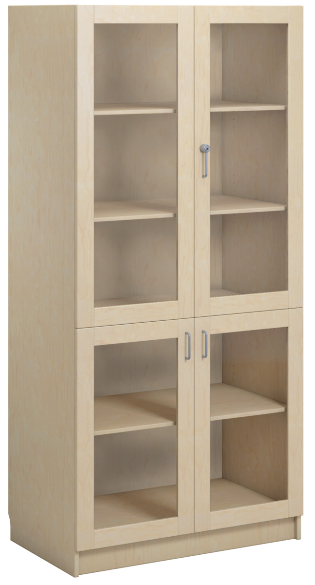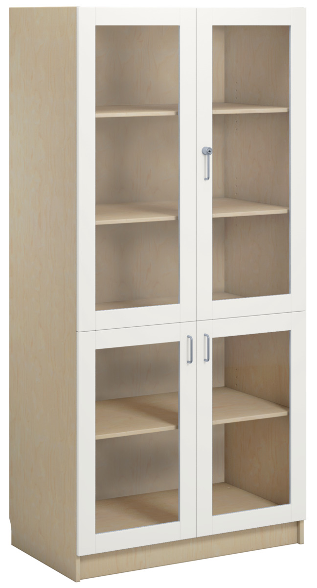 Materialskap med stamme i direktelaminat. Fronter i direktelaminat eller høytrykkslaminat. Inneholder 5 hyller, hvorav 3 flyttbare. 2 dører i herdet glass med sylinderlås og 2 dører i herdet glass med håndtak. Dørene kan åpnes i 170° vinkel.