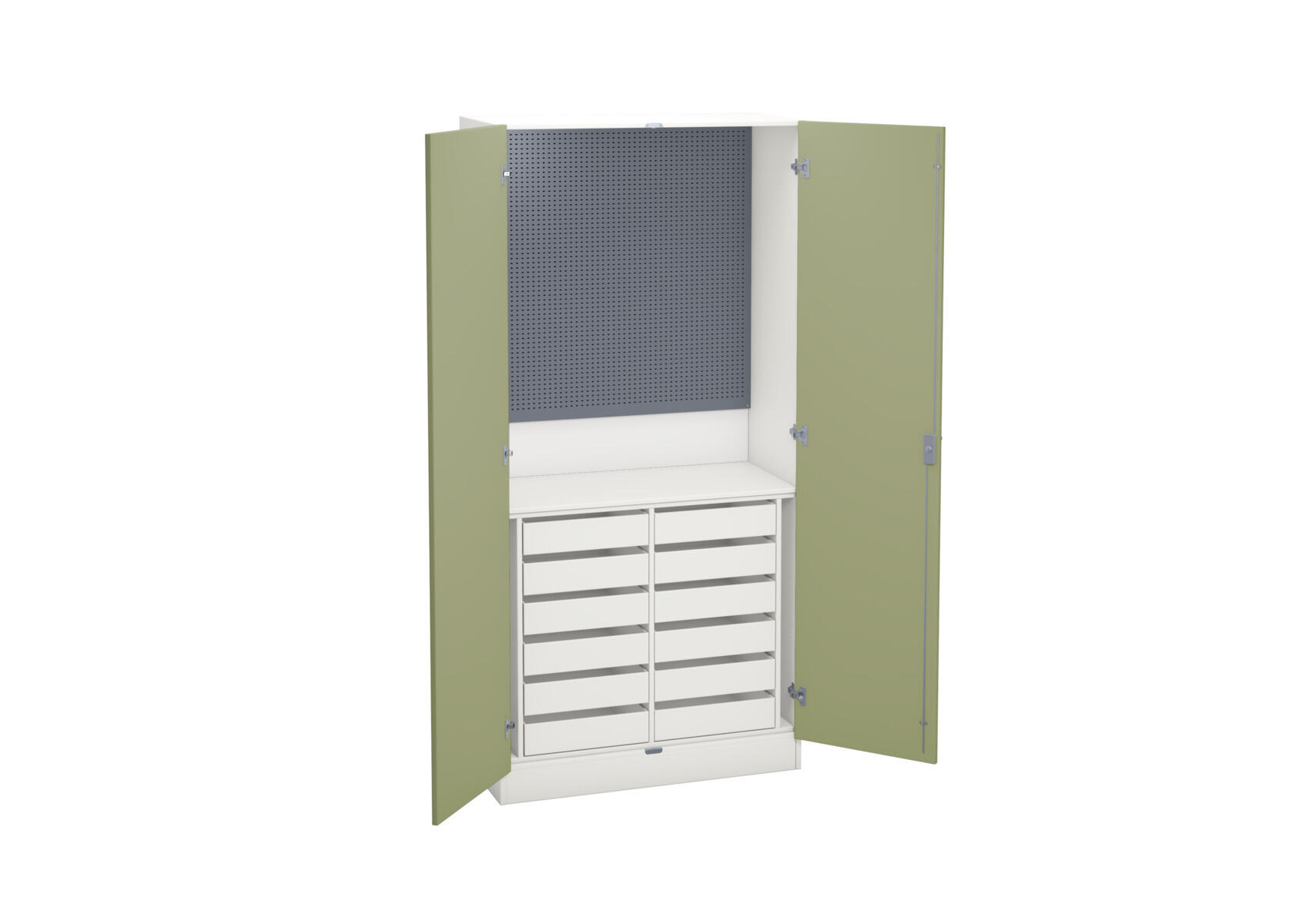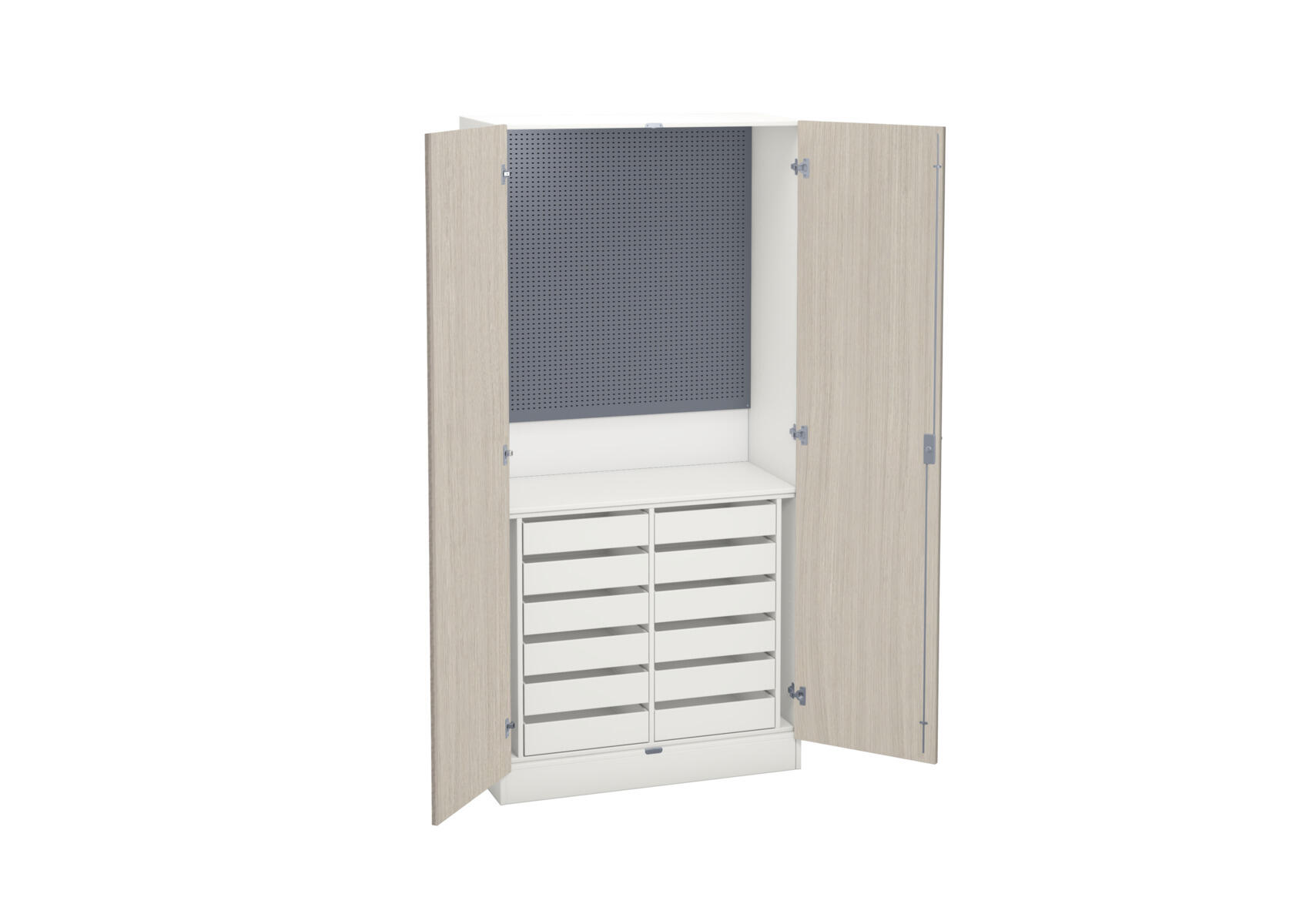 Materialskap for tre- og metallsløyd med stamme i direktelaminat. Fronter i direktelaminat eller høytrykkslaminat. Inneholder verktøytavle med oppheng og 12 skuffer, 5 rundkroker, 1 hylseholder, 1 meiselholder og 1 list med fjærklemmer. 2 tette dører med espanjolett (inkl. 2 nøkler). Dørene kan åpnes i 170° vinkel.