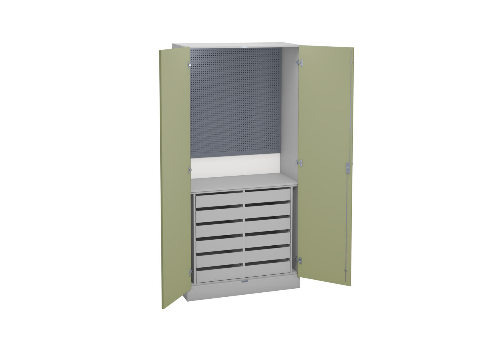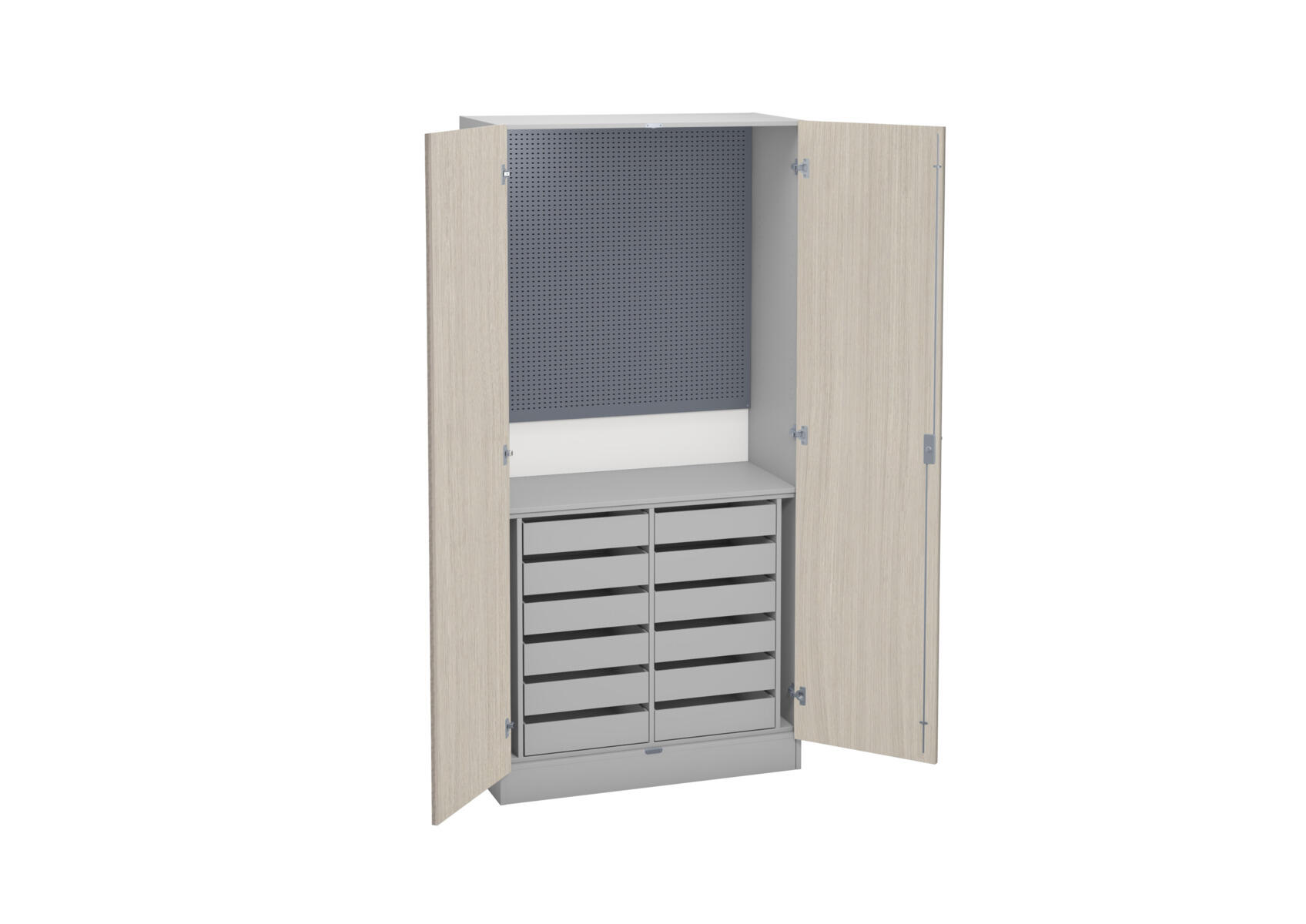 Materialskap for tre- og metallsløyd med stamme i direktelaminat. Fronter i direktelaminat eller høytrykkslaminat. Inneholder verktøytavle med oppheng og 12 skuffer, 5 rundkroker, 1 hylseholder, 1 meiselholder og 1 list med fjærklemmer. 2 tette dører med espanjolett (inkl. 2 nøkler). Dørene kan åpnes i 170° vinkel.