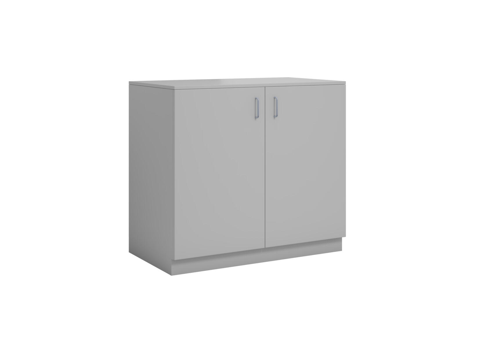 Lavt materialskap i direktelaminat. Dører i direktelaminat eller høytrykkslaminat. Med 3 hyller, hvorav 2 flyttbare. 2 tette dører med håndtak.