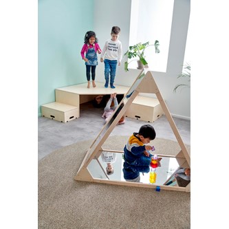 Et morsomt speilhus som oppleves som større på innsiden enn på utsiden. La deg fascinere av alle refleksjonene som speilene gir, sirklene gir huset karakter og vekker nysgjerrigheten ytterligere. Her kan du se deg selv og vennene dine i det uendelige og samtidig være med på å styrke barnas selvfølelse. La barna oppdage en ny side av seg selv. Hvordan ser det ut hvis jeg strekker bena opp til taket? Endres refleksjonene hvis jeg sitter i hjørnet eller midt i huset? Hvis du slår av lyset i rommet og slår på en lysstreng – hvordan ser det ut? Her kan du observere fra alle retninger og vinkler. Sekkestol følger ikke med. Laget av bjørkekryssfiner og aluminiumsfolie. Mål: L105xB105xH92, Mål på hullet B76xH65.