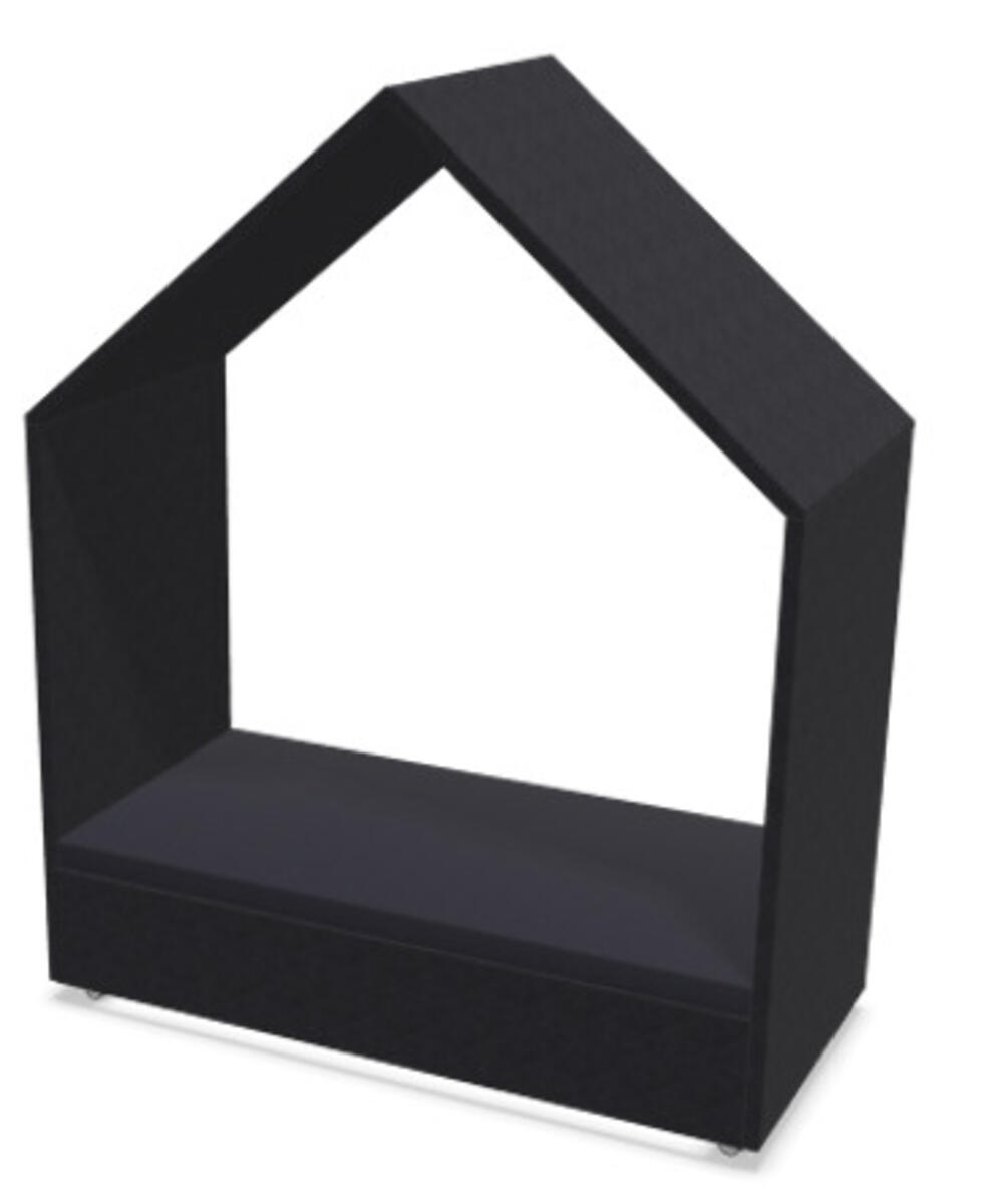 Lydabsorberende hus for store og små. Bakvegg følger ikke med. Trukket i Nevotex Illusion 3.0 farge 58290 Stone på sokkelen, Camira Synergy farge Mix LDS17 på sitteputen og Gabriel Hush farge sort 60900 på utside og innside.