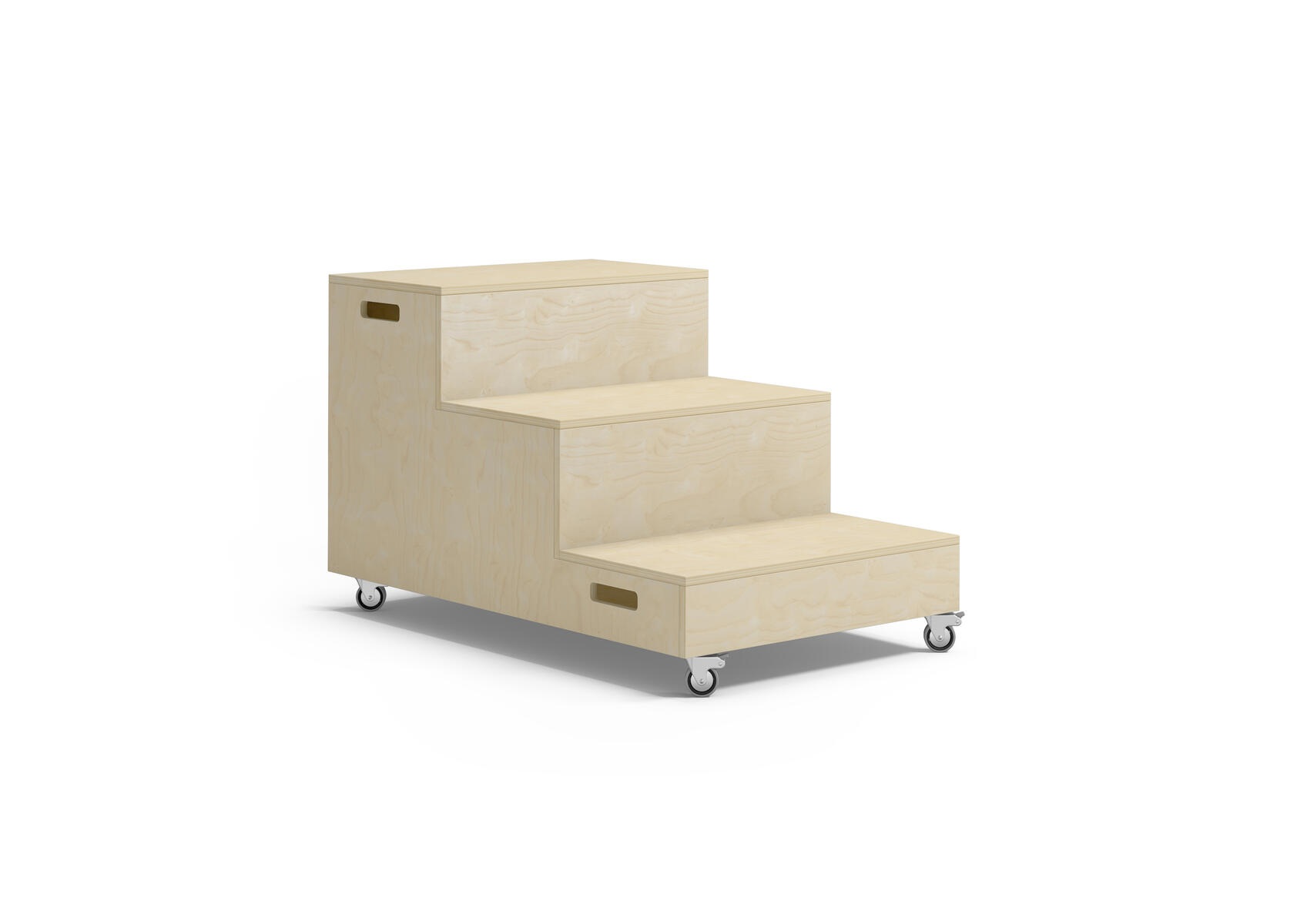 Scenetrapp hjørne til de små barna. 3 trinn. FSC-sertifisert bjørk kryssfiner. Svanemerket, lisensnummer 5031 0099. Mål: 120x120x59,5 cm. 4 hjul med brems.