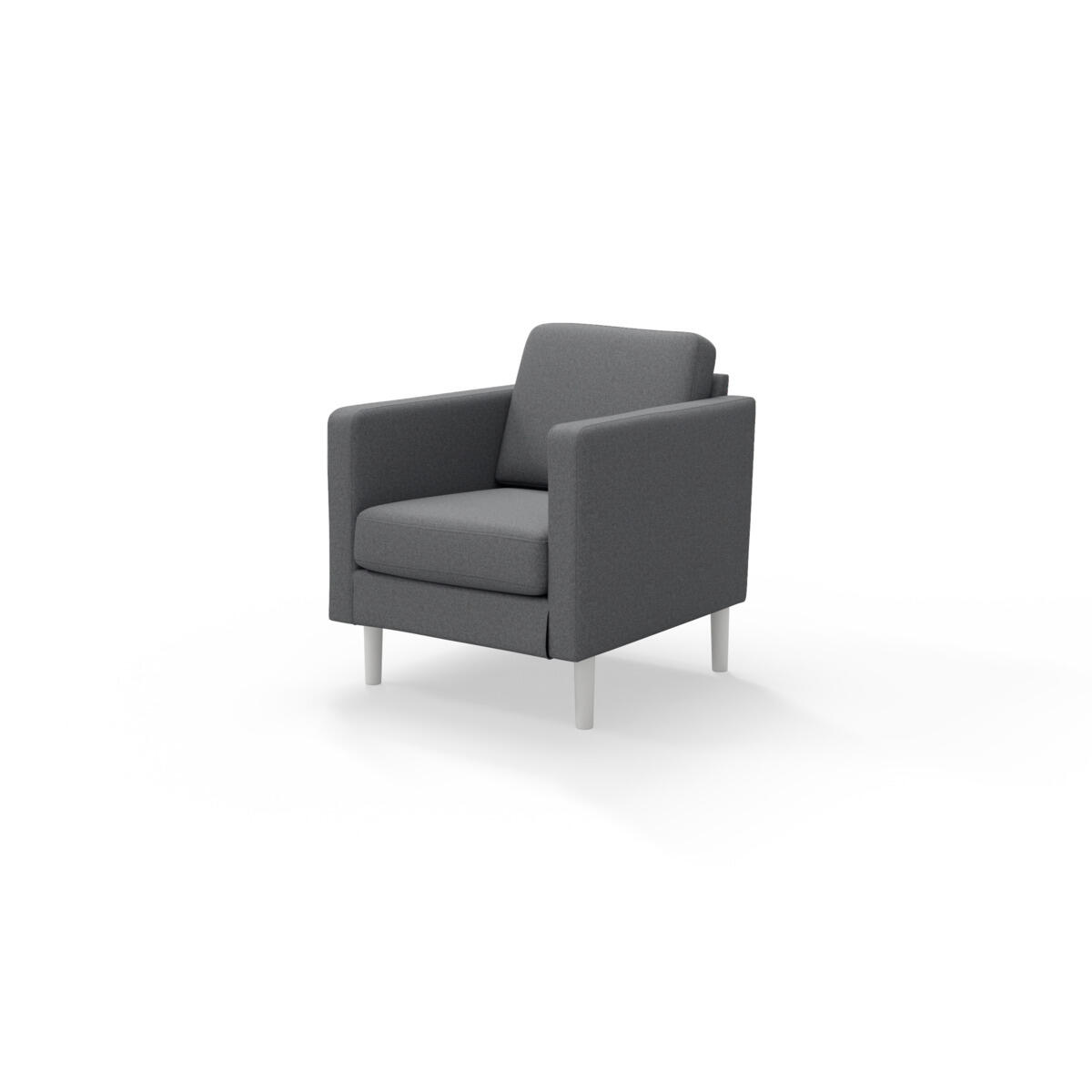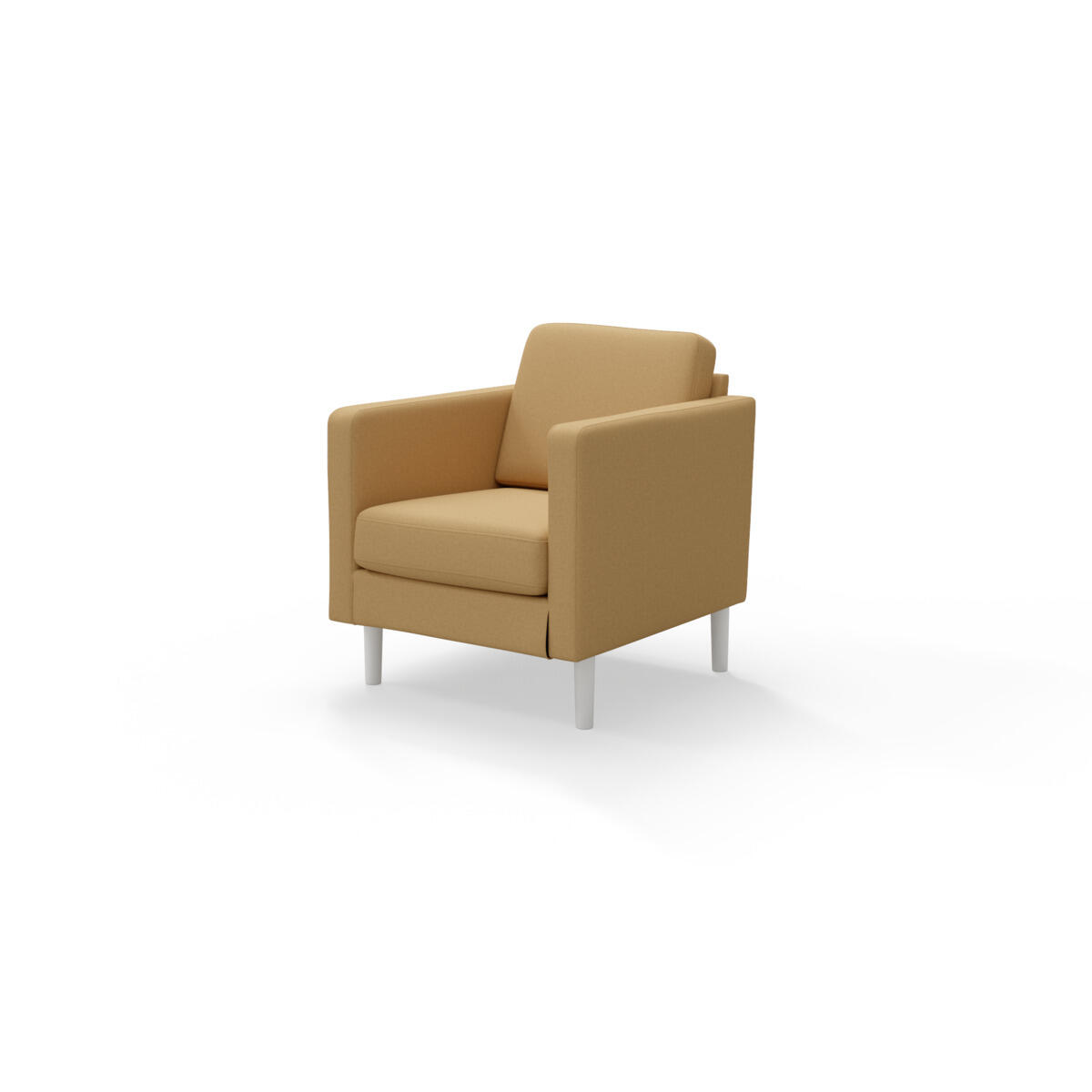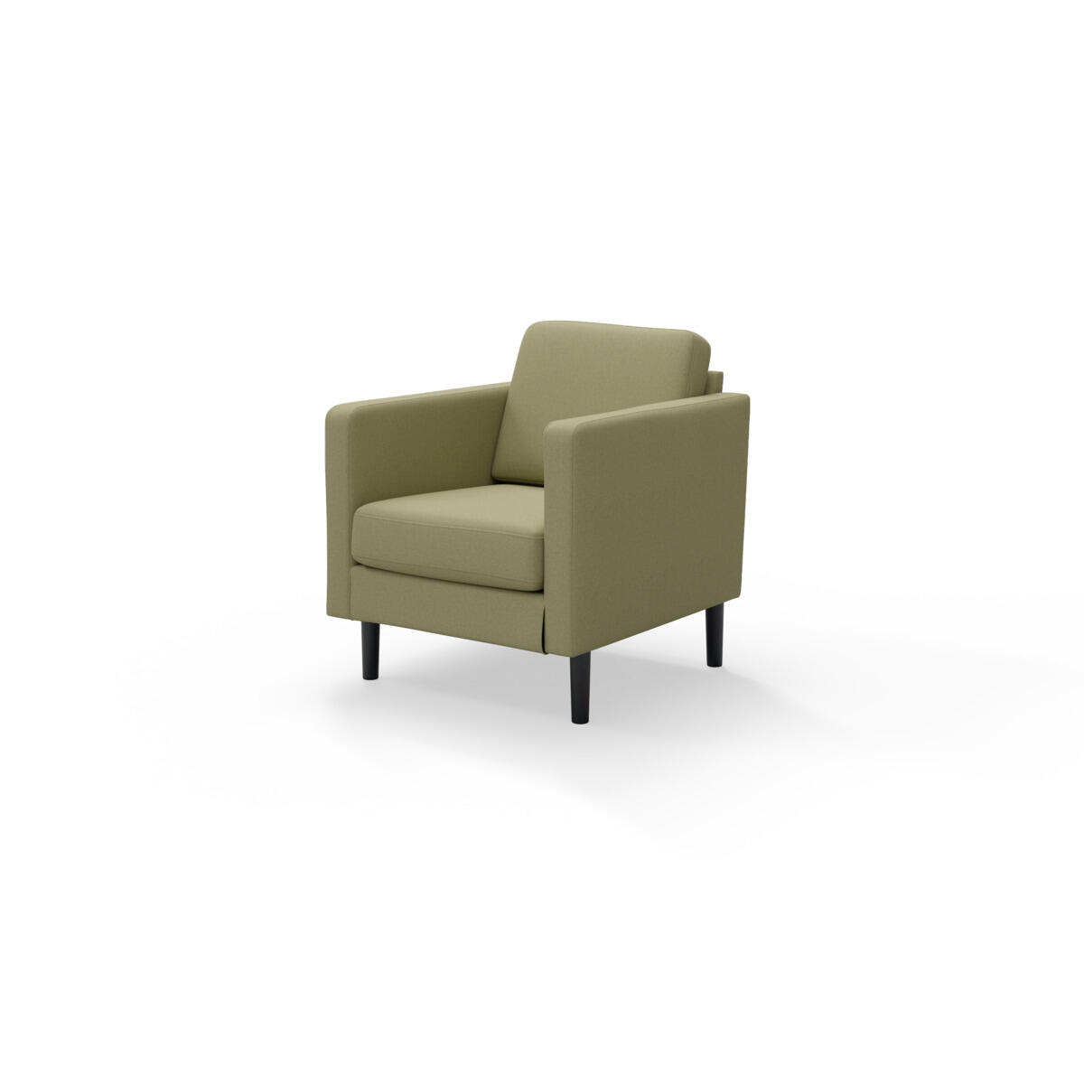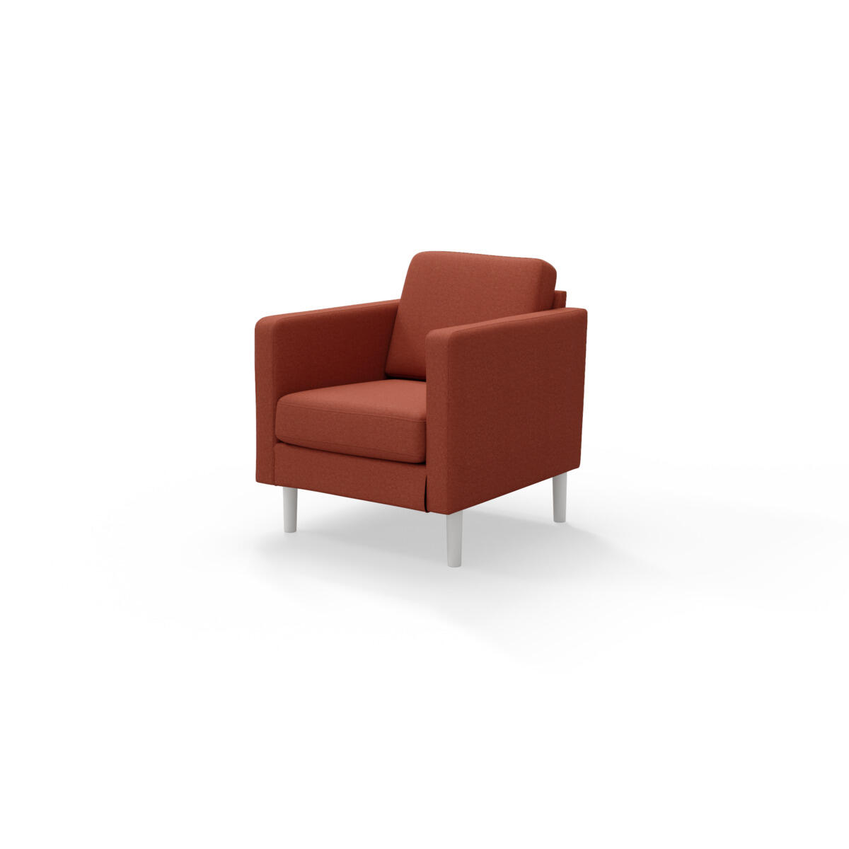 Stilren lenestol med et enkelt design som passer inn i de fleste miljøer. Rette linjer på utsiden og avrundede, omsluttende former på innsiden. Det rette utsiden gjør det enkelt å plassere flere lenestoler tett sammen, for eksempel rygg mot rygg. Treramme med nozag-understell og polstring av kaldskum. Pulverlakkert metallunderstell.