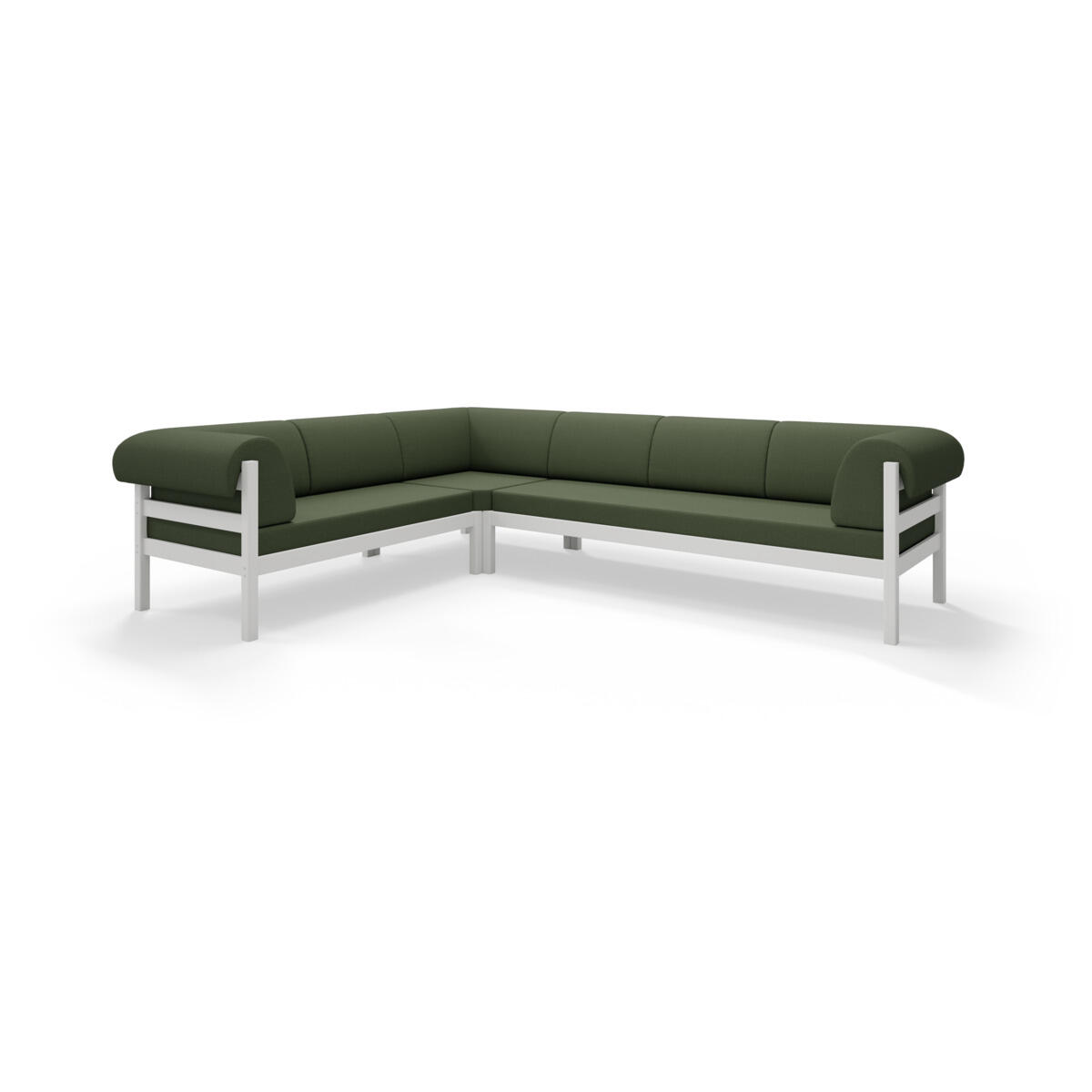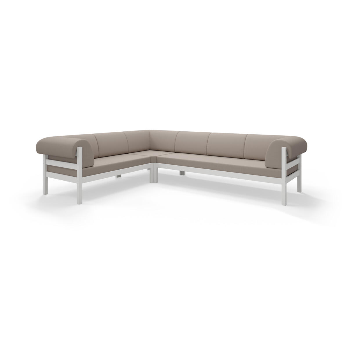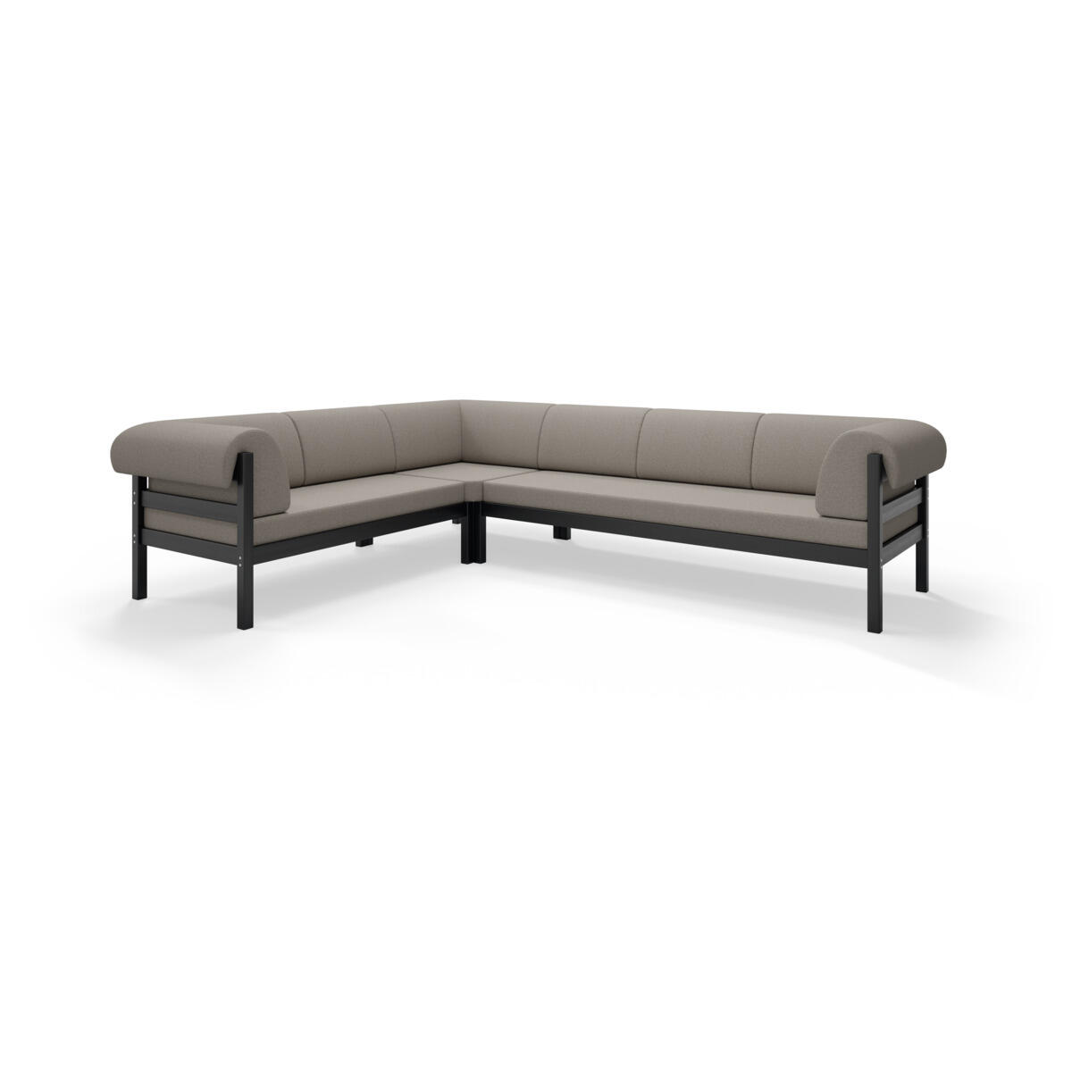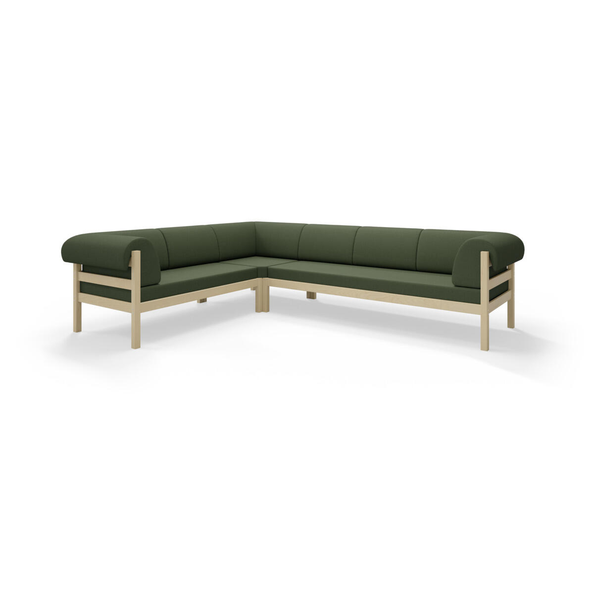 Sofa med stabil trestamme, nozagfjæring i bunnen og puter av kaldskum for ekstra komfort. Avtakbart trekk på rygg- og sitteputer. Mål: 209x209 cm. Sittehøyde 45 cm, sittedybde 53 cm. Benhøyde 10 cm