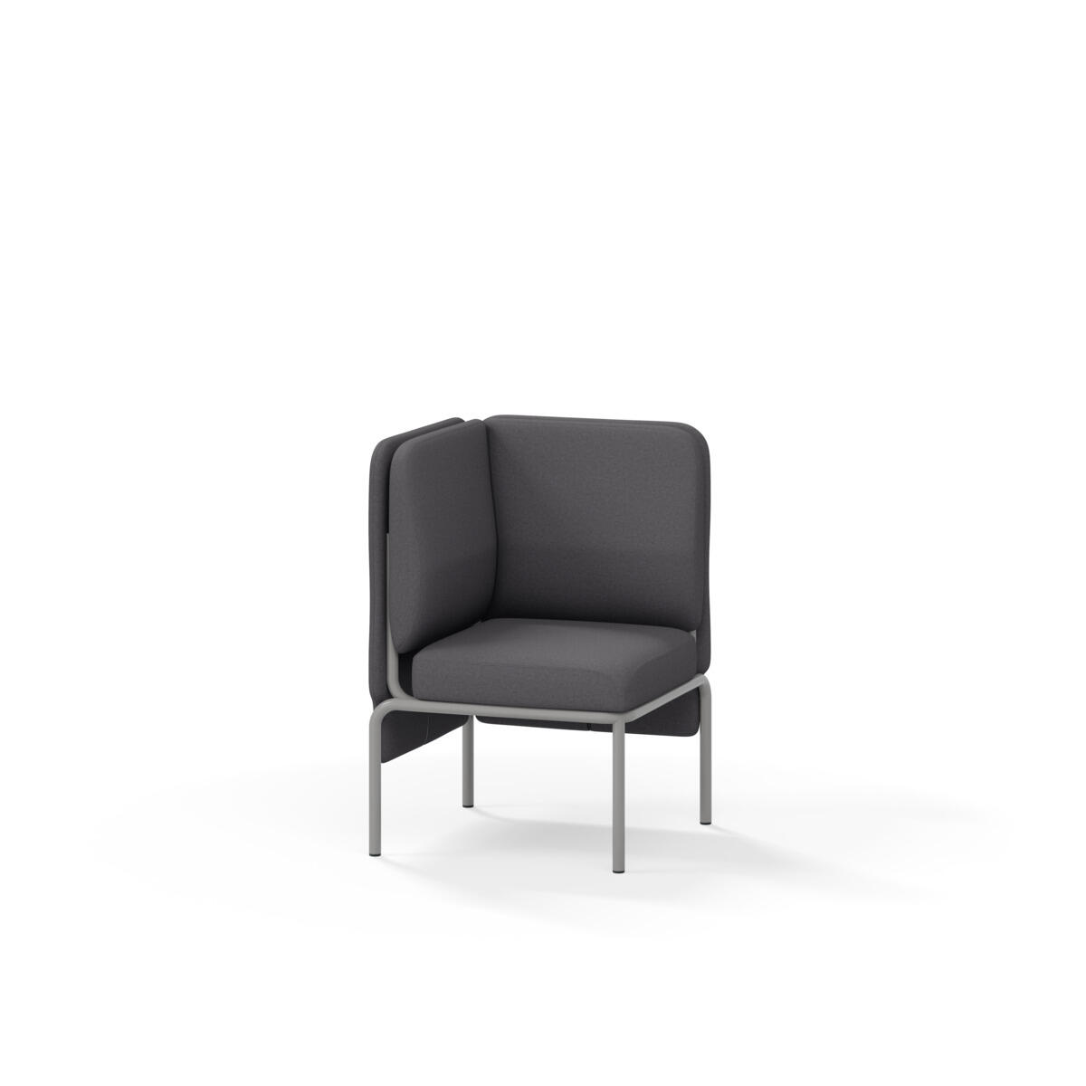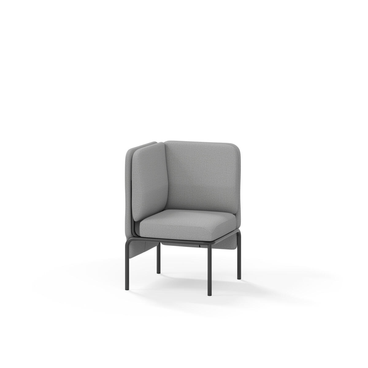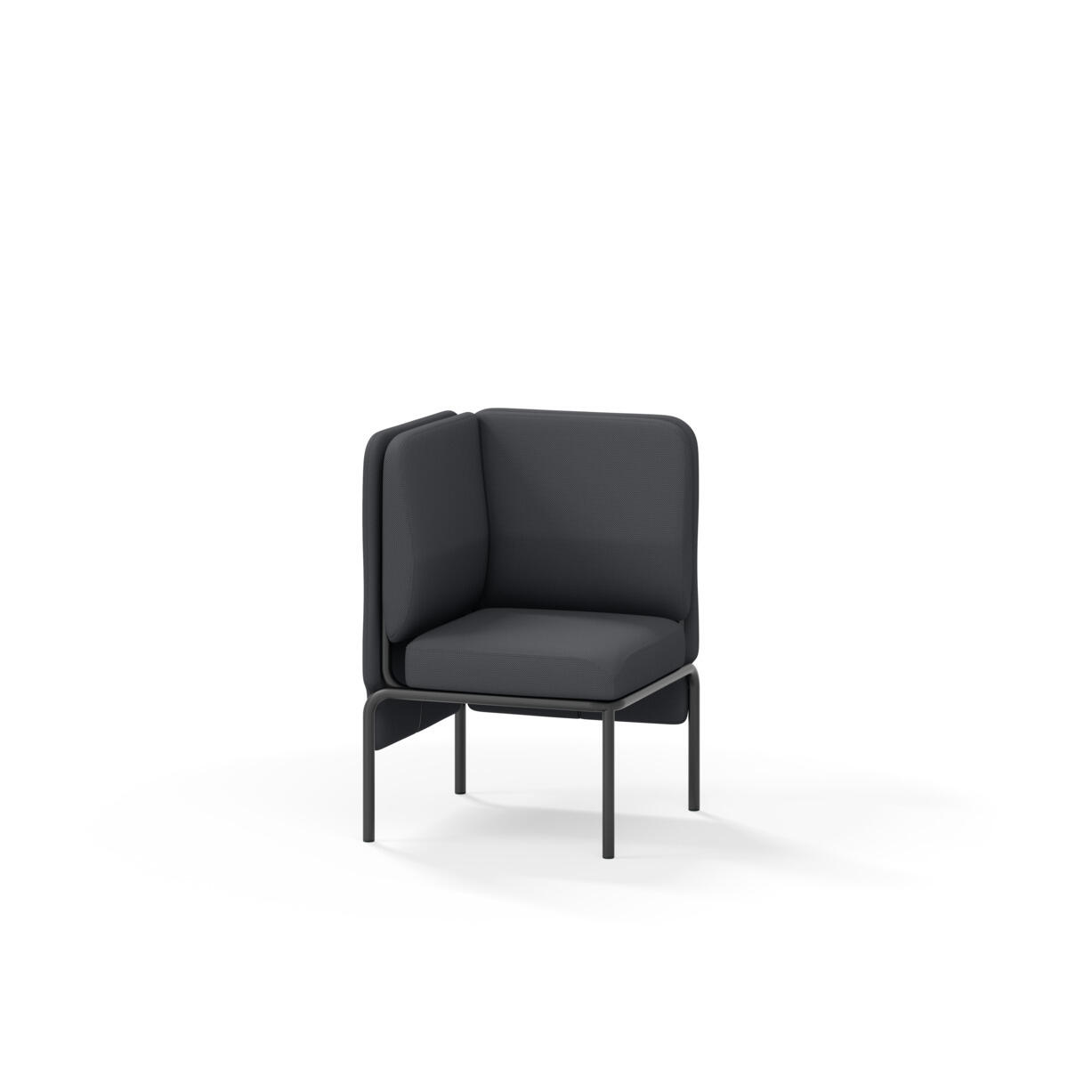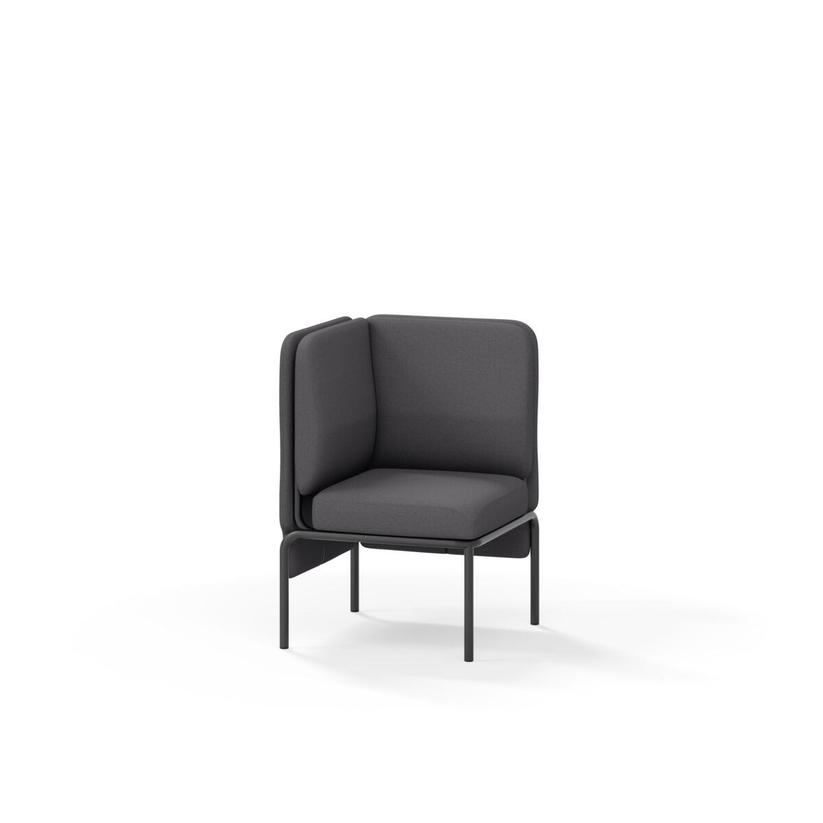 Hjørnemodul med ergonomisk utformet ryggpute og lydabsorberende panel. Sofasystemet er spesielt utviklet for å skape plassbesparende moduler som fremmer studiero, trygghet, fellesskap og inkludering i skolen. Vi har minimert materialbruken og utviklet et sirkulært produkt der alle deler kan byttes ut. Sofaen har smuleåpning og høyt metallstativ som gjør renhold enklere, samt avtagbart trekk på puter og paneler. Stamme av kryssfiner med polstring av kaldskum. Stativ i pulverlakkert metall med justerbare føtter, som sørger for stabilitet også på ujevnt underlag. Design: Sigrid Strömgren
