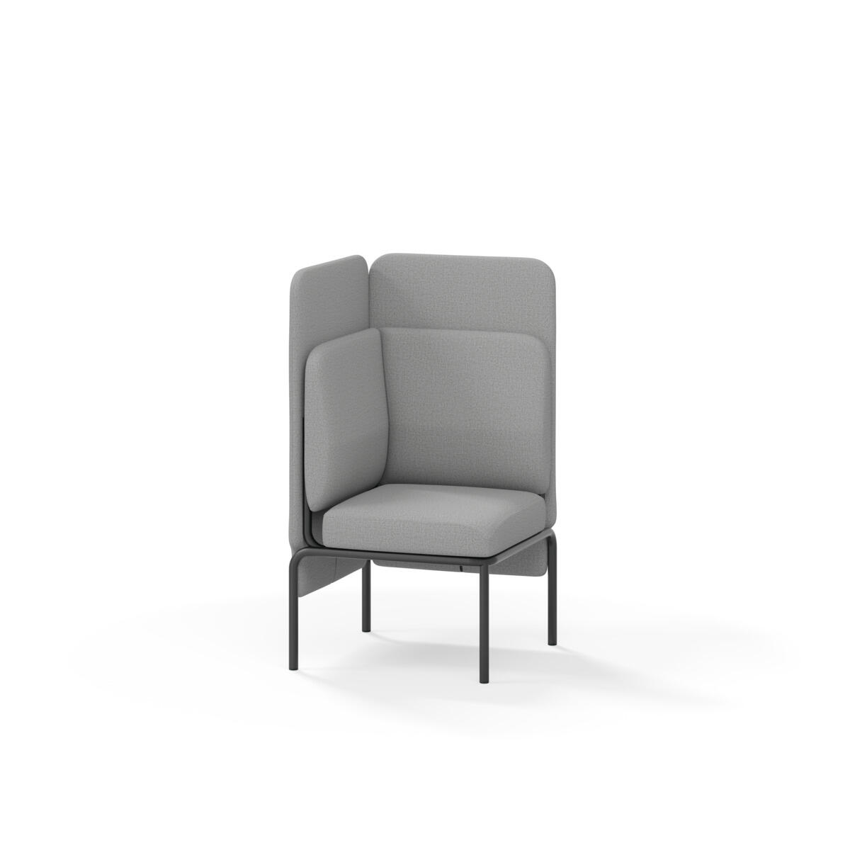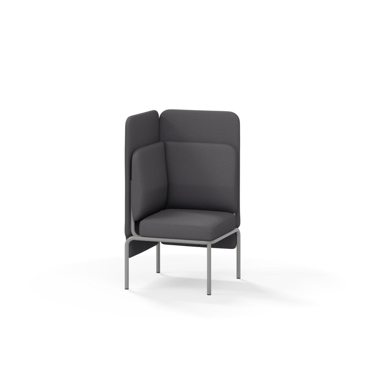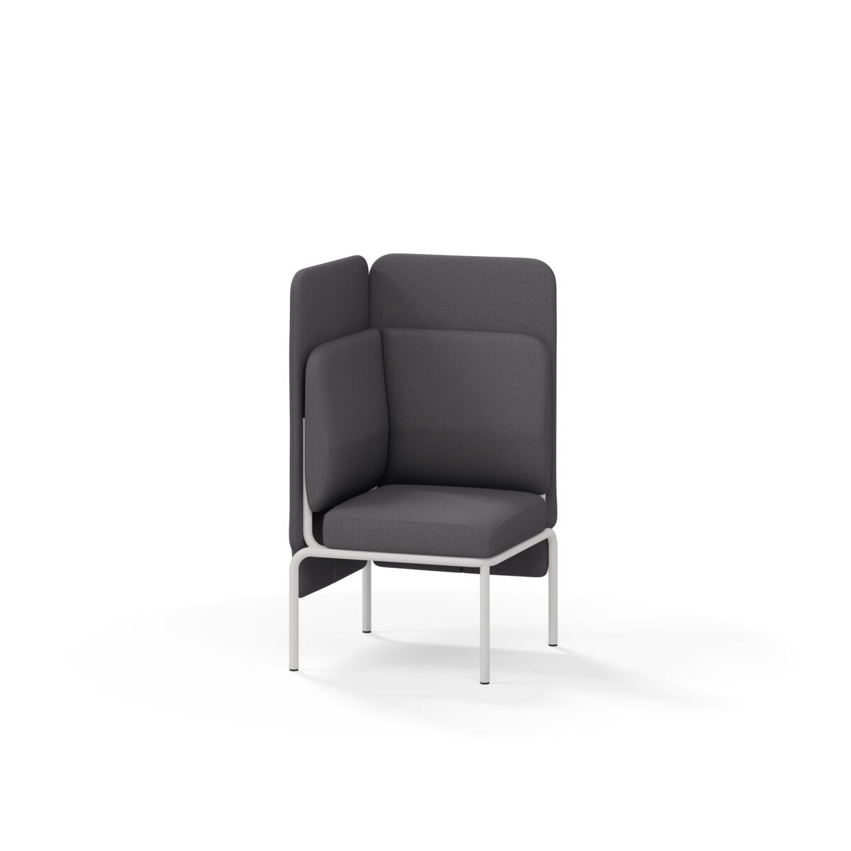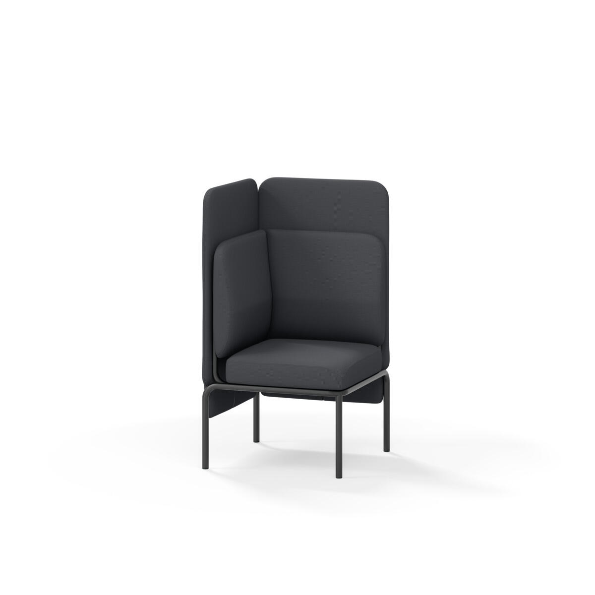 Hjørnemodul med ergonomisk utformet ryggpute og lydabsorberende panel. Sofasystemet er spesielt utviklet for å skape plassbesparende moduler som fremmer studiero, trygghet, fellesskap og inkludering i skolen. Vi har minimert materialbruken og utviklet et sirkulært produkt der alle deler kan byttes ut. Sofaen har smuleåpning og høyt metallstativ som gjør renhold enklere, samt avtagbart trekk på puter og paneler. Stamme av kryssfiner med polstring av kaldskum. Stativ i pulverlakkert metall med justerbare føtter, som sørger for stabilitet også på ujevnt underlag. Design: Sigrid Strömgren