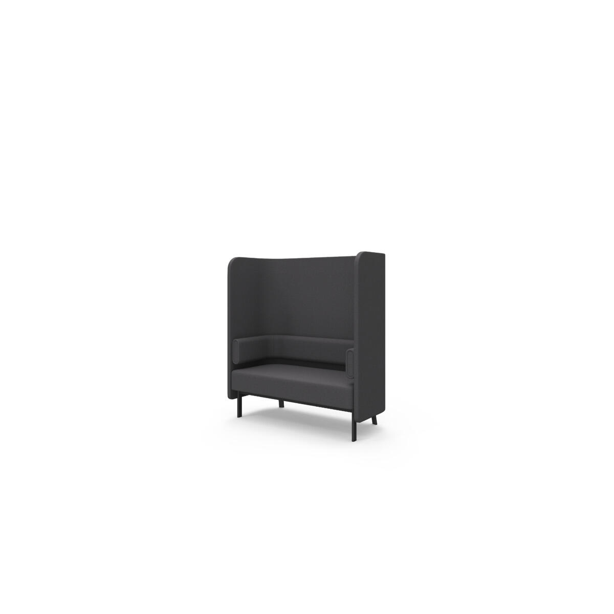 Omsluttende sofa som, takket være sine høye sider, har en lyddempende og avskjermende effekt, noe som gjør den egnet for for eksempel gruppemøter, samarbeid eller egentid i et dempet miljø. De høye veggene gir avskjerming fra resten av rommet. Bord med laminatplate L125×D64×H74 cm; fargen på bordplaten følger fargen på bena. Trestamme og stopping i kaldskum. Ben i pulverlakkert metall.