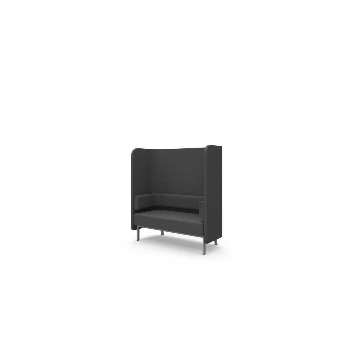 Den høye ryggen og de høye gavlene skjermer av og demper lyd effektivt. Trestamme og stopping i kaldskum. Ben i pulverlakkert metall. Som tilbehør finnes sidebord som enkelt monteres i rammen.