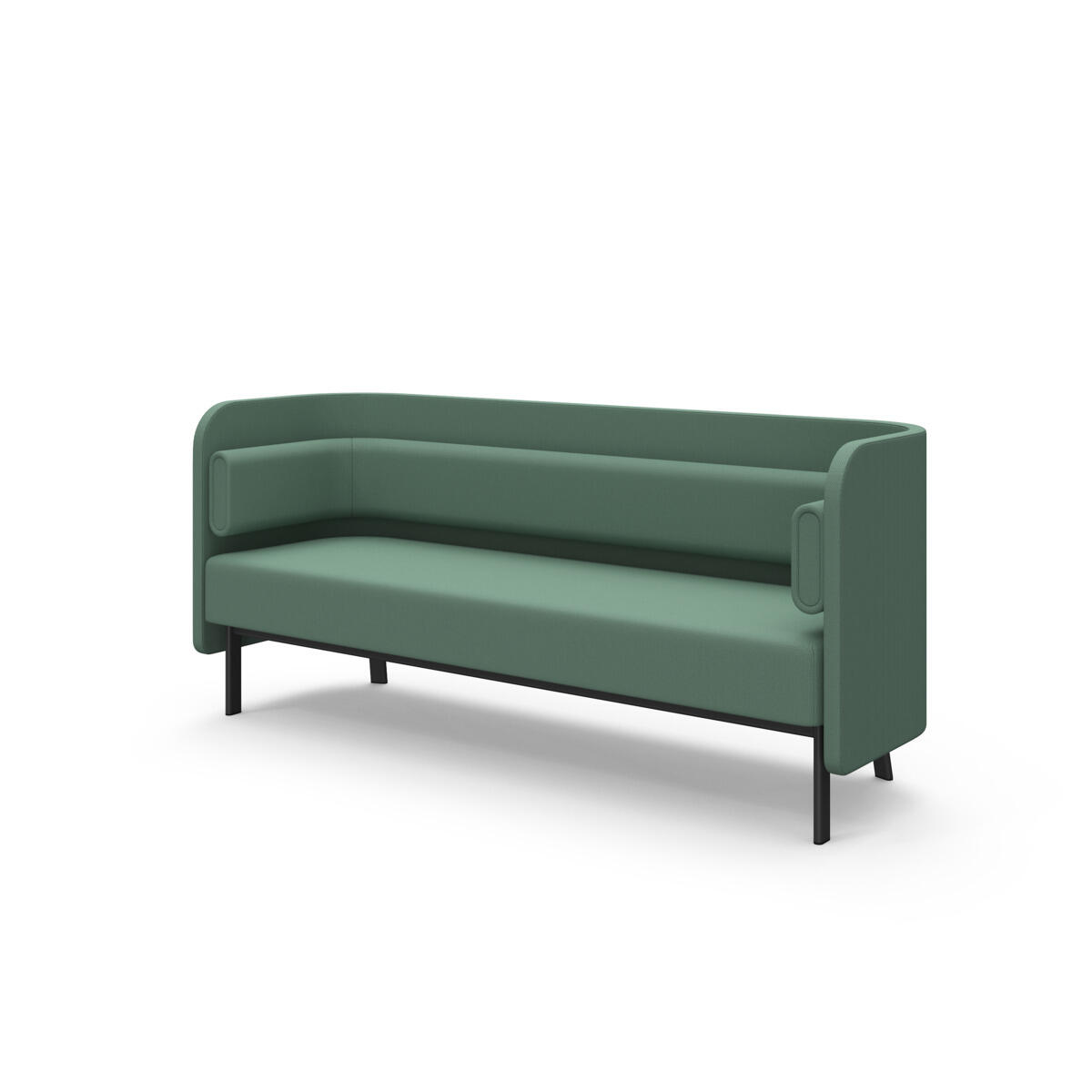 Omsluttende sofa som, takket være sine høye sider, har en lyddempende og avskjermende effekt, noe som gjør den egnet for for eksempel gruppemøter, samarbeid eller egentid i et dempet miljø. De høye veggene gir avskjerming fra resten av rommet. Bord med laminatplate L125×D64×H74 cm; fargen på bordplaten følger fargen på bena. Trestamme og stopping i kaldskum. Ben i pulverlakkert metall.