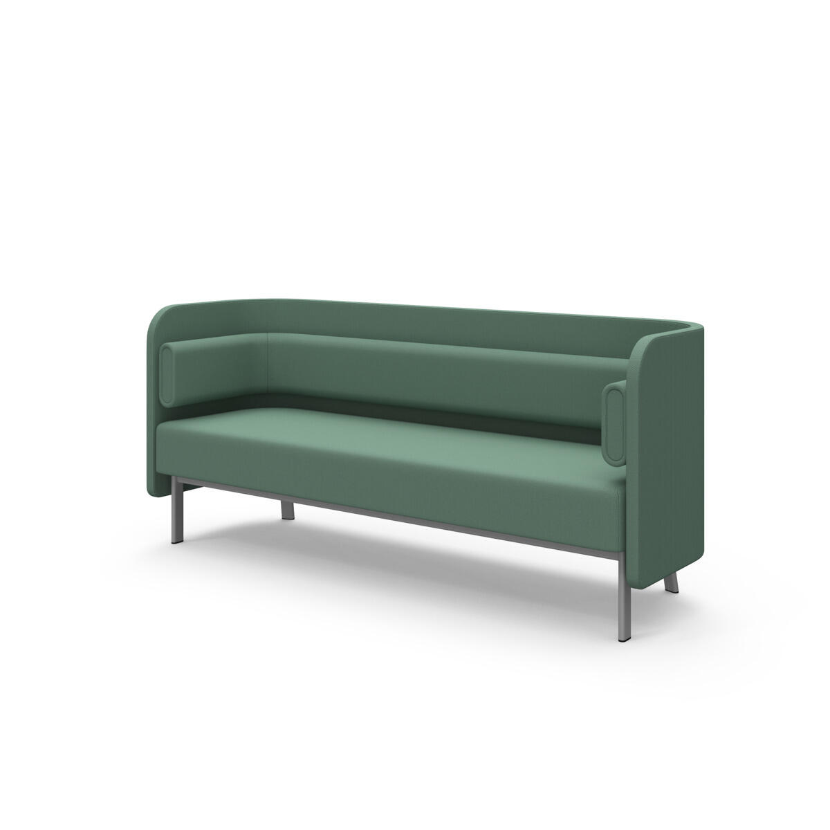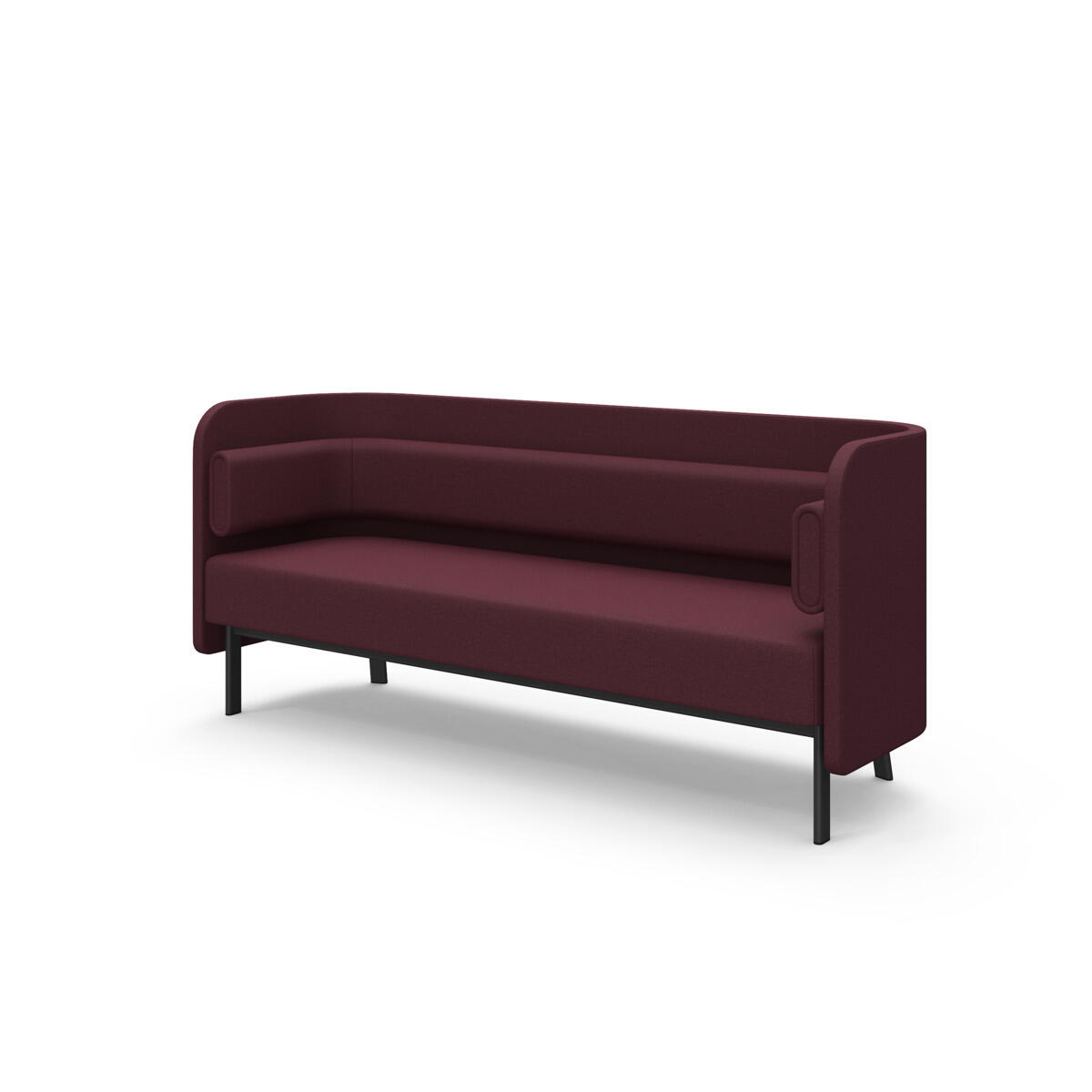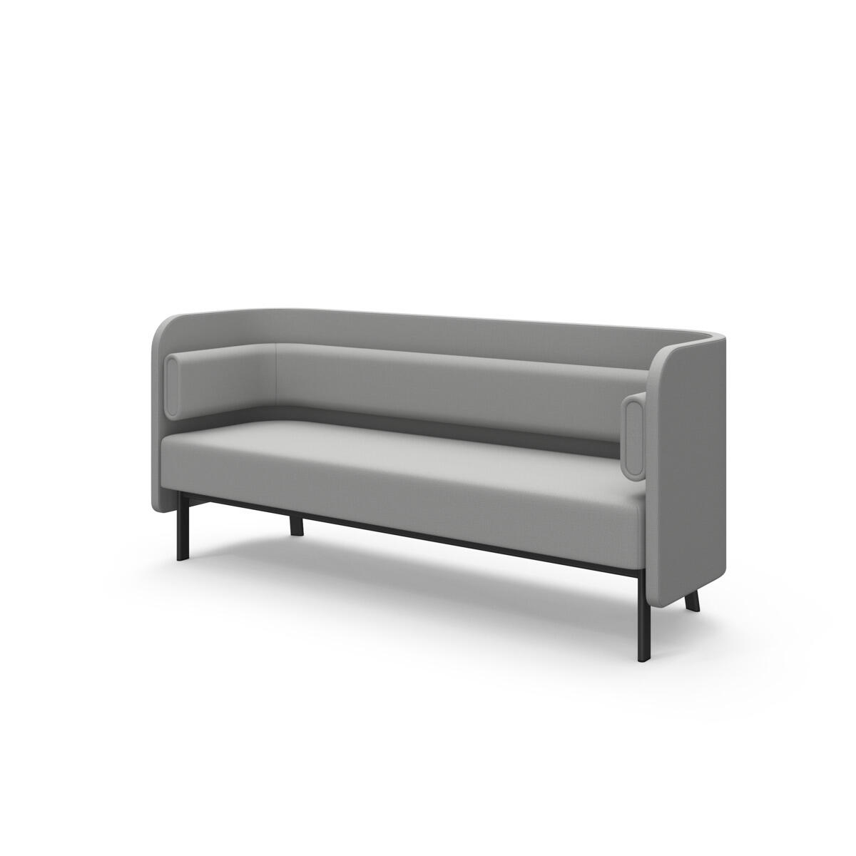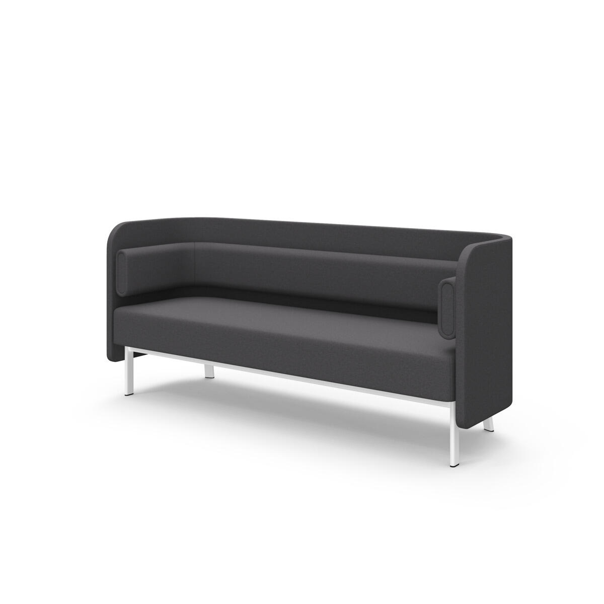 Den høye ryggen og de høye gavlene skjermer av og demper lyd effektivt. Trestamme og stopping i kaldskum. Ben i pulverlakkert metall. Som tilbehør finnes sidebord som enkelt monteres i rammen.