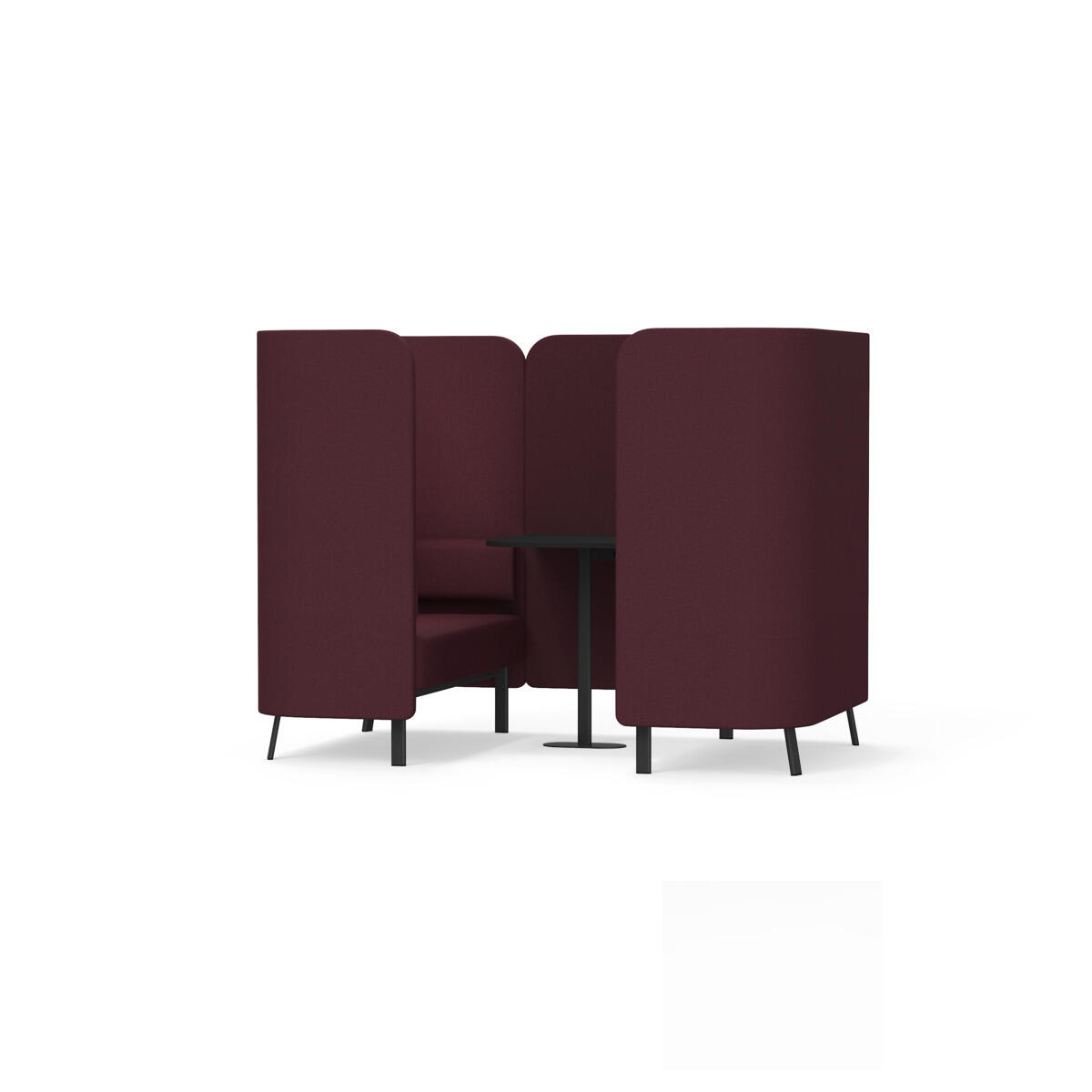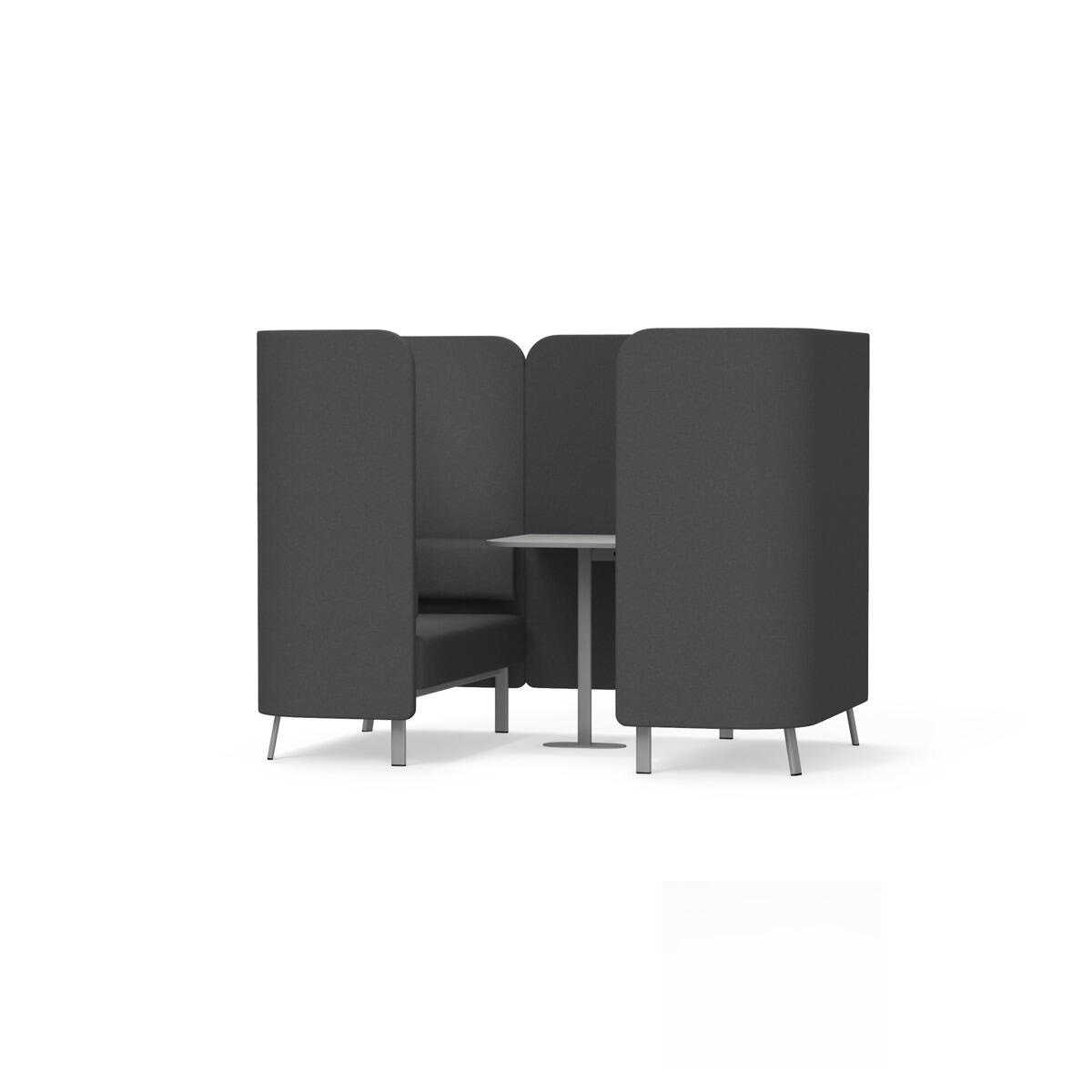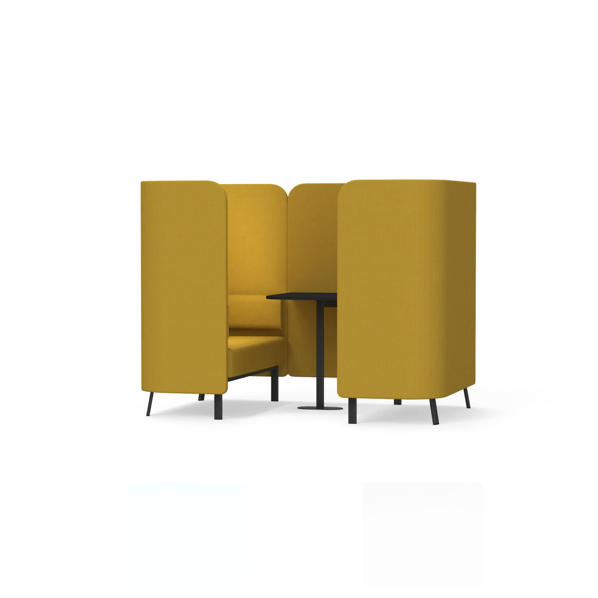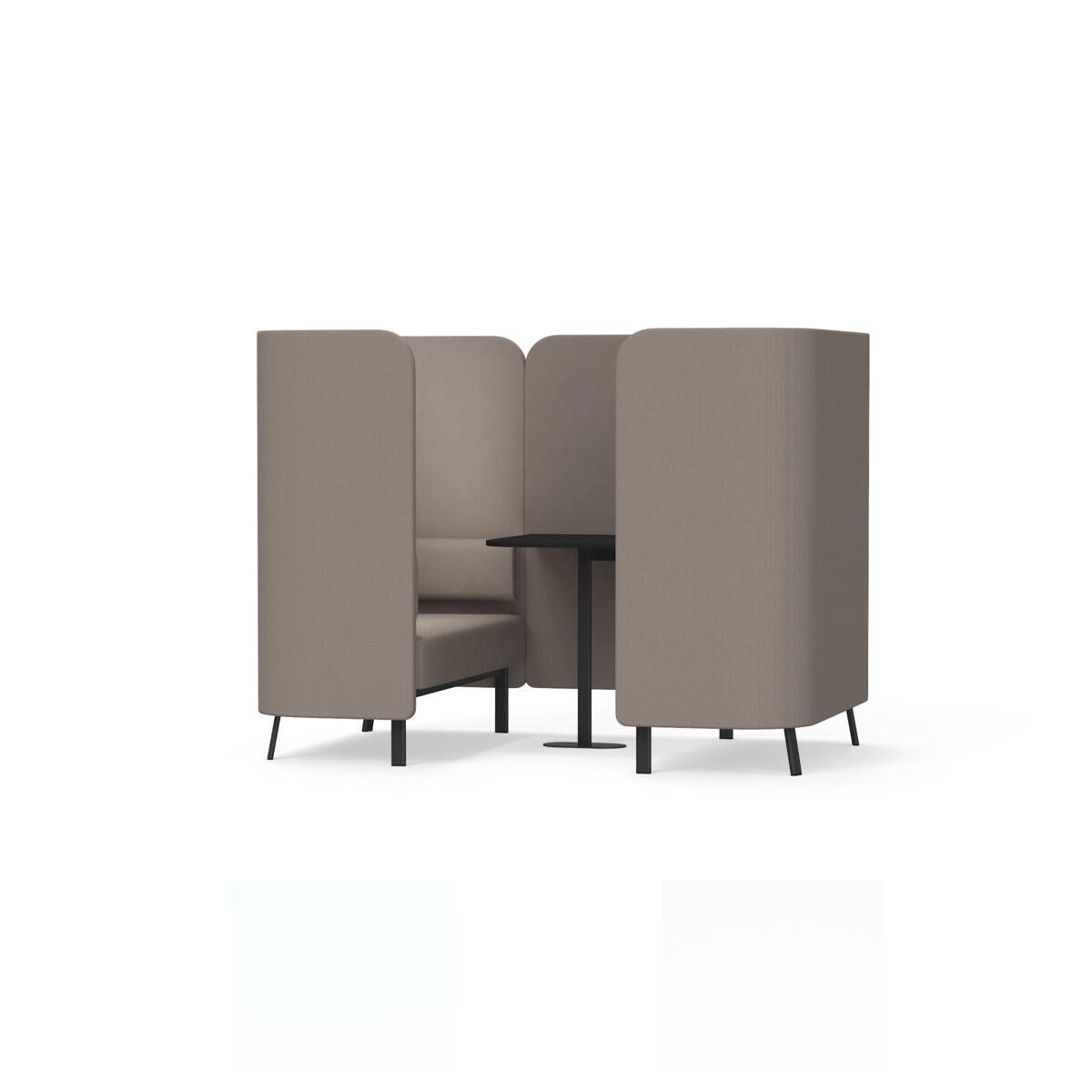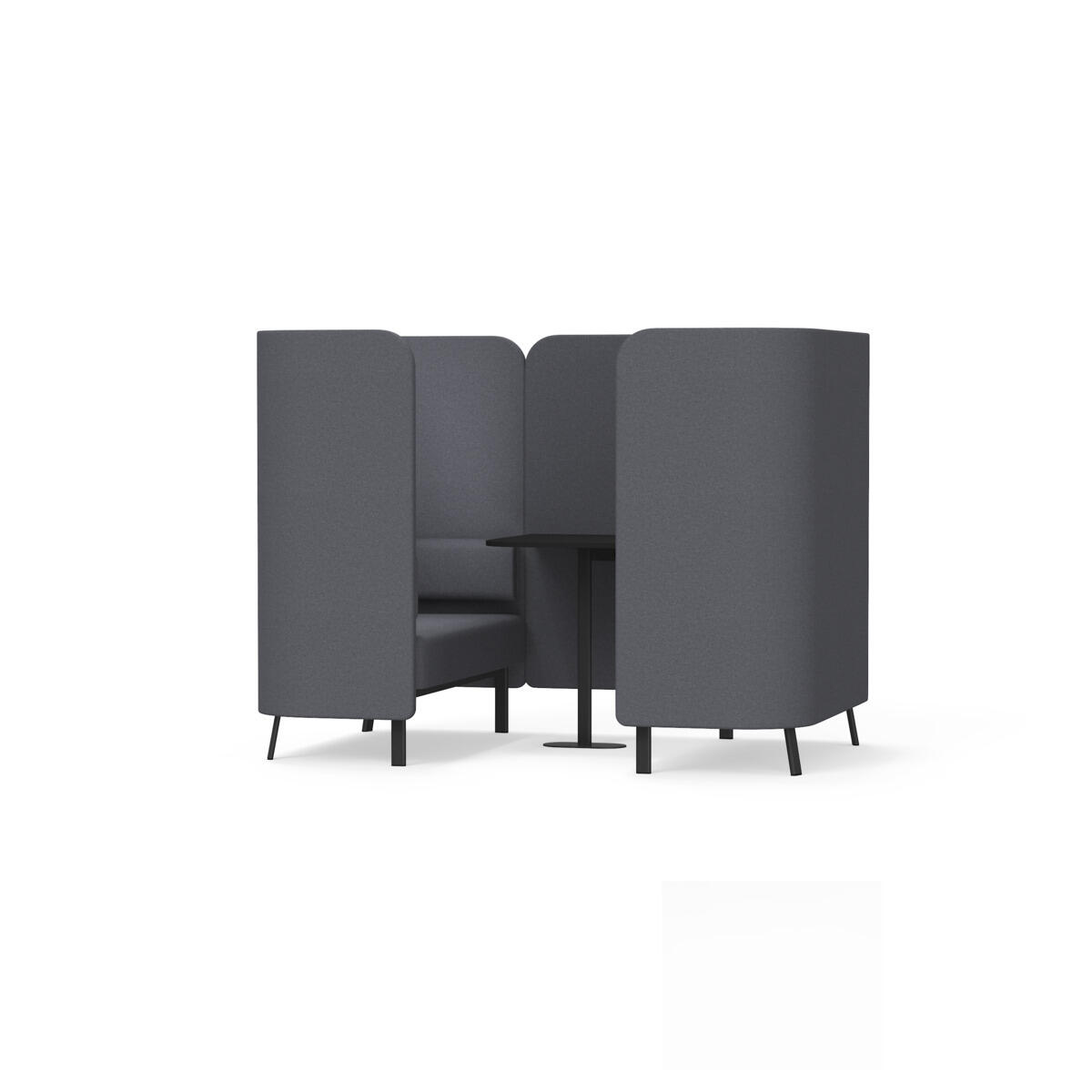 Omsluttende sofa som, takket være sine høye sider, har en lyddempende og avskjermende effekt, noe som gjør den egnet for for eksempel gruppemøter, samarbeid eller egentid i et dempet miljø. De høye veggene gir avskjerming fra resten av rommet. Bord med laminatplate L125×D64×H74 cm; fargen på bordplaten følger fargen på bena. Trestamme og stopping i kaldskum. Ben i pulverlakkert metall.