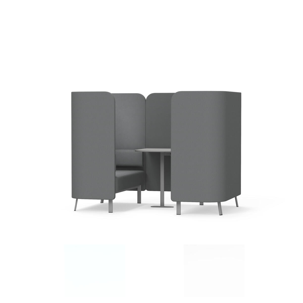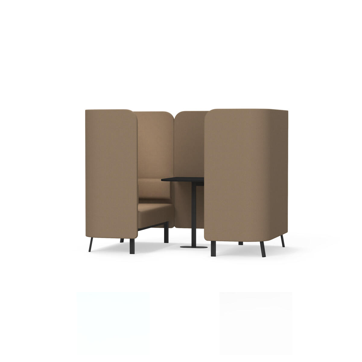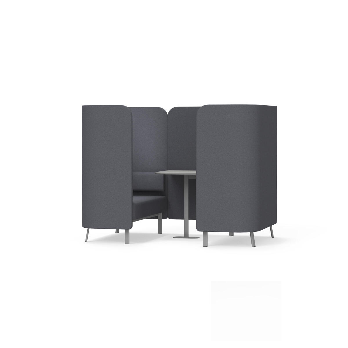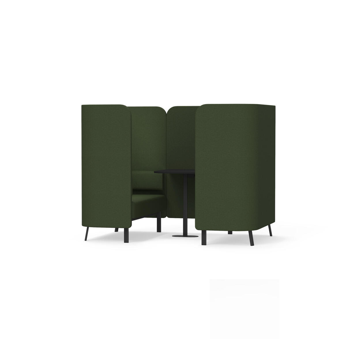 Omsluttende sofa som, takket være sine høye sider, har en lyddempende og avskjermende effekt, noe som gjør den egnet for for eksempel gruppemøter, samarbeid eller egentid i et dempet miljø. De høye veggene gir avskjerming fra resten av rommet. Bord med laminatplate L125×D64×H74 cm; fargen på bordplaten følger fargen på bena. Trestamme og stopping i kaldskum. Ben i pulverlakkert metall.