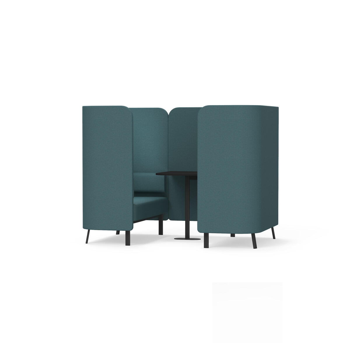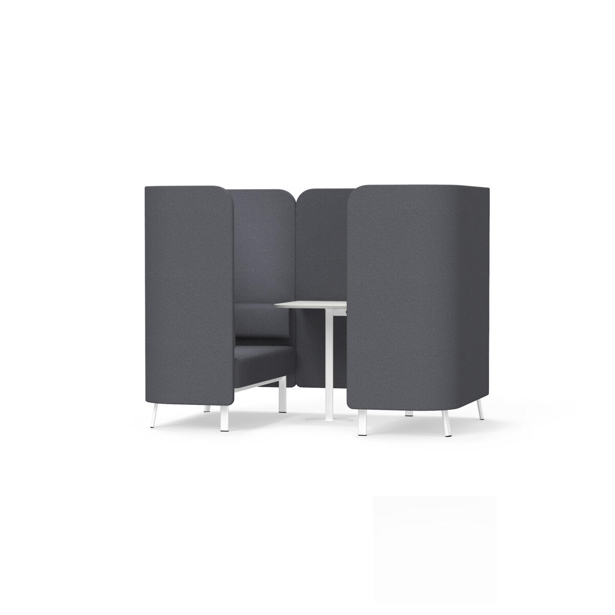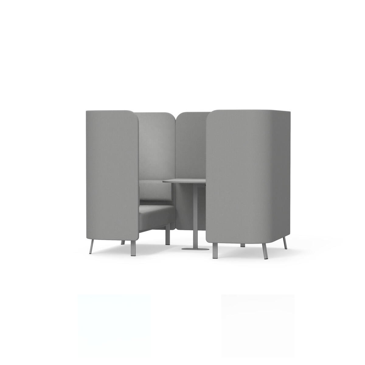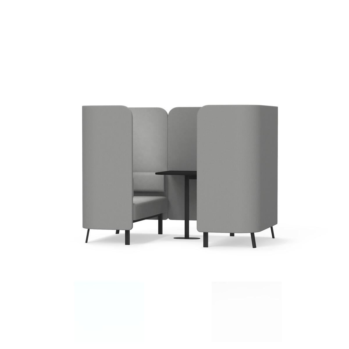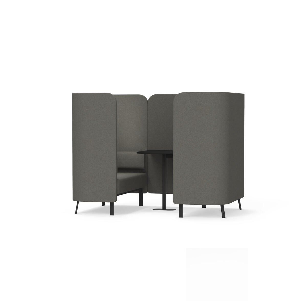 Omsluttende sofa som, takket være sine høye sider, har en lyddempende og avskjermende effekt, noe som gjør den egnet for for eksempel gruppemøter, samarbeid eller egentid i et dempet miljø. De høye veggene gir avskjerming fra resten av rommet. Bord med laminatplate L125×D64×H74 cm; fargen på bordplaten følger fargen på bena. Trestamme og stopping i kaldskum. Ben i pulverlakkert metall.