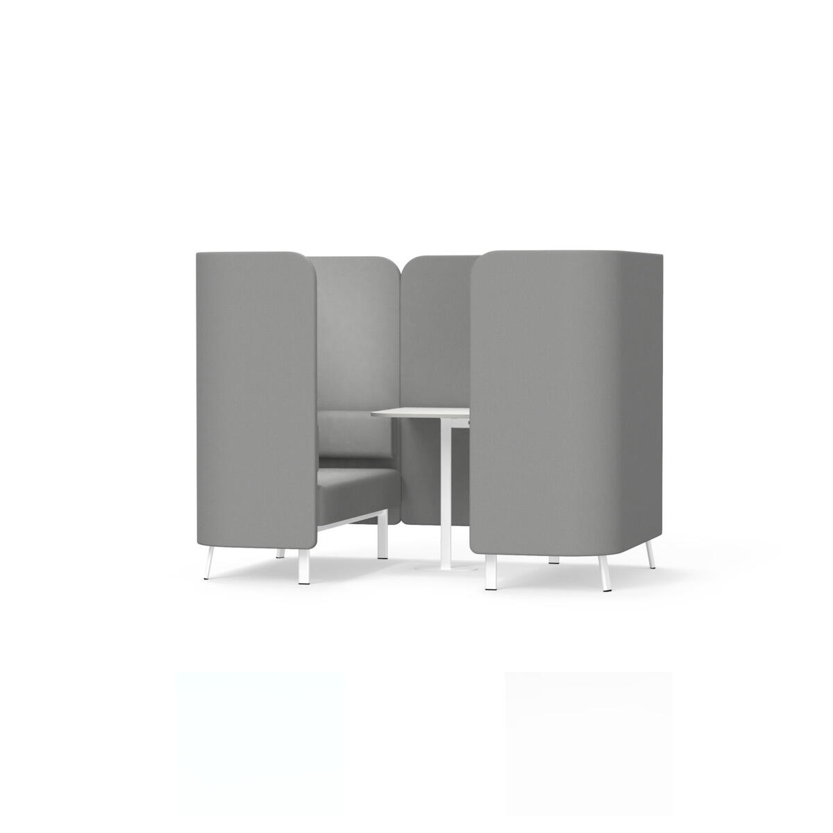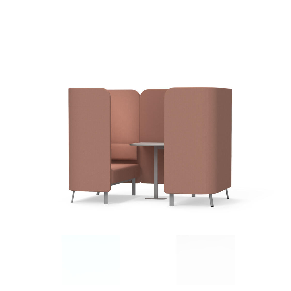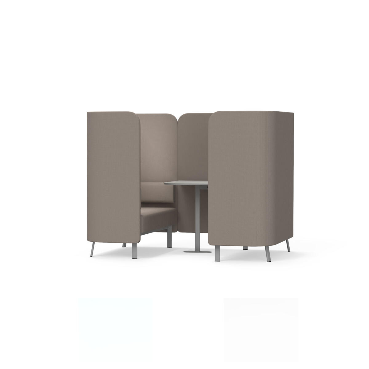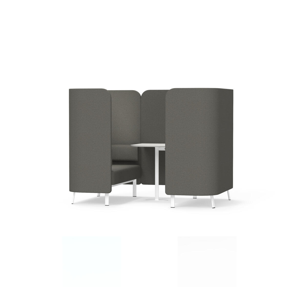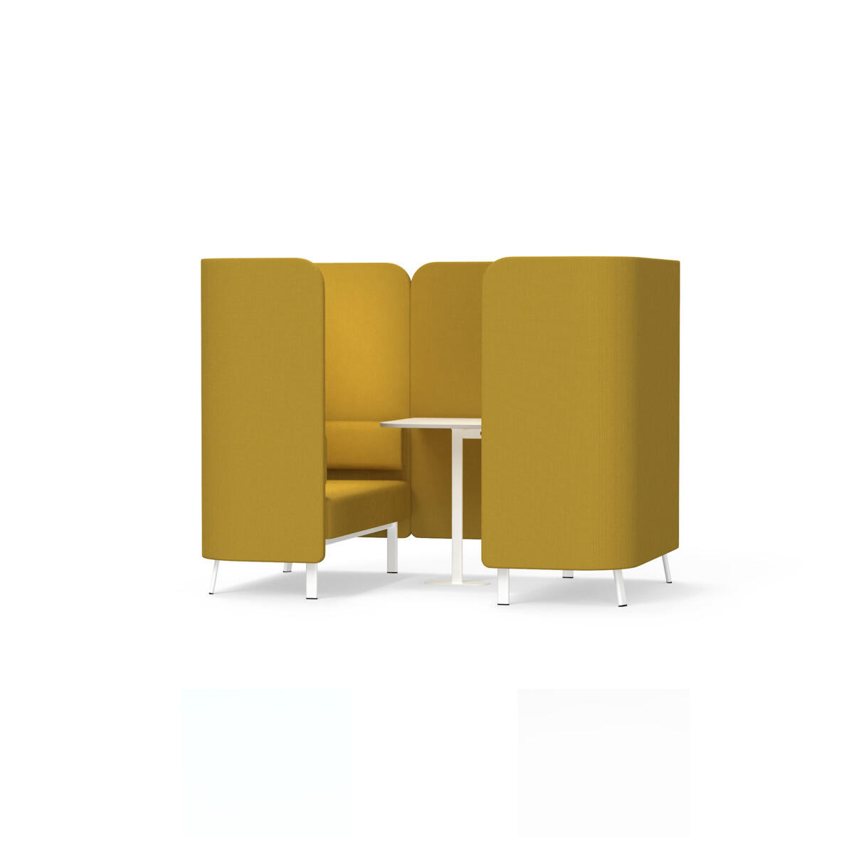 Omsluttende sofa som, takket være sine høye sider, har en lyddempende og avskjermende effekt, noe som gjør den egnet for for eksempel gruppemøter, samarbeid eller egentid i et dempet miljø. De høye veggene gir avskjerming fra resten av rommet. Bord med laminatplate L125×D64×H74 cm; fargen på bordplaten følger fargen på bena. Trestamme og stopping i kaldskum. Ben i pulverlakkert metall.