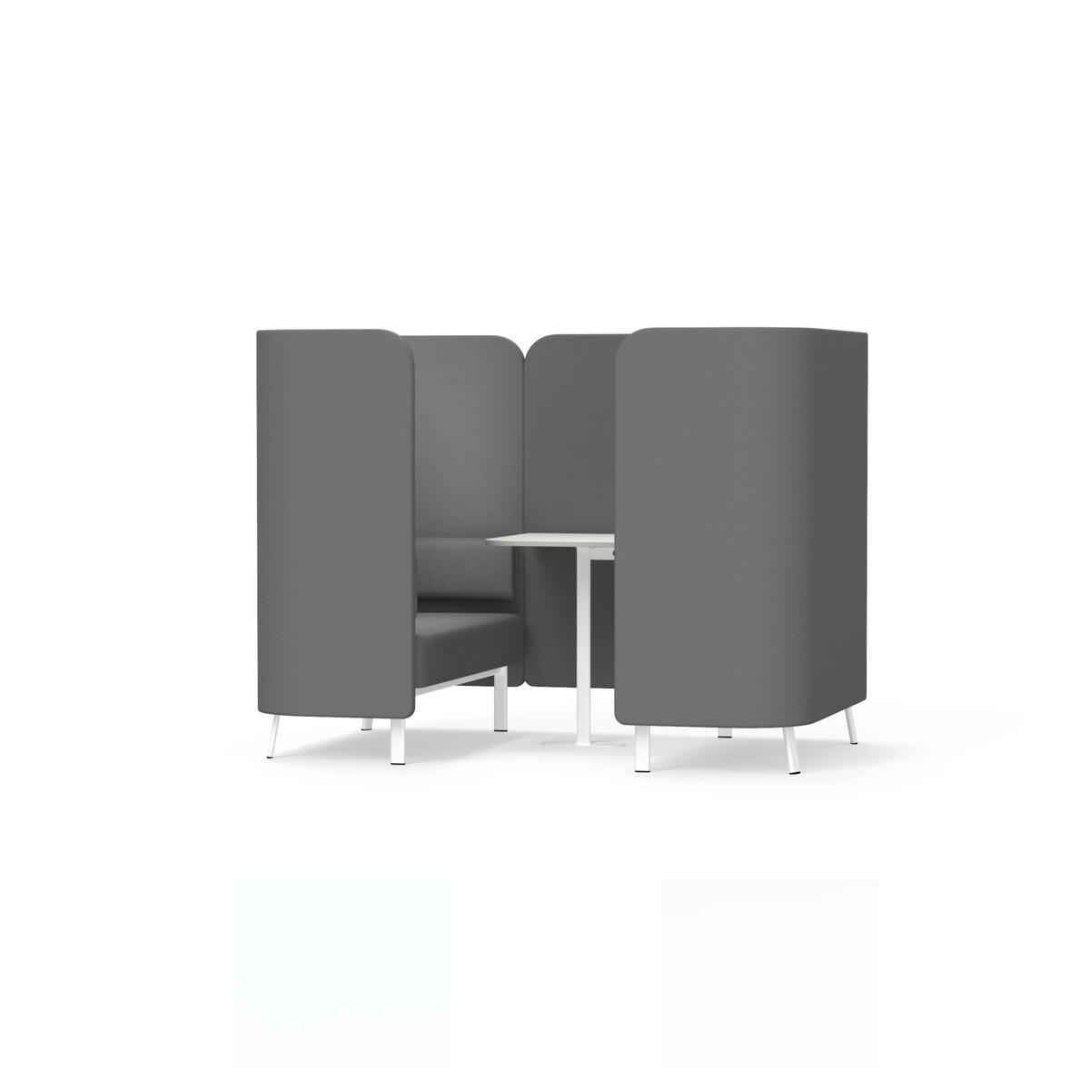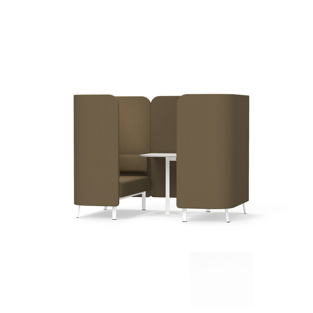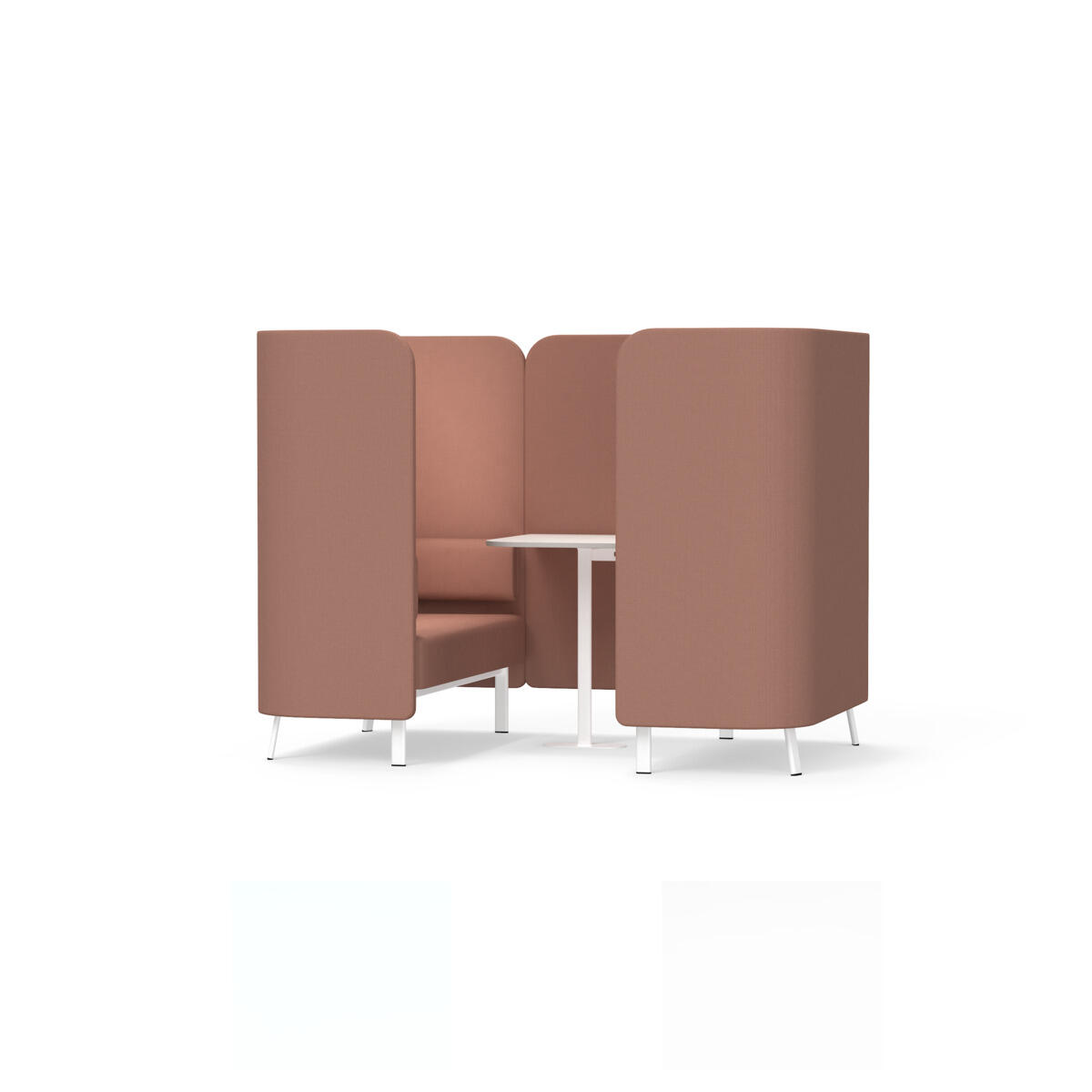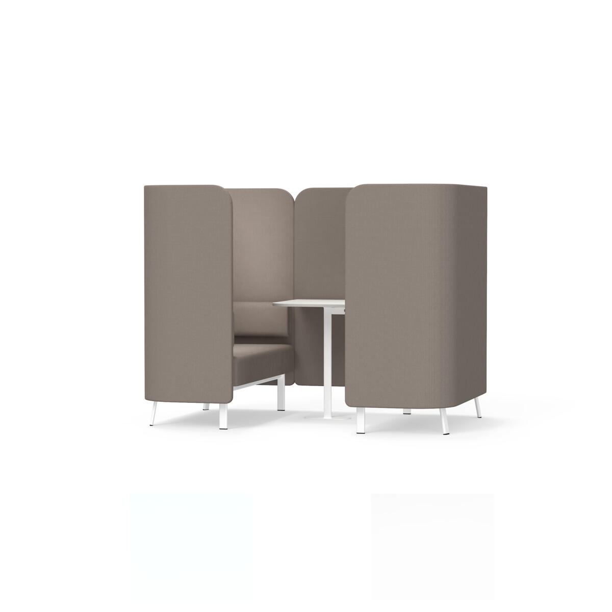 Omsluttende sofa som, takket være sine høye sider, har en lyddempende og avskjermende effekt, noe som gjør den egnet for for eksempel gruppemøter, samarbeid eller egentid i et dempet miljø. De høye veggene gir avskjerming fra resten av rommet. Bord med laminatplate L125×D64×H74 cm; fargen på bordplaten følger fargen på bena. Trestamme og stopping i kaldskum. Ben i pulverlakkert metall.