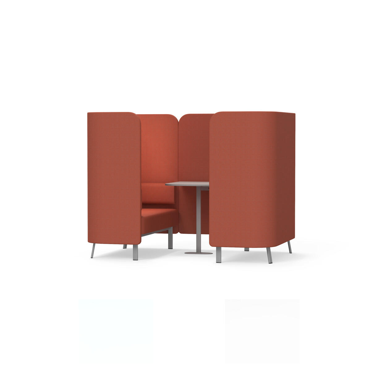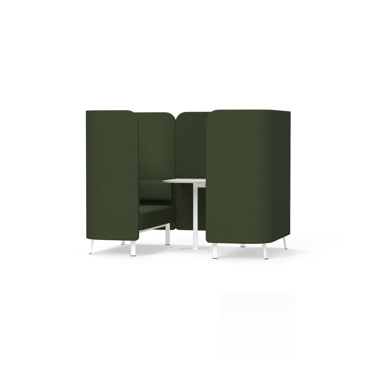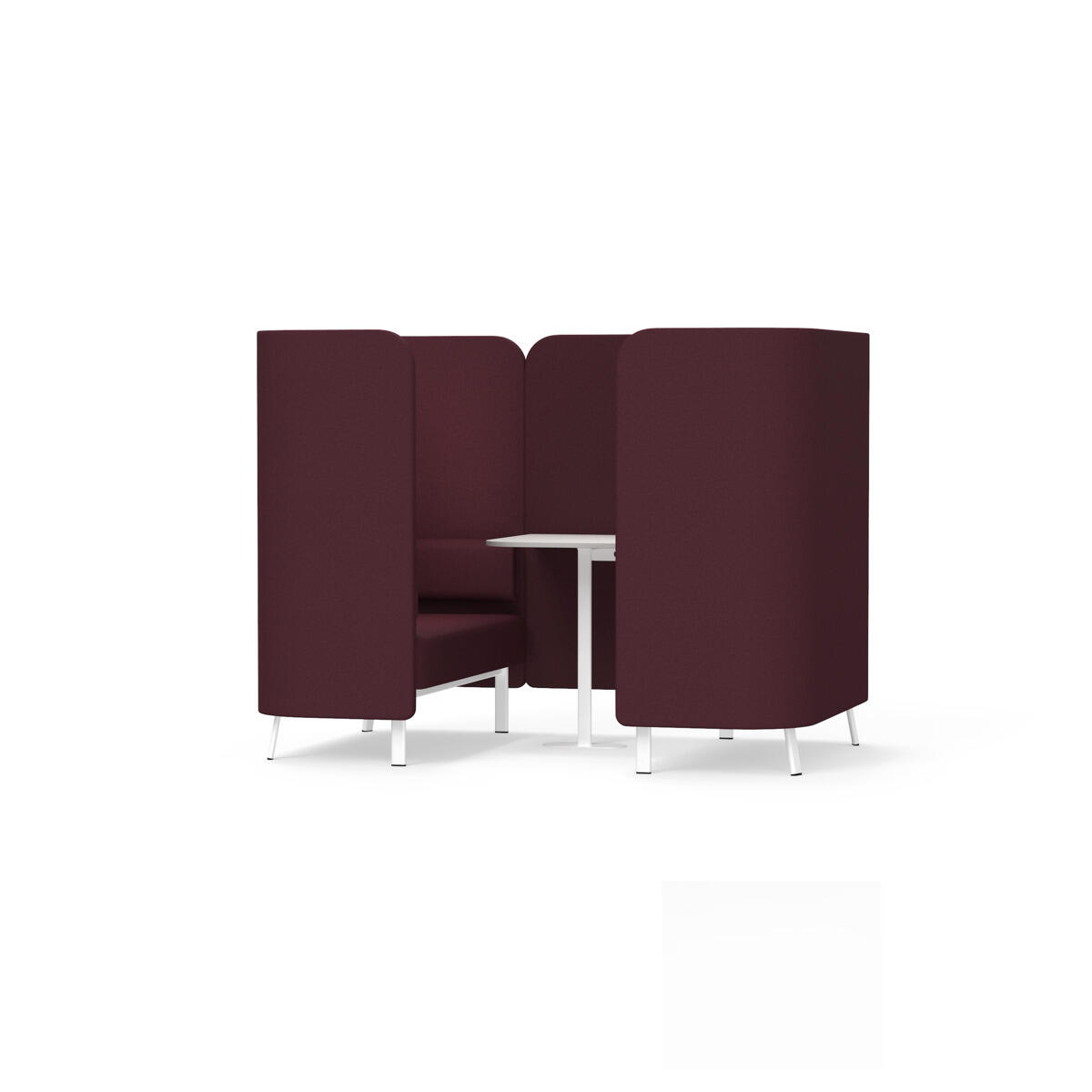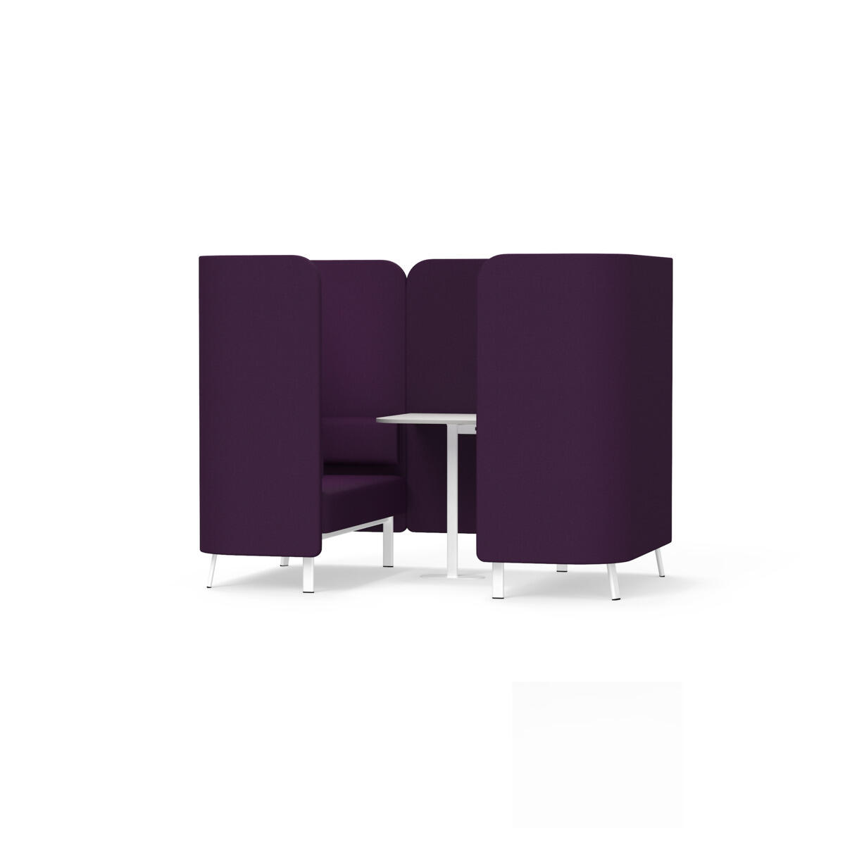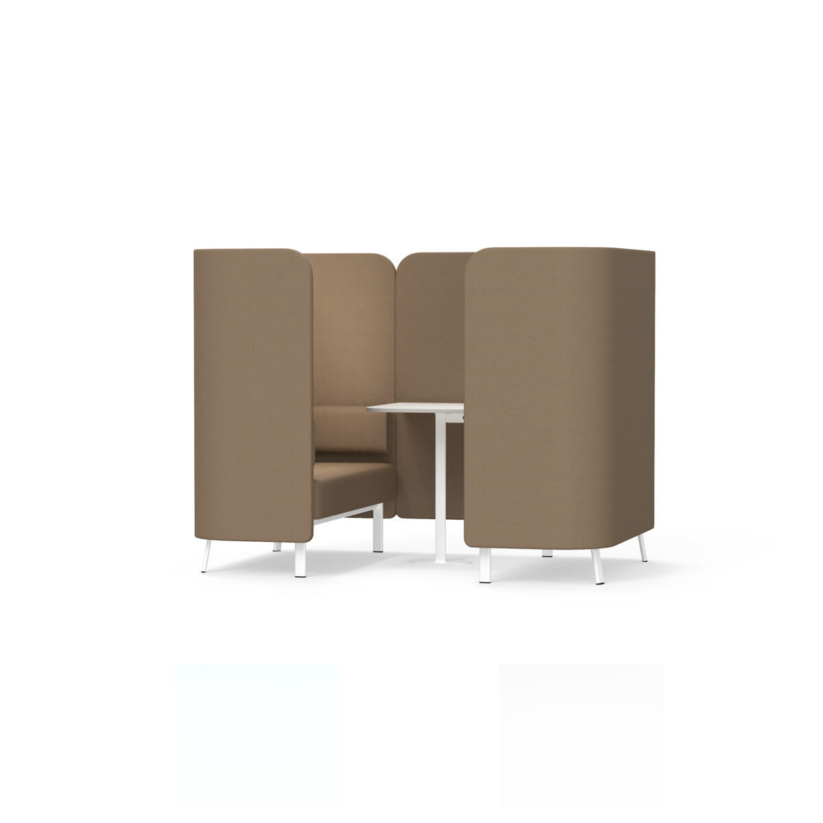 Omsluttende sofa som, takket være sine høye sider, har en lyddempende og avskjermende effekt, noe som gjør den egnet for for eksempel gruppemøter, samarbeid eller egentid i et dempet miljø. De høye veggene gir avskjerming fra resten av rommet. Bord med laminatplate L125×D64×H74 cm; fargen på bordplaten følger fargen på bena. Trestamme og stopping i kaldskum. Ben i pulverlakkert metall.