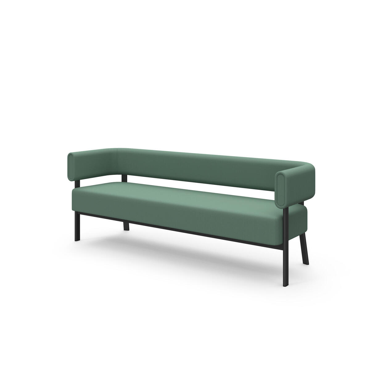 Omsluttende sofa som, takket være sine høye sider, har en lyddempende og avskjermende effekt, noe som gjør den egnet for for eksempel gruppemøter, samarbeid eller egentid i et dempet miljø. De høye veggene gir avskjerming fra resten av rommet. Bord med laminatplate L125×D64×H74 cm; fargen på bordplaten følger fargen på bena. Trestamme og stopping i kaldskum. Ben i pulverlakkert metall.