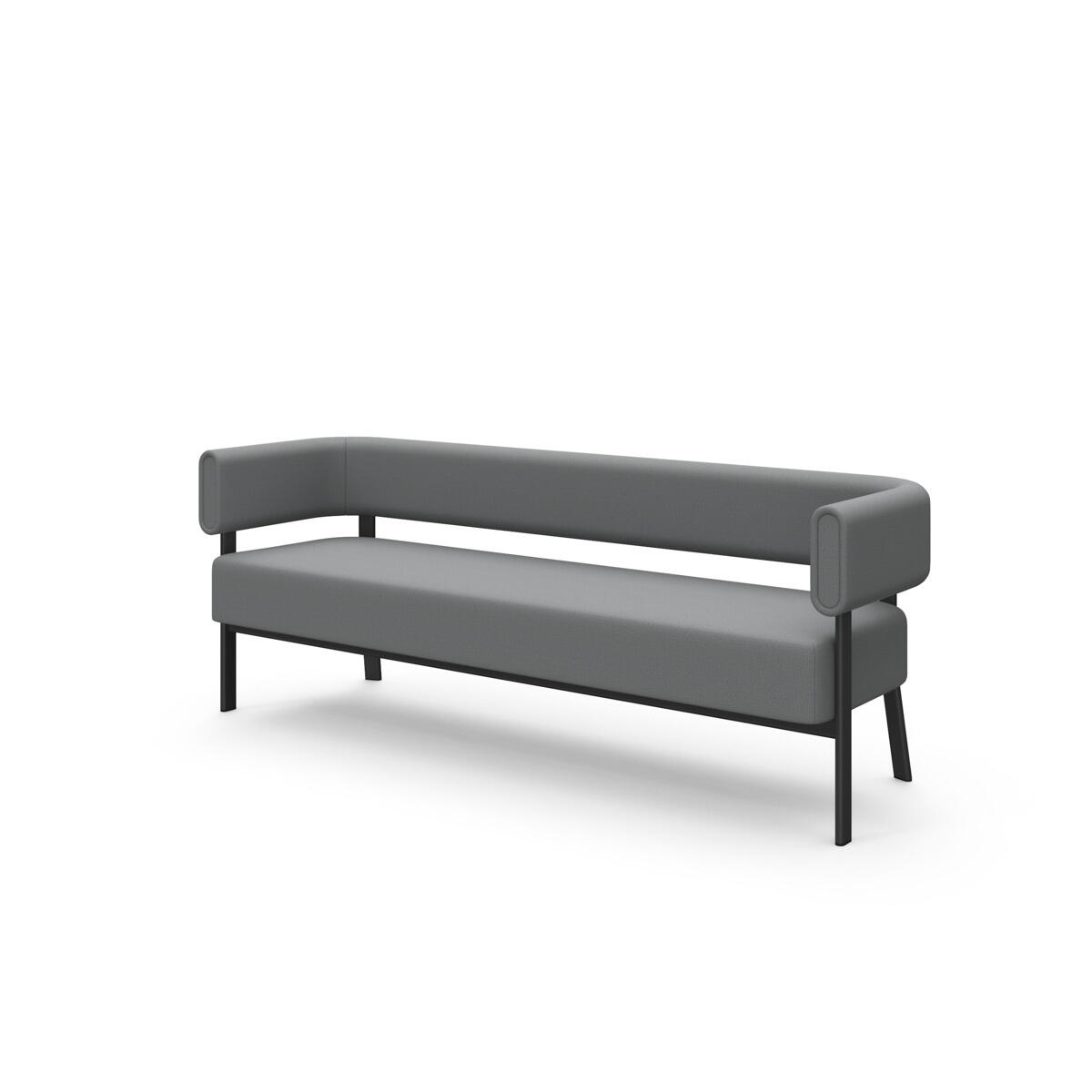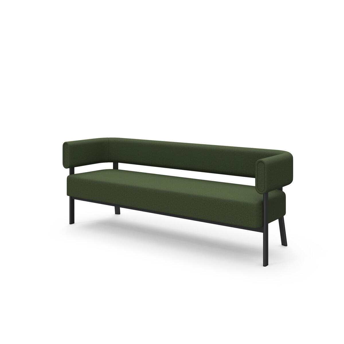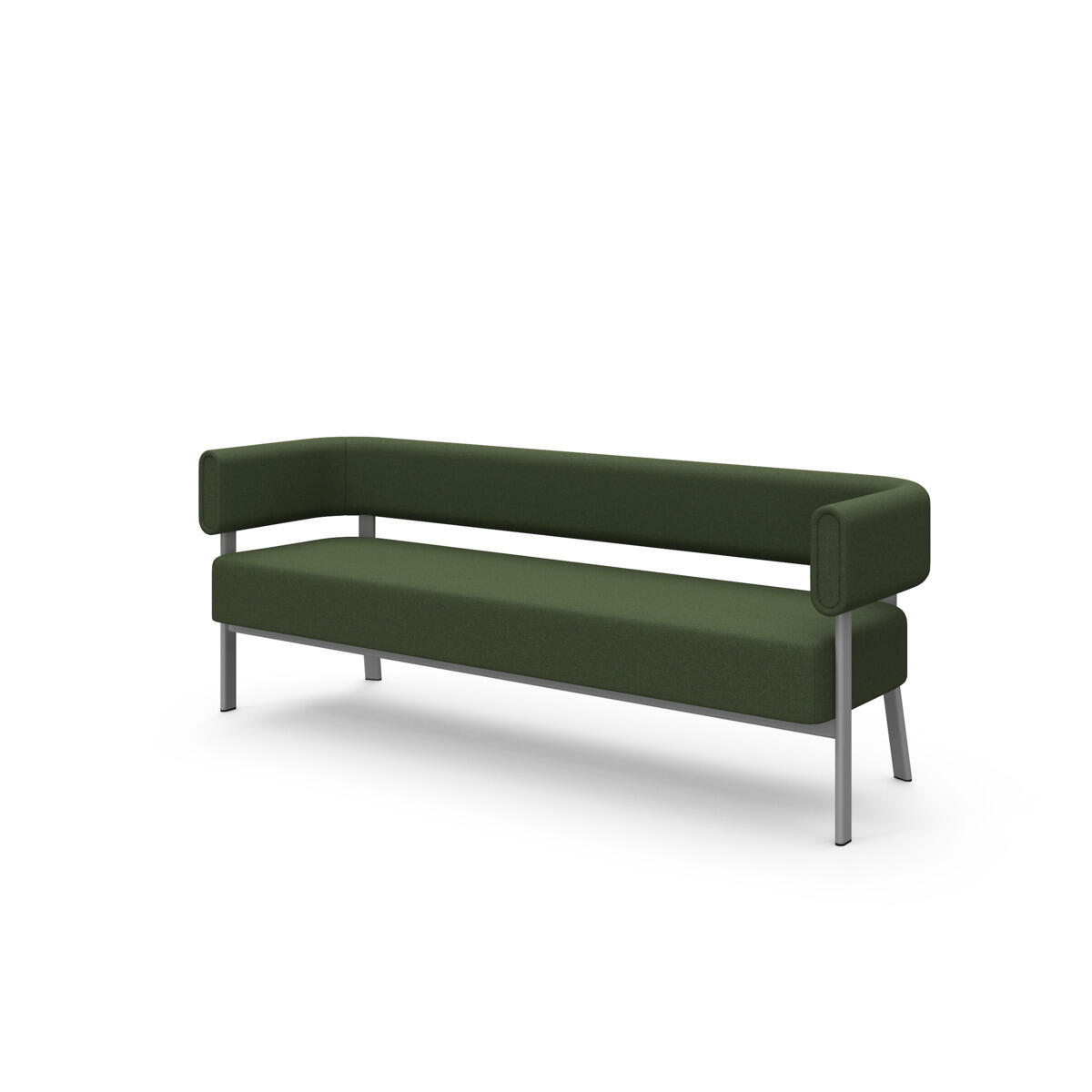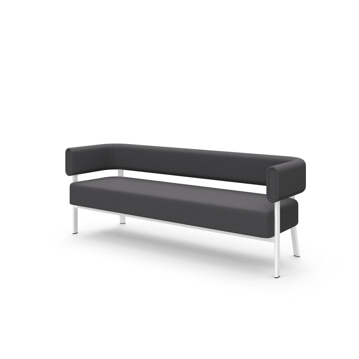Den høye ryggen og de høye gavlene skjermer av og demper lyd effektivt. Trestamme og stopping i kaldskum. Ben i pulverlakkert metall. Som tilbehør finnes sidebord som enkelt monteres i rammen.