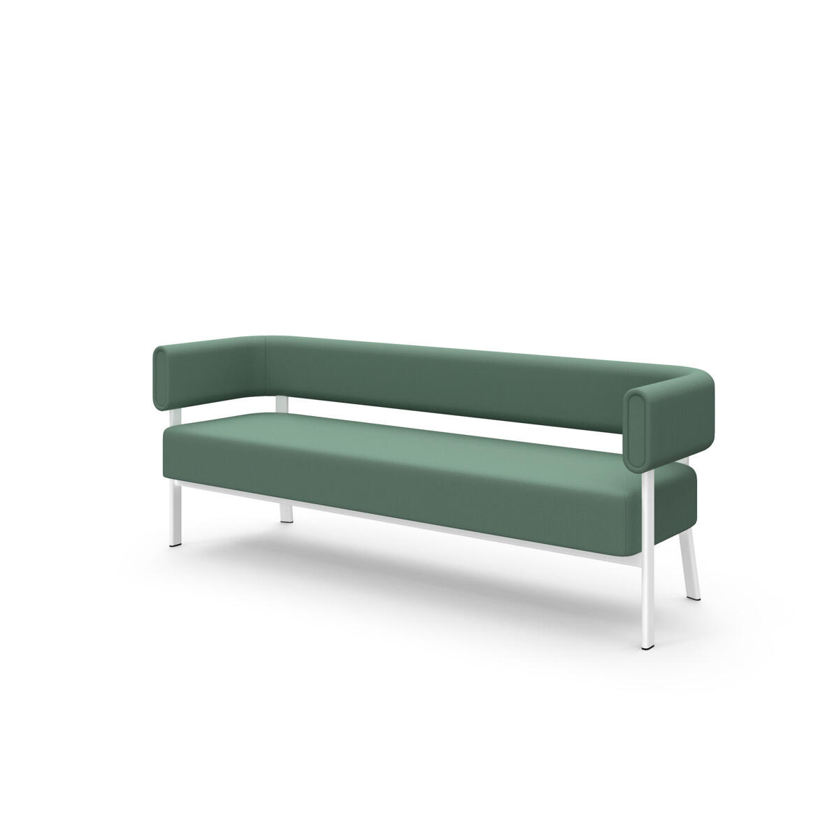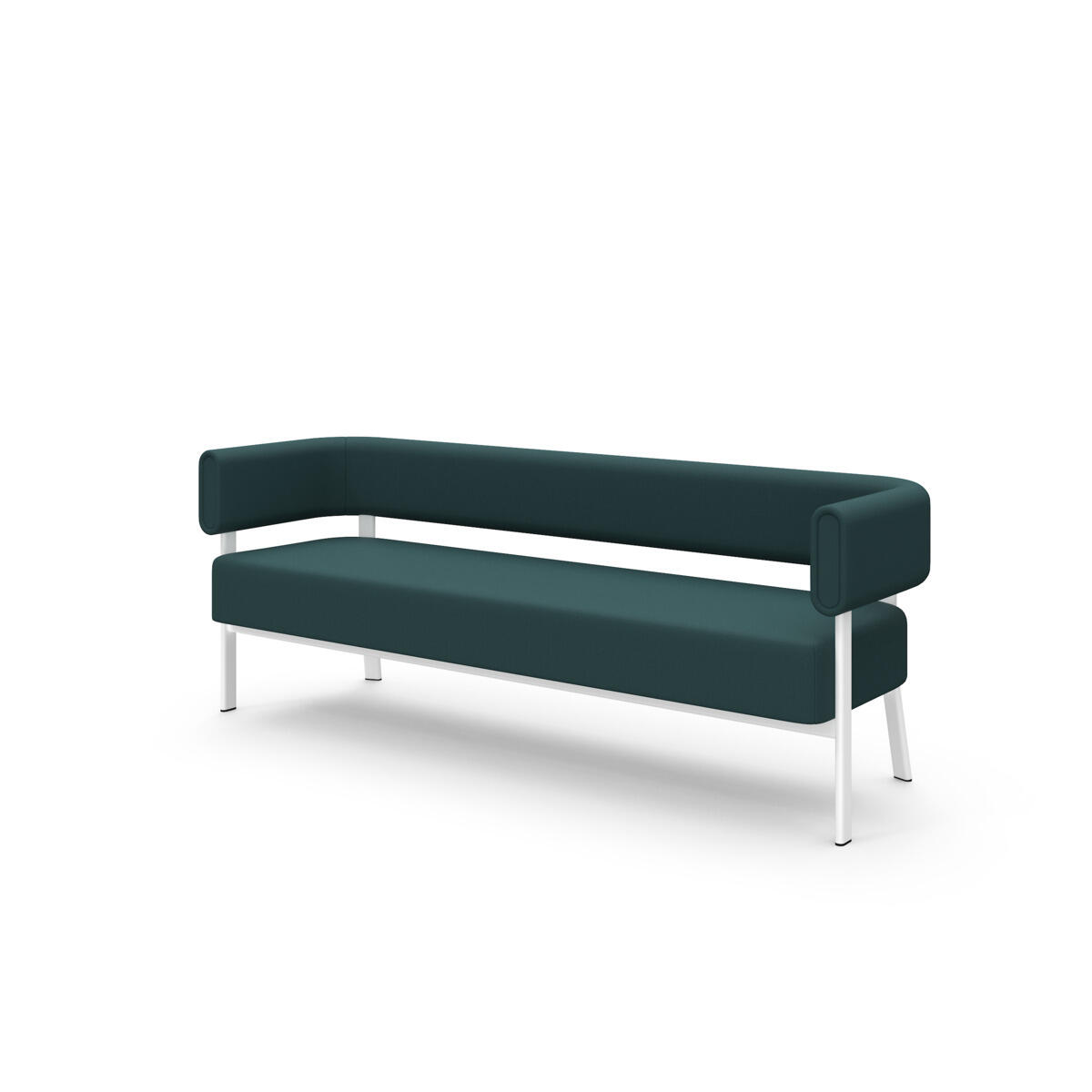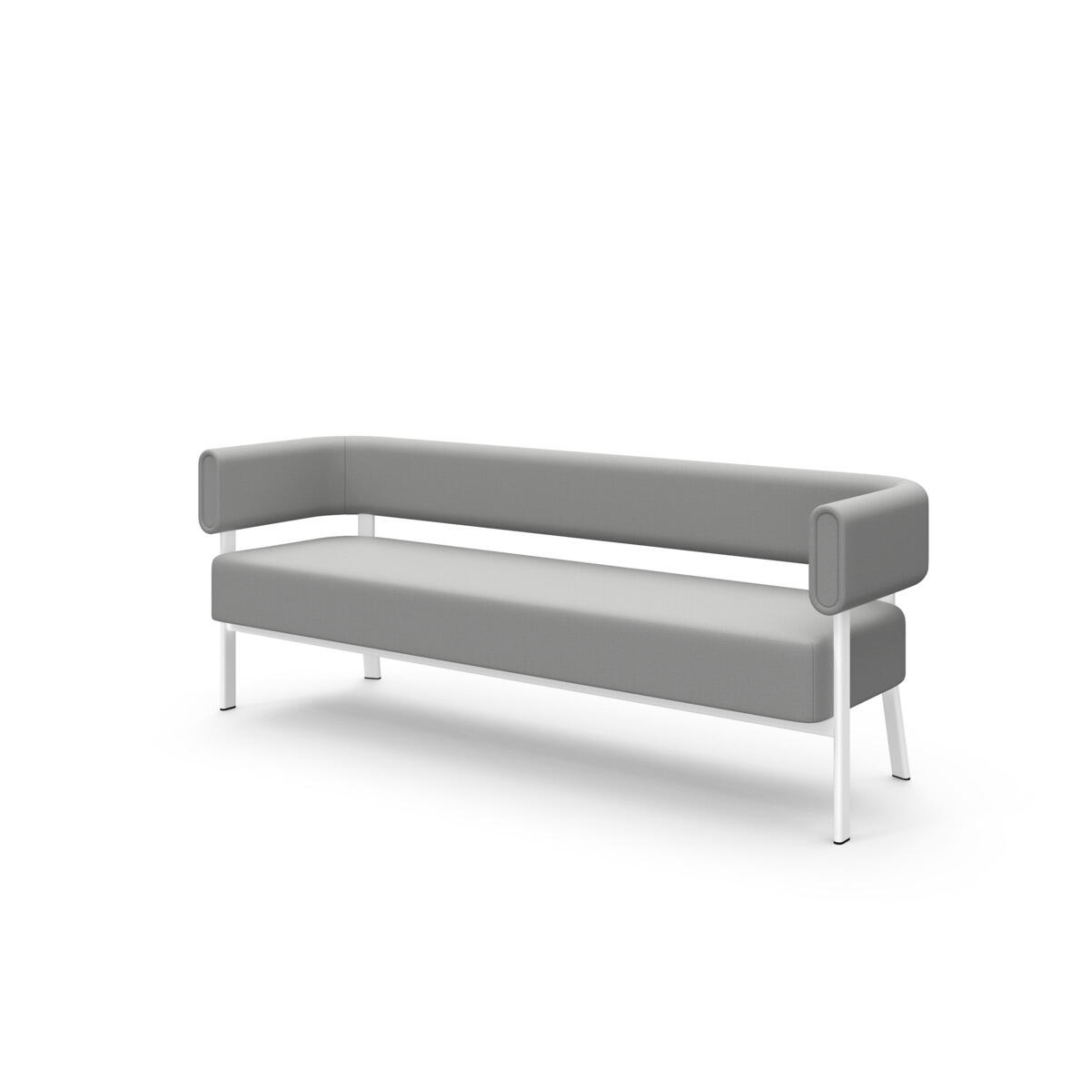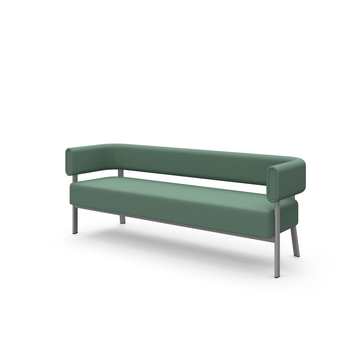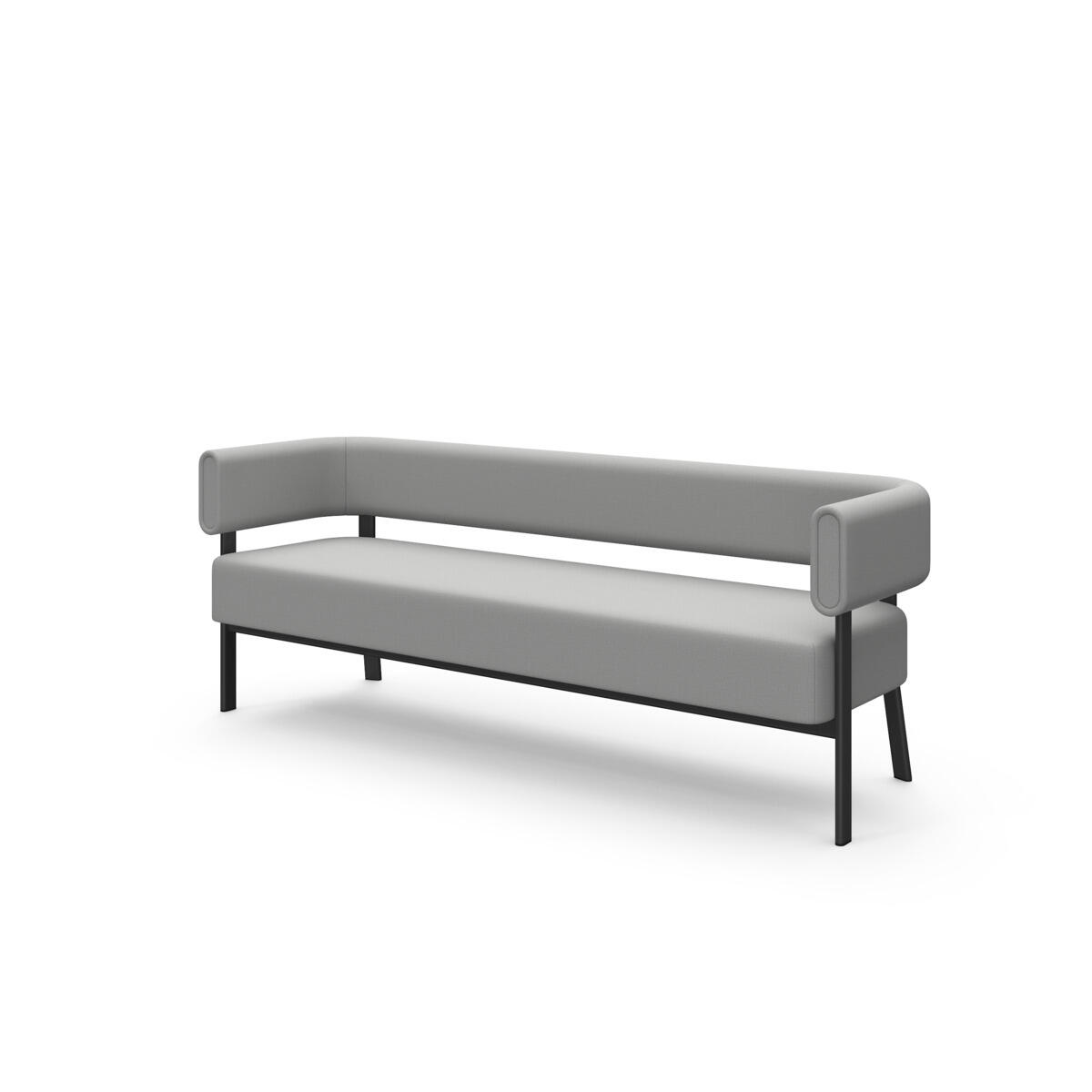Den høye ryggen og de høye gavlene skjermer av og demper lyd effektivt. Trestamme og stopping i kaldskum. Ben i pulverlakkert metall. Som tilbehør finnes sidebord som enkelt monteres i rammen.
