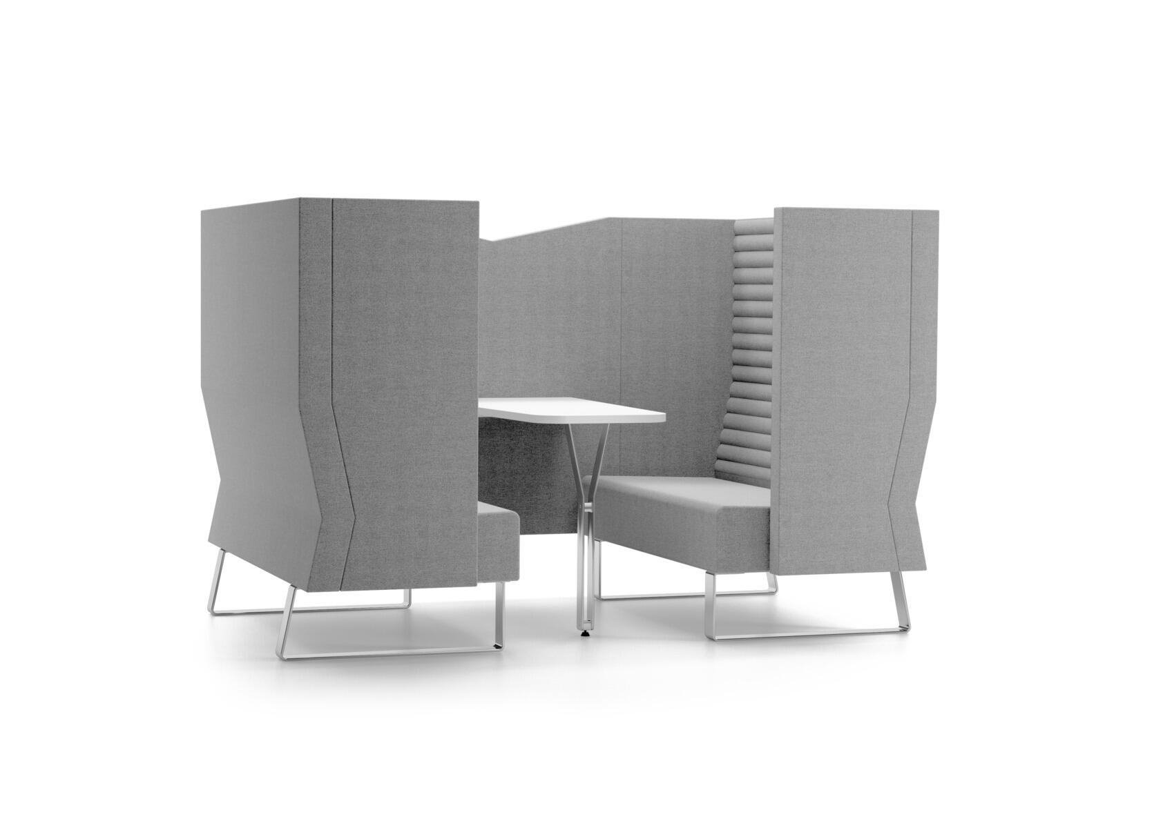 Omsluttende sofa med høye sider som har en lydabsorberende og skjermende effekt og jør den egnet til for eksempel gruppemøter, samarbeidsoppgaver eller privat tid i et dempet miljø. De høye veggene gir avskjerming fra resten av rommet, og demper ikke bare lyder utenfra, men også fra innsiden og ut. Inkl. bord med hvit laminatplate 120x60/40 cm. Treramme og polstring av kaldskum. Pulverlakkert understell i metall. Valg av farger på rygg og midtvegg. Gavler og sete alltid grå i det valgte stoffet. Strømuttak i bordplaten finnes som tilvalg.