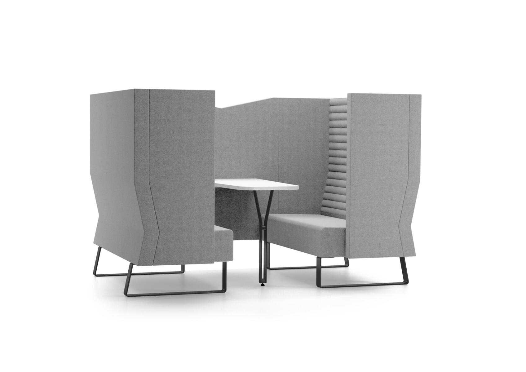 Omsluttende sofa med høye sider som har en lydabsorberende og skjermende effekt og jør den egnet til for eksempel gruppemøter, samarbeidsoppgaver eller privat tid i et dempet miljø. De høye veggene gir avskjerming fra resten av rommet, og demper ikke bare lyder utenfra, men også fra innsiden og ut. Inkl. bord med hvit laminatplate 120x60/40 cm. Treramme og polstring av kaldskum. Pulverlakkert understell i metall. Valg av farger på rygg og midtvegg. Gavler og sete alltid grå i det valgte stoffet. Strømuttak i bordplaten finnes som tilvalg.