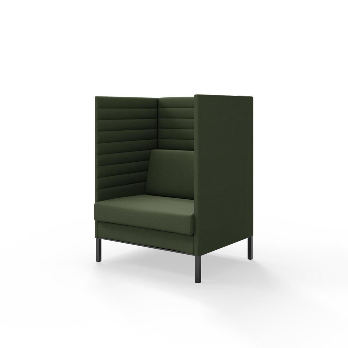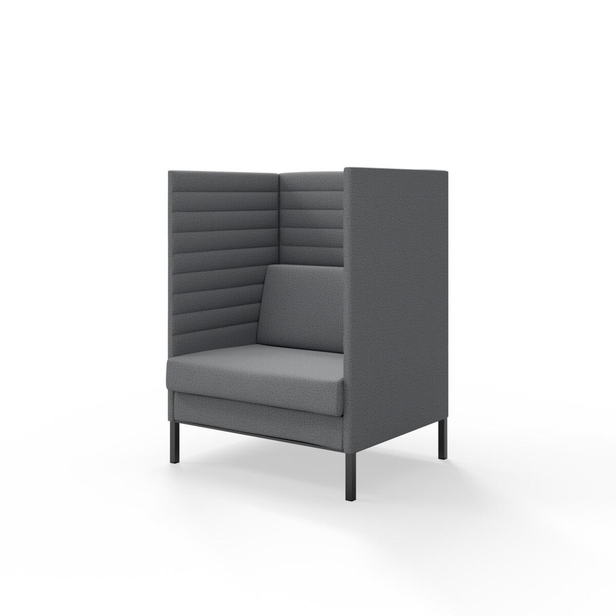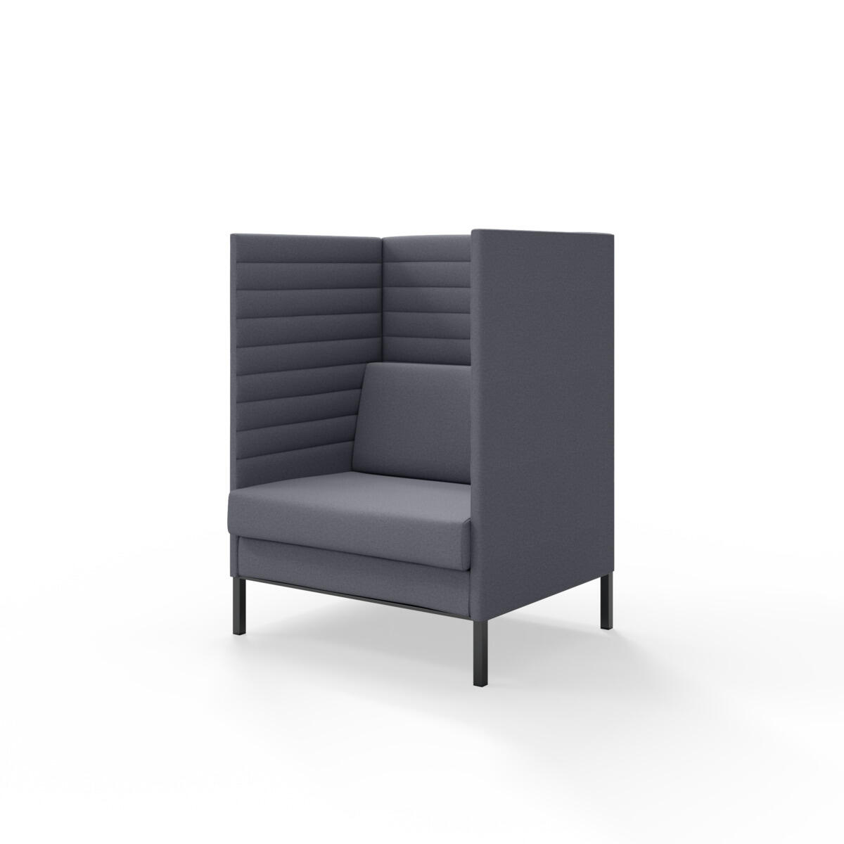 Den høye ryggen og de høye sidene skjermer og demper lyden effektivt. Treramme med nozag-base og polstring av kaldskum. Understell i pulverlakkert metall. Avtakbart trekk på rygg- og sittepute.