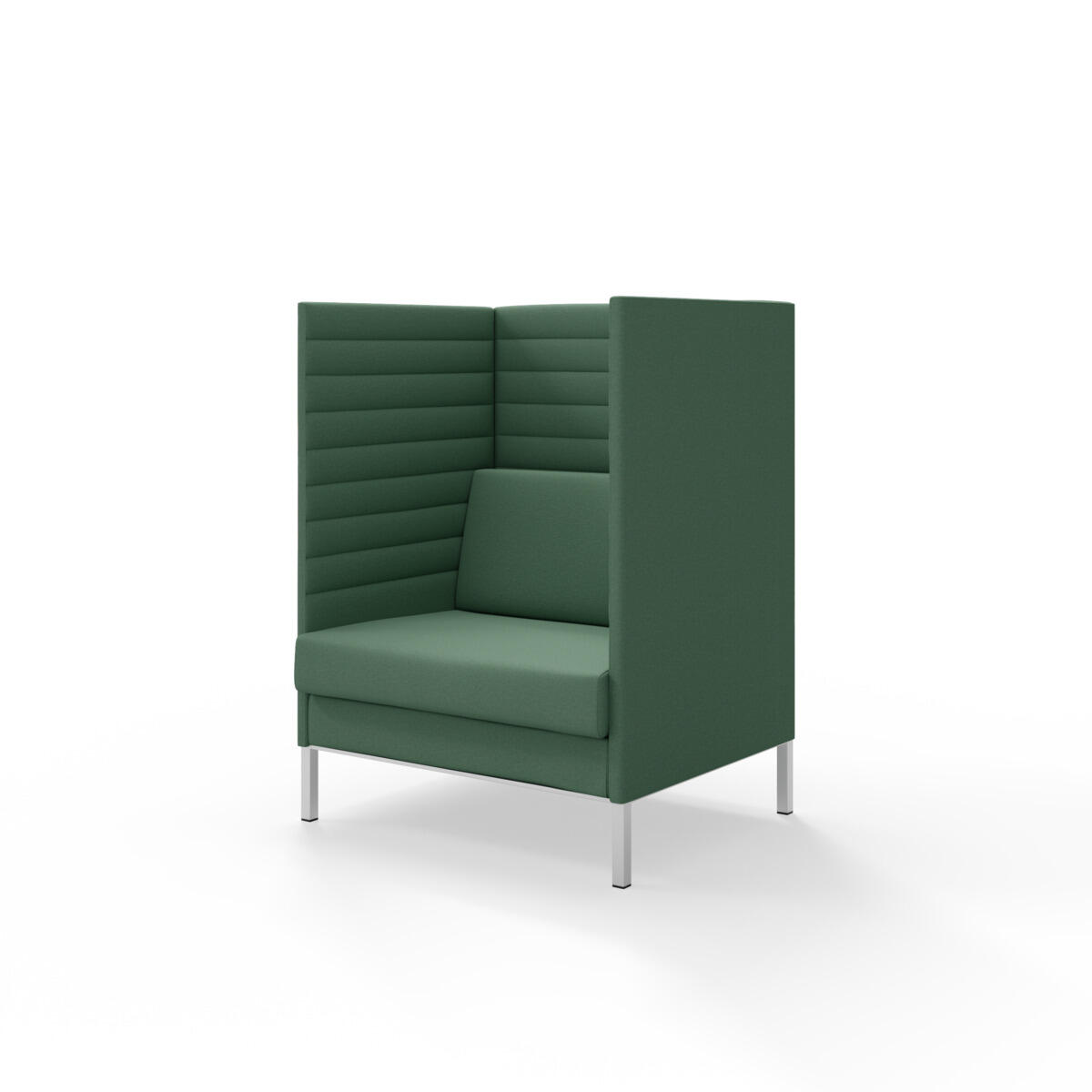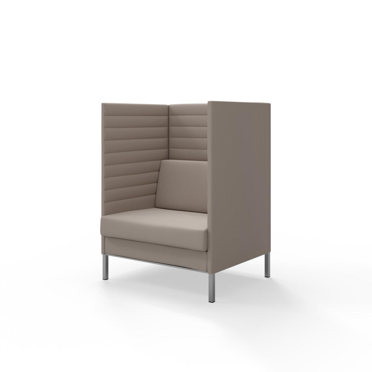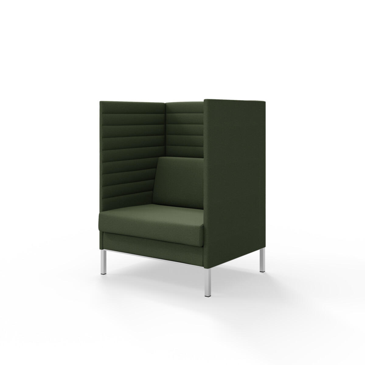 Den høye ryggen og de høye sidene skjermer og demper lyden effektivt. Treramme med nozag-base og polstring av kaldskum. Understell i pulverlakkert metall. Avtakbart trekk på rygg- og sittepute.