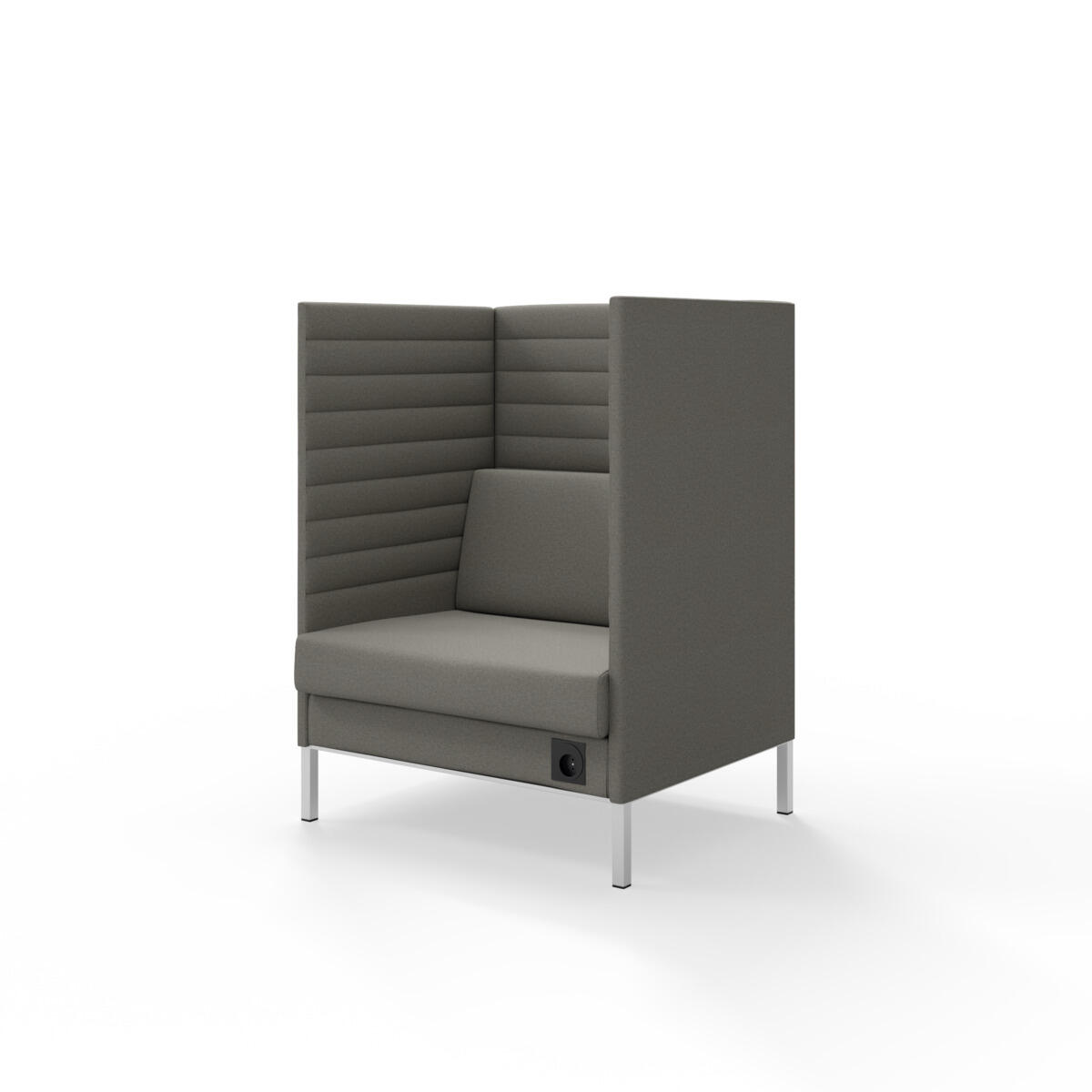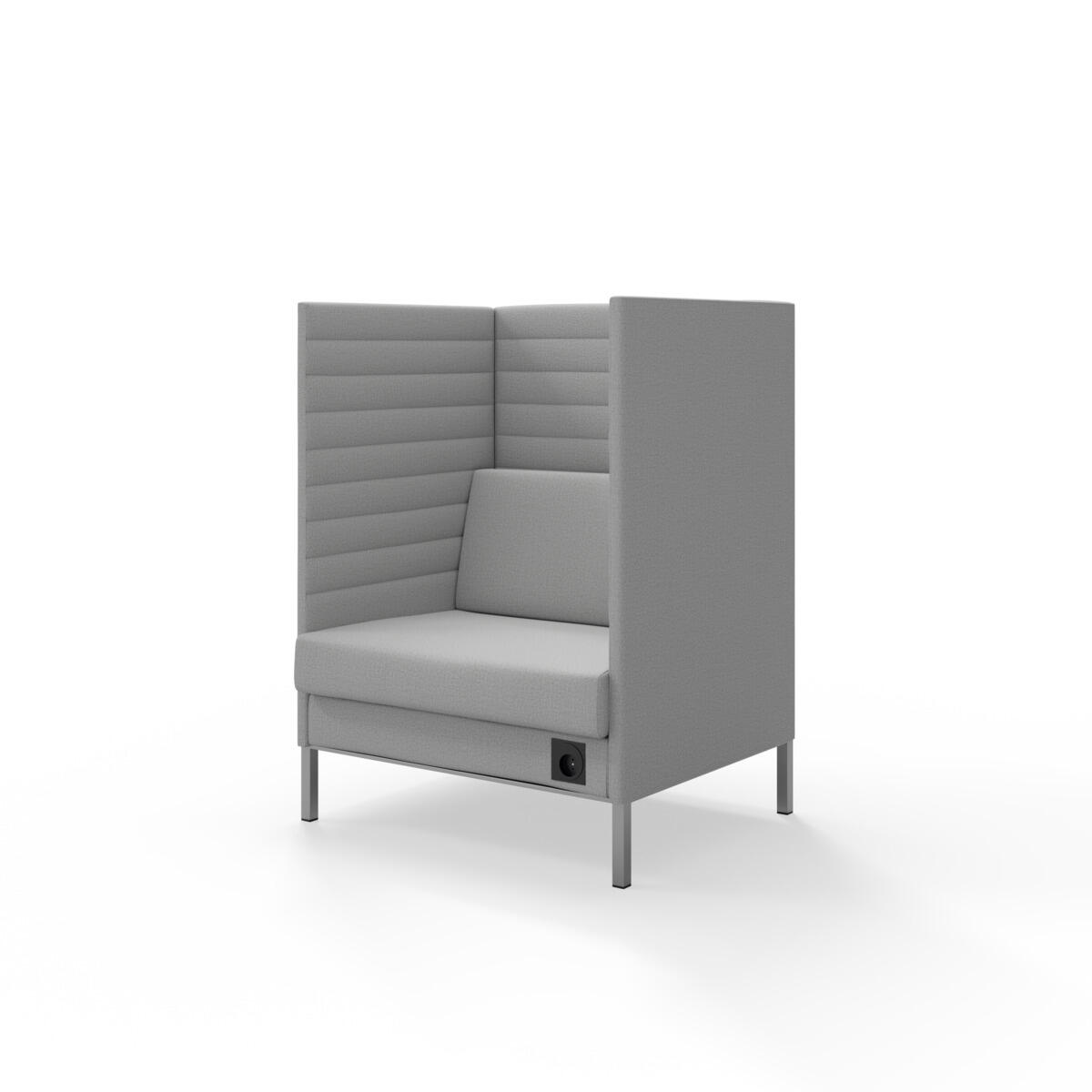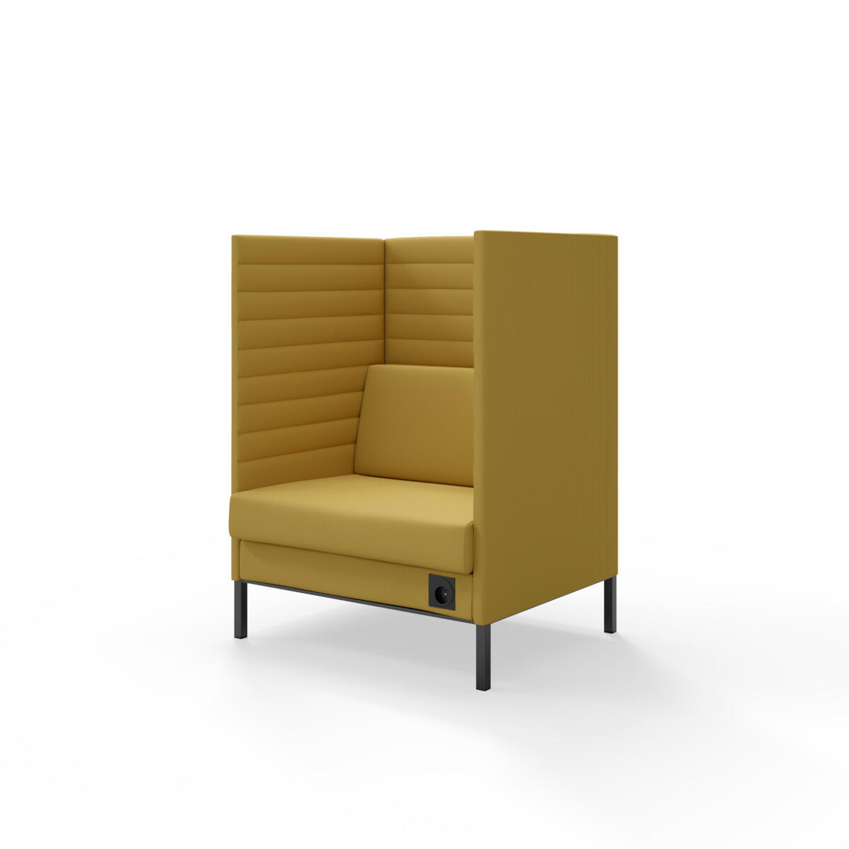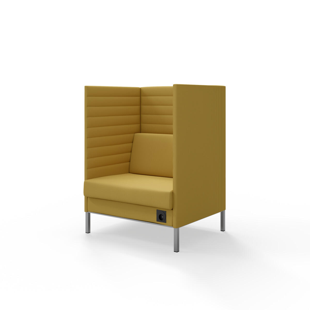 Den høye ryggen og de høye sidene skjermer og demper lyden effektivt. Treramme med nozag-base og polstring av kaldskum. Understell i pulverlakkert metall. Uttak for strøm inkludert. Avtakbart trekk på rygg- og sittepute.