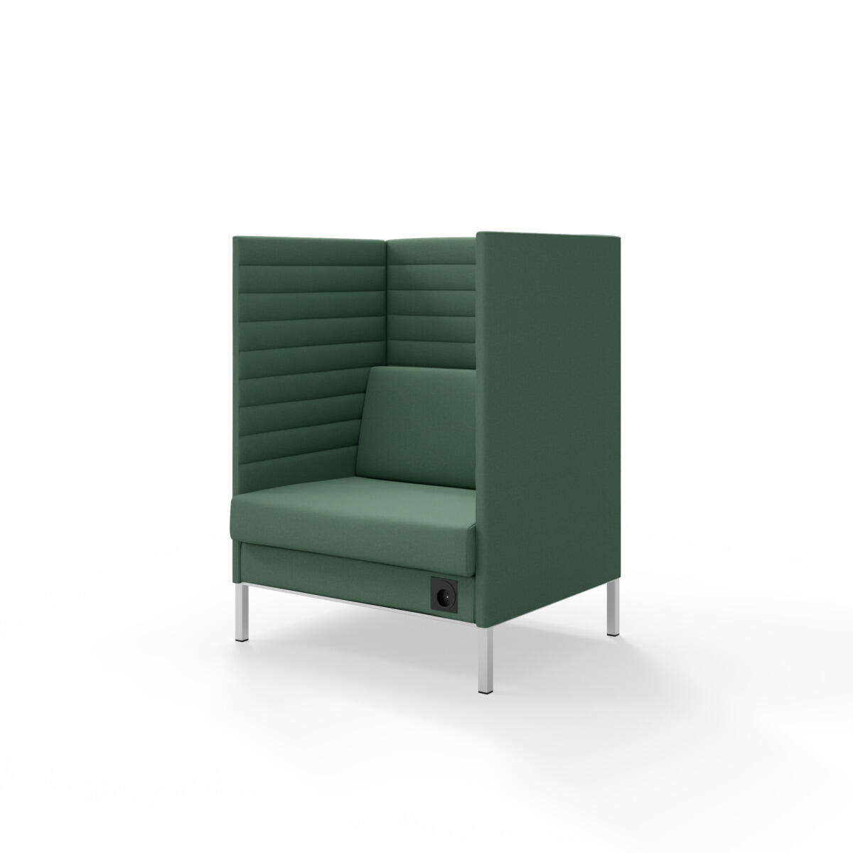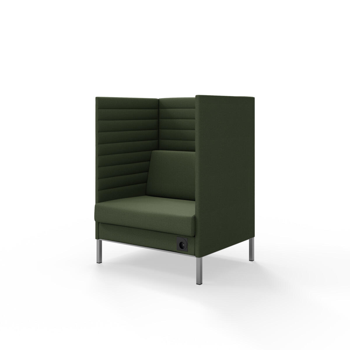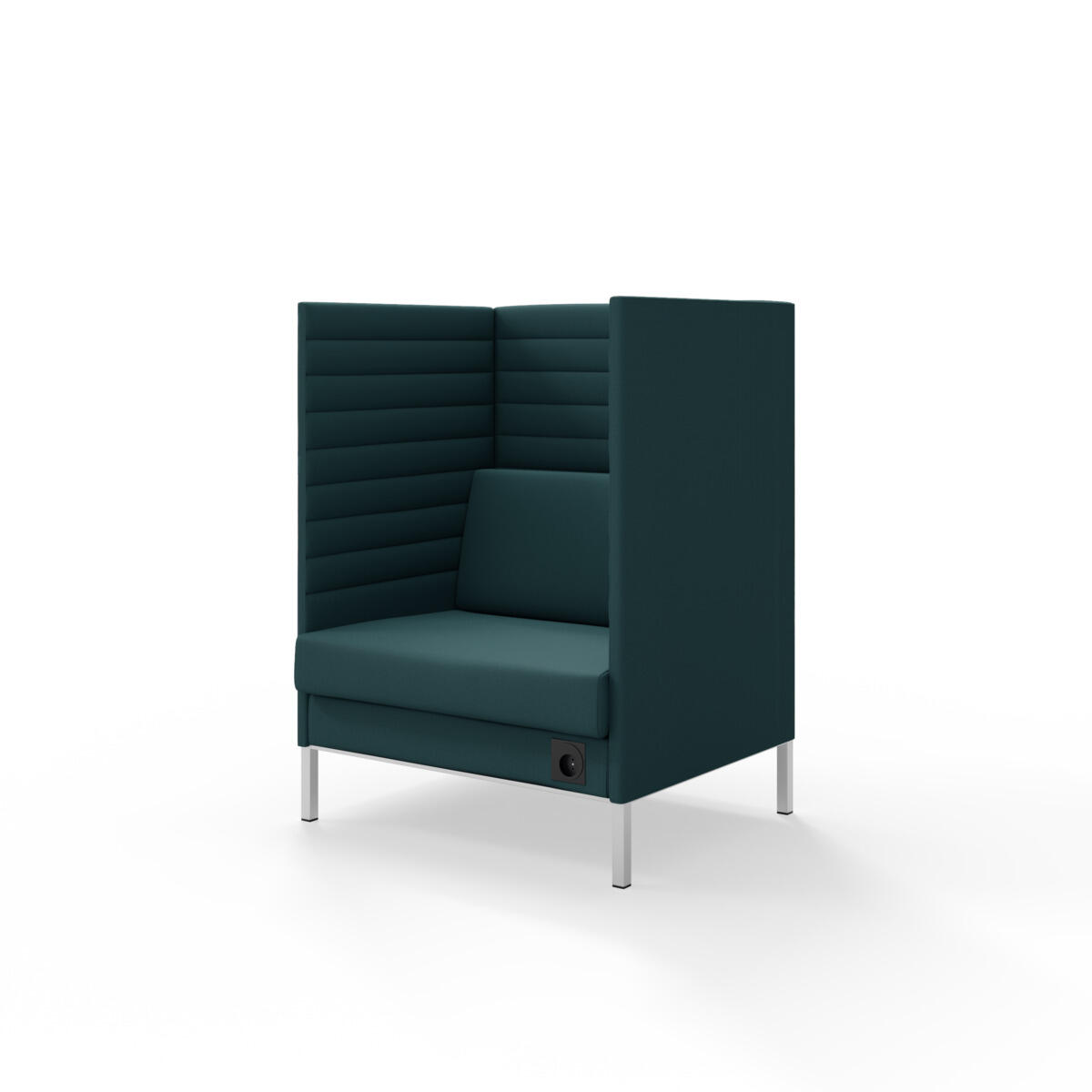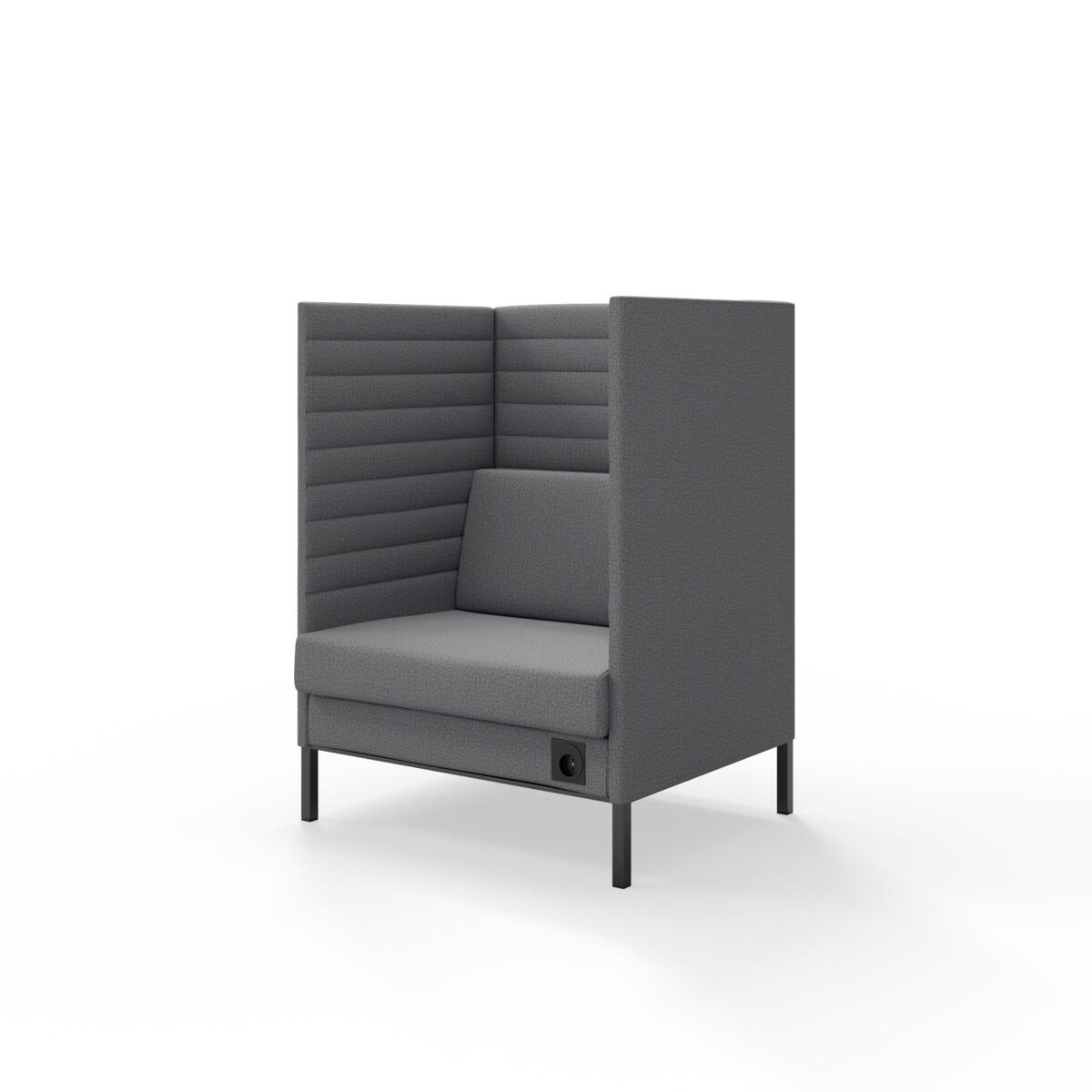 Den høye ryggen og de høye sidene skjermer og demper lyden effektivt. Treramme med nozag-base og polstring av kaldskum. Understell i pulverlakkert metall. Uttak for strøm inkludert. Avtakbart trekk på rygg- og sittepute.