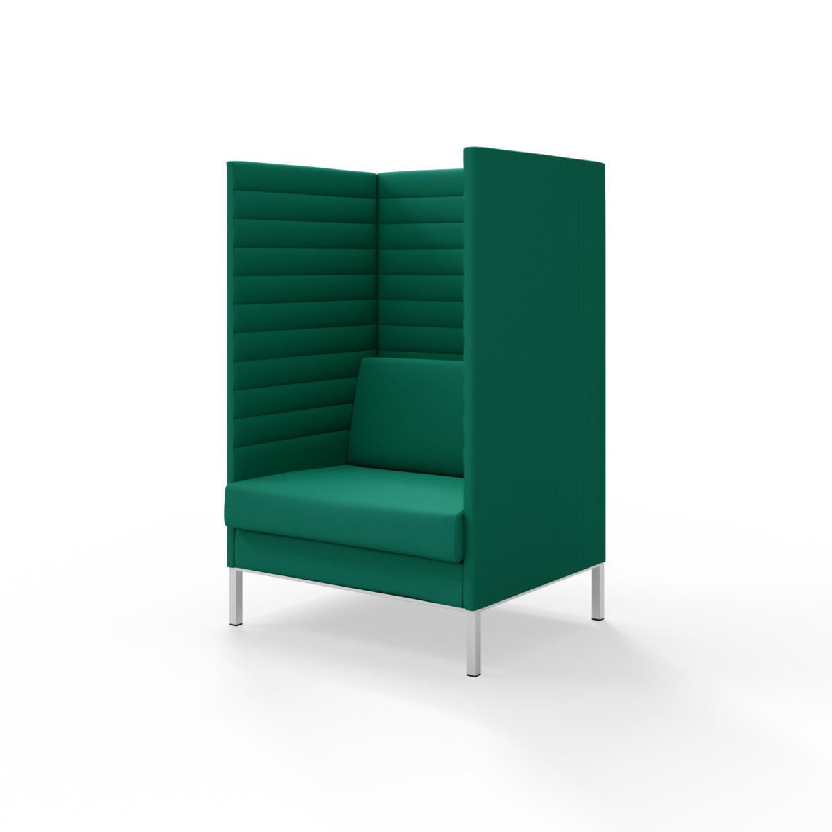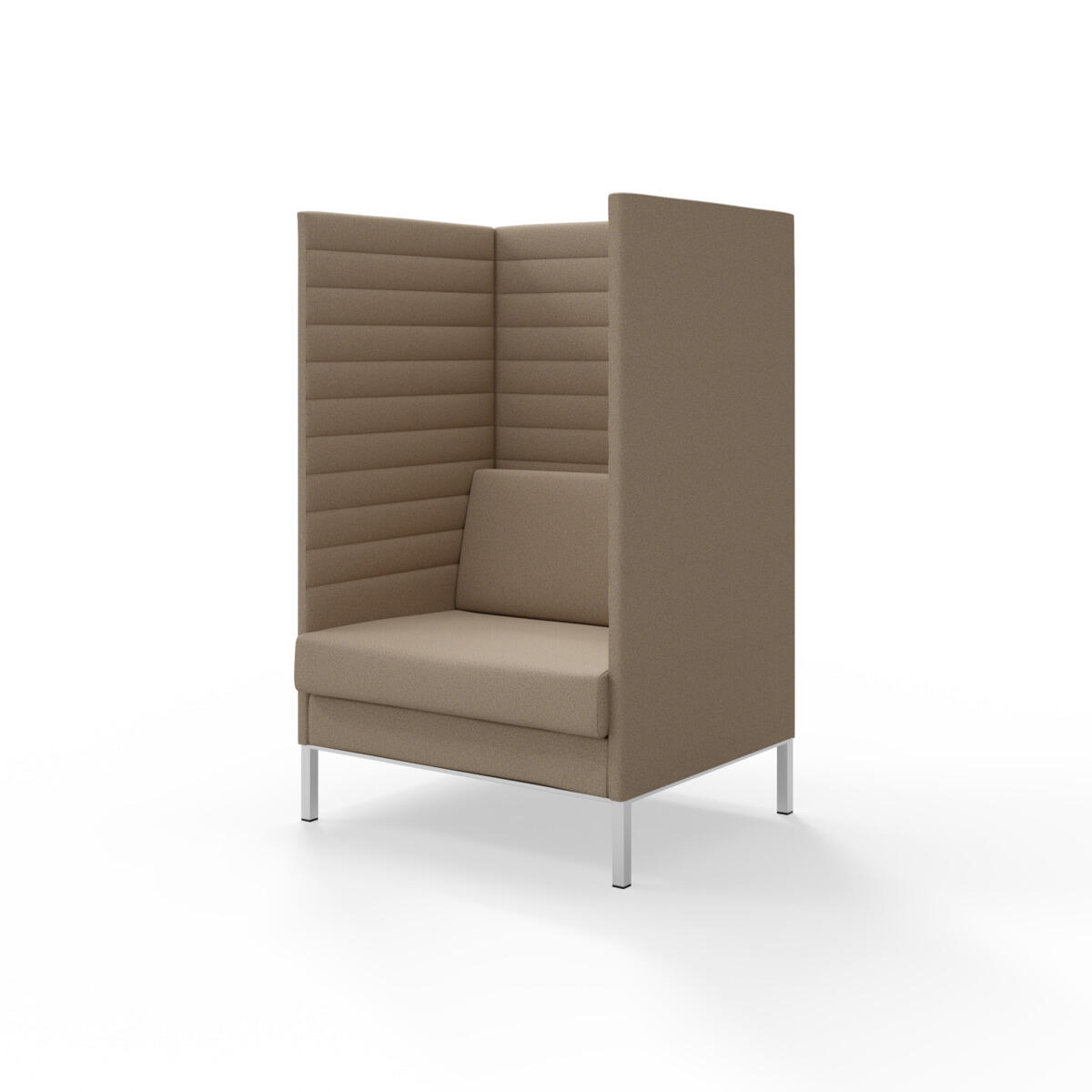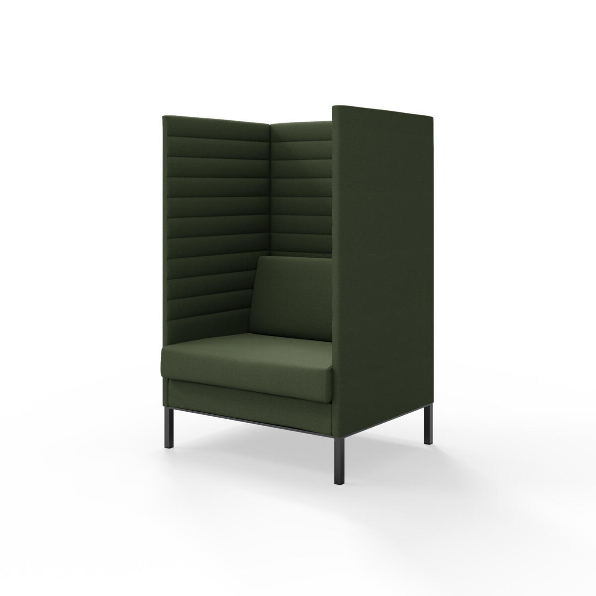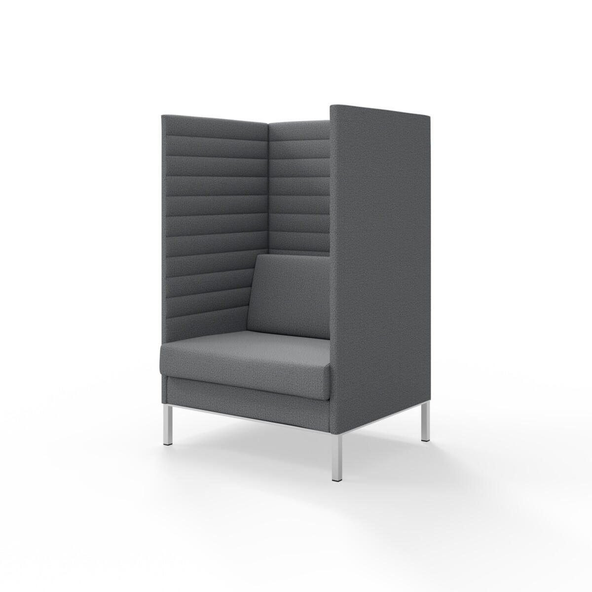 Den høye ryggen og de høye sidene skjermer og demper lyden effektivt. Treramme med nozag-base og polstring av kaldskum. Understell i pulverlakkert metall. Avtakbart trekk på rygg- og sittepute.